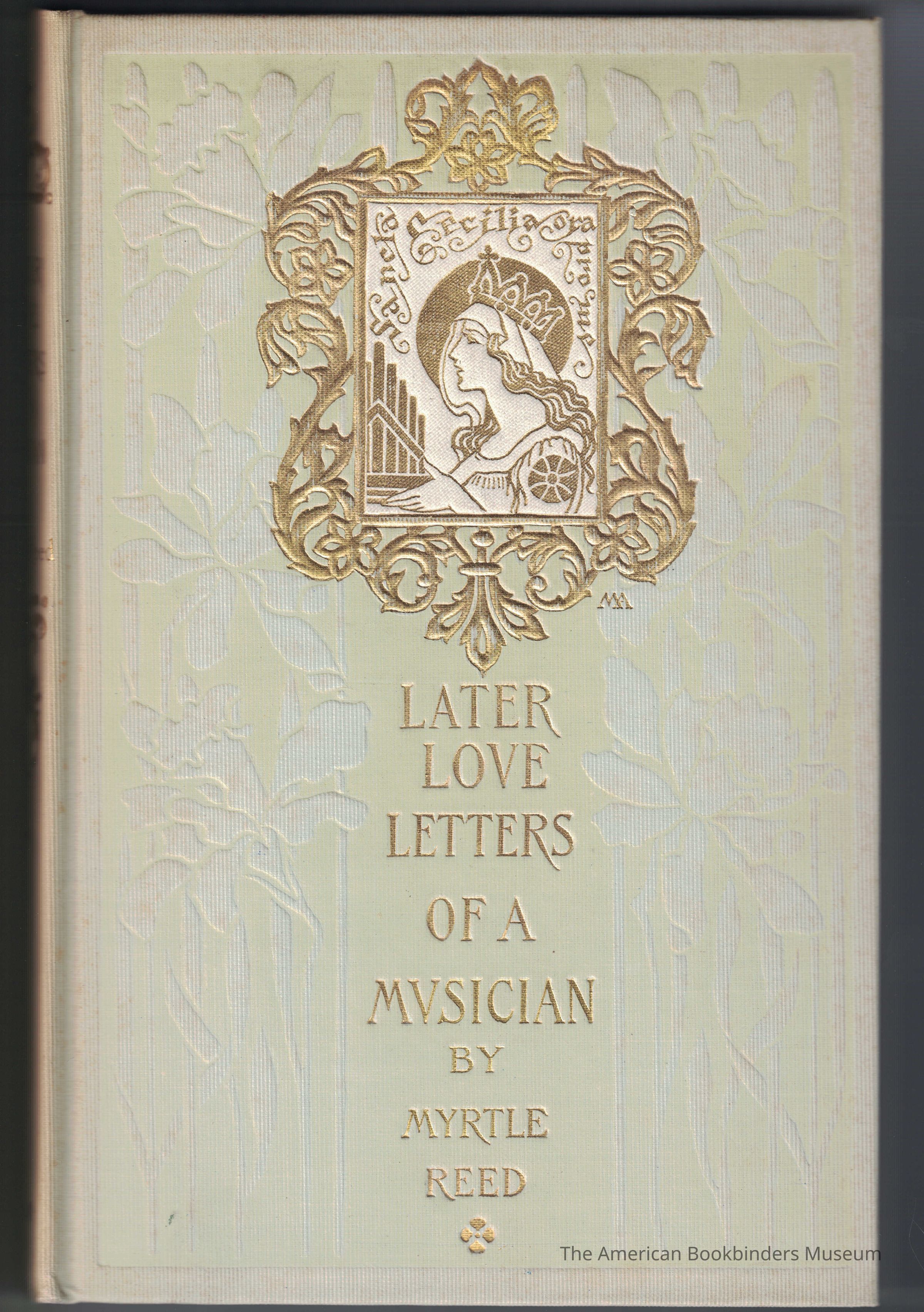 Bound in pale grey cloth with elaborate gilt spine decoration and titles. Notable for the iris design created by embossing the pale grey cloth and stamping the background a subtle pale green. Front cover has elaborate art nouveau gilt stamped design of a woman's portrait in ivory. Top edge gilt, deckled page edges.
