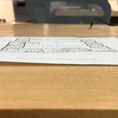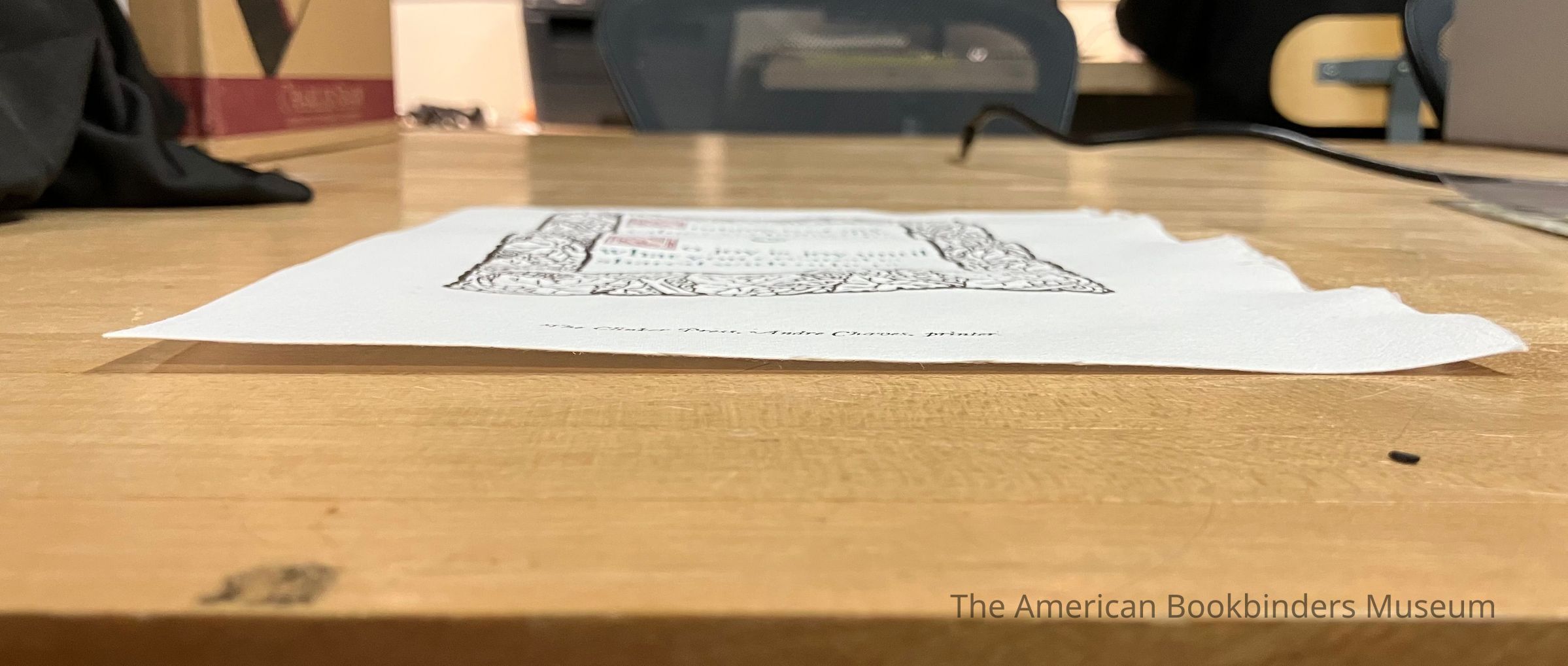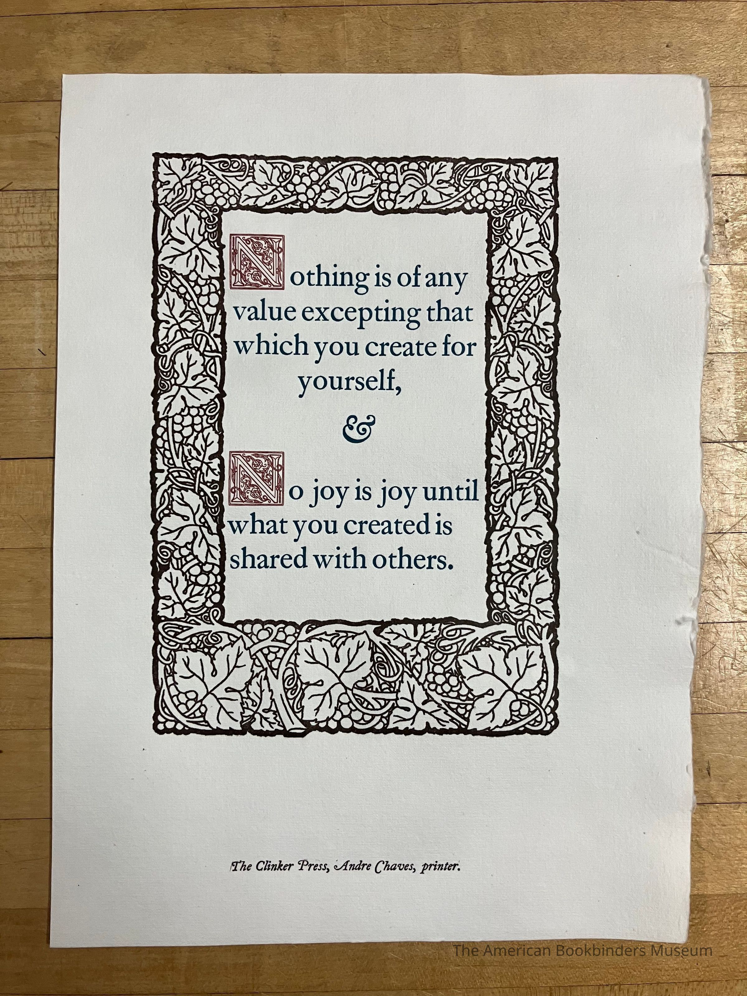 In a thick border of graves, vines, and leaves, is dark teal text with the first letters of the phrases in a large illuminated type. Printing information below. Letterpress? Paper is naturally ripply with the right side being a raw edge.Collection