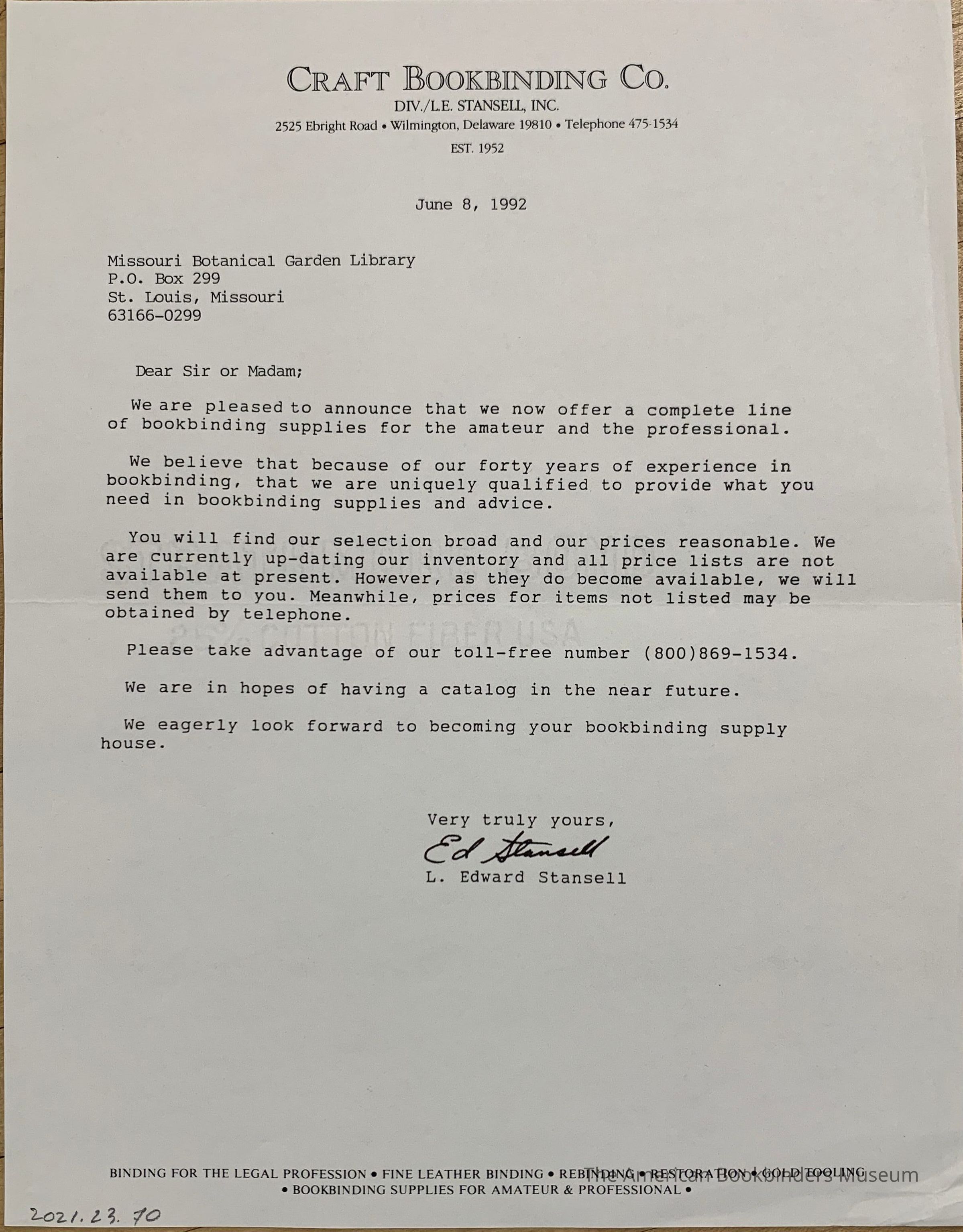 Cover letter to Missouri Botanical Garden Library dated June 8, 1992, and offprint from a magazine.Collection