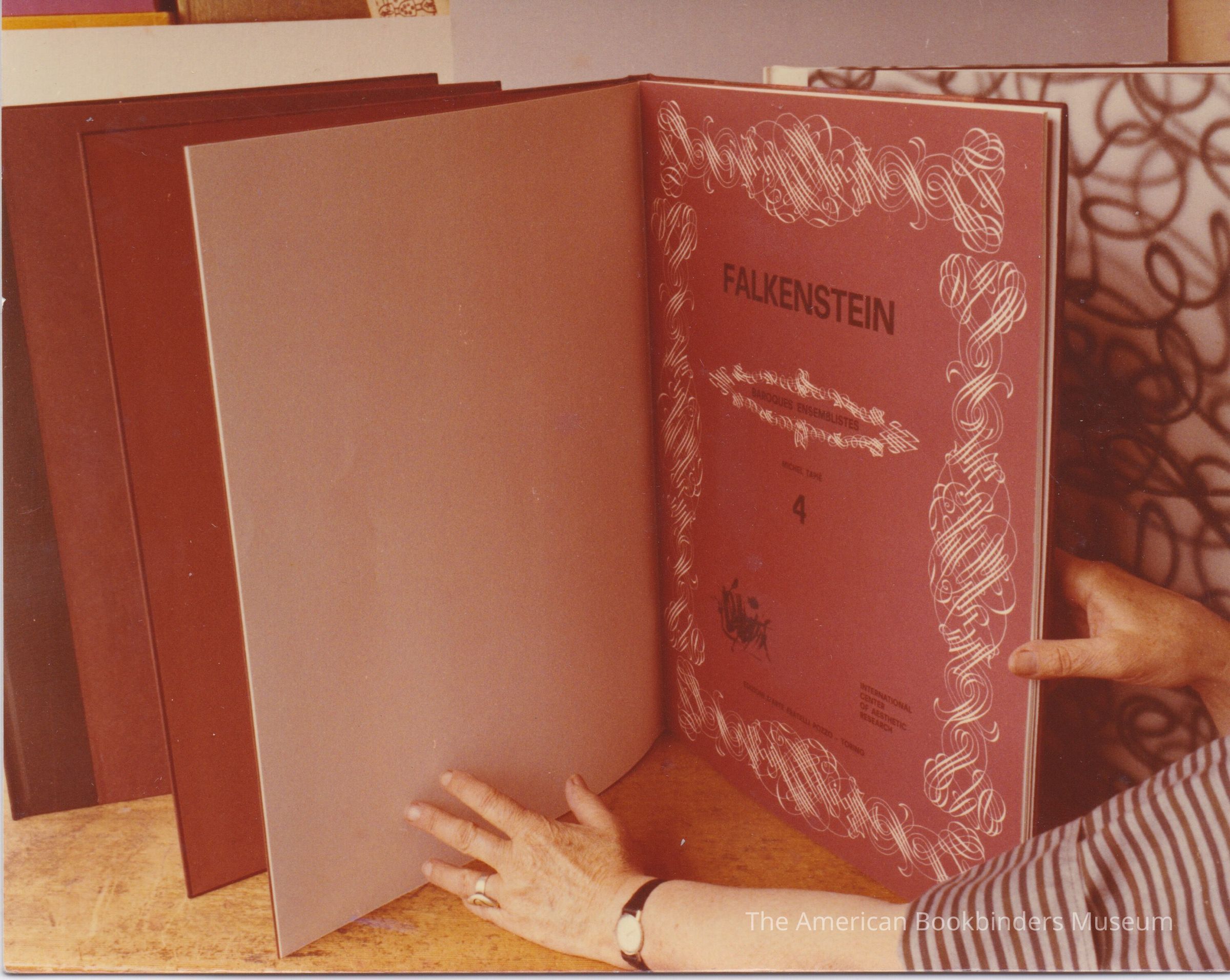 Shows a large book held open showing 'Falkenstein' on the cover page. Two other books are visible behind it, one with a white cover with black swirls and another with a dark red cover with a darker spine.Collection