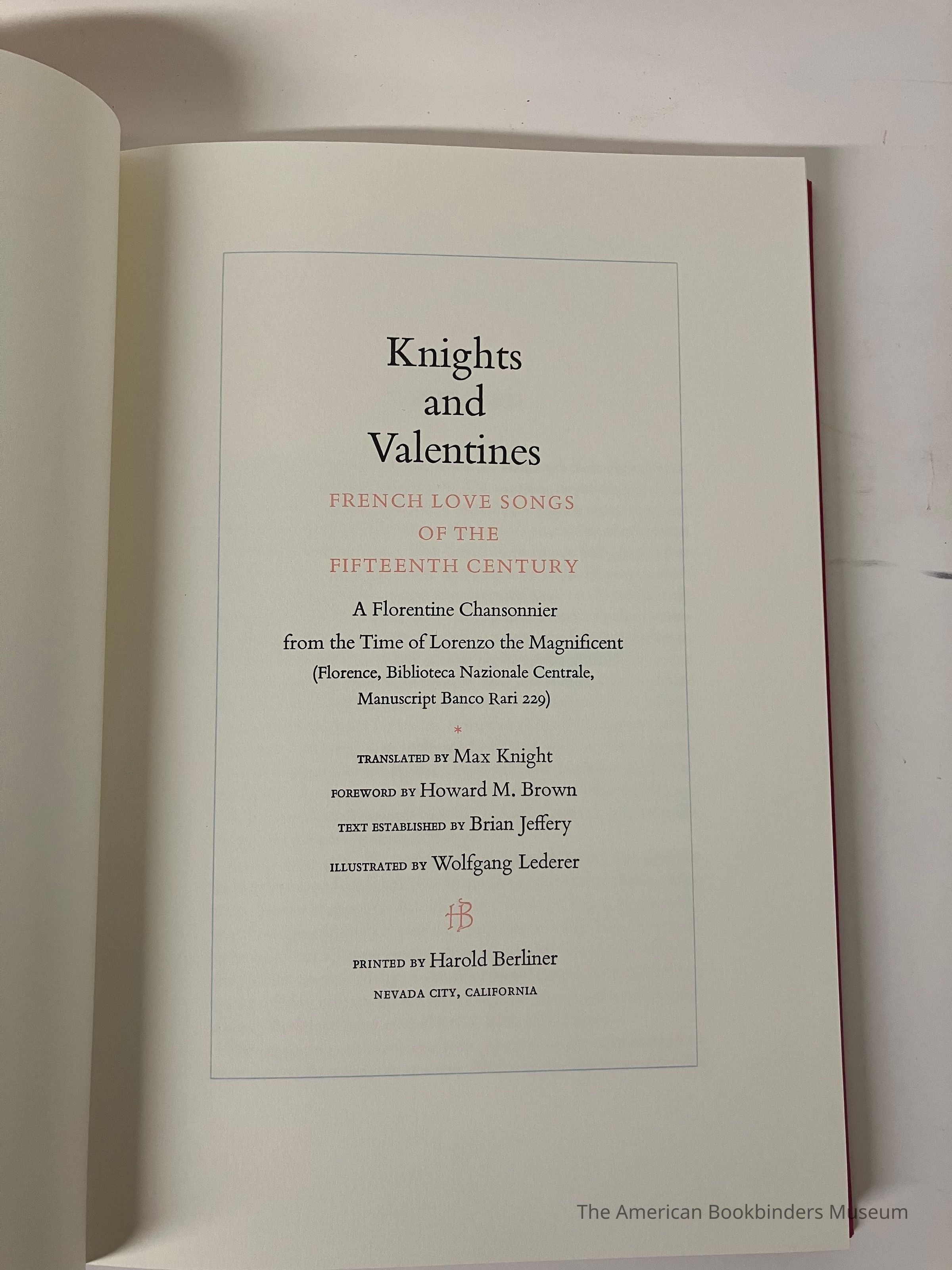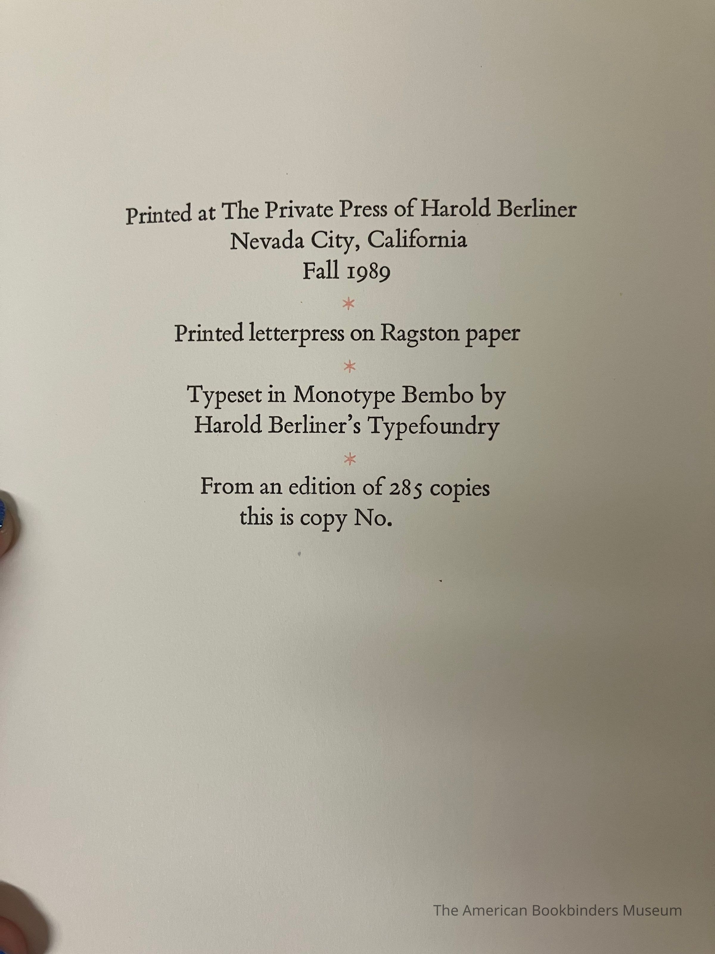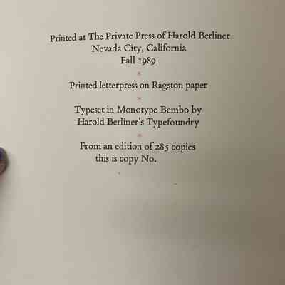 Colophon at back - Printed at The Private Press of Harold Berliner, Nevada City, California, Fall 1989. Printed letterpress on Ragston paper. Typeset in Monotype Bembo by Harold Berliner’s type foundry. From an edition of 283 copies, unnumbered.