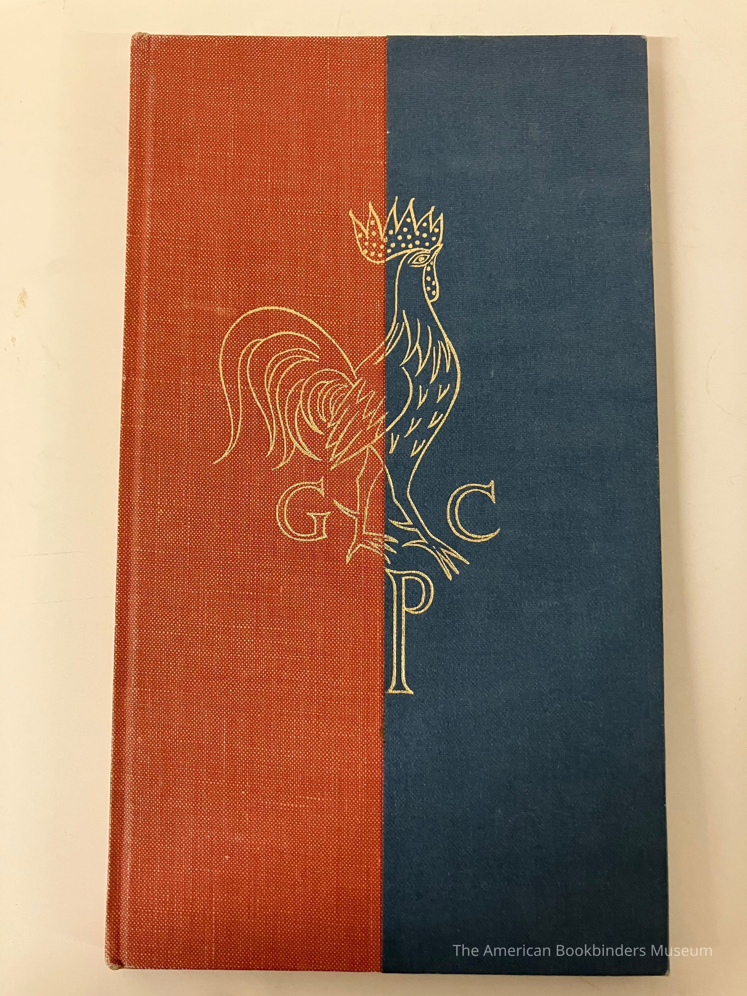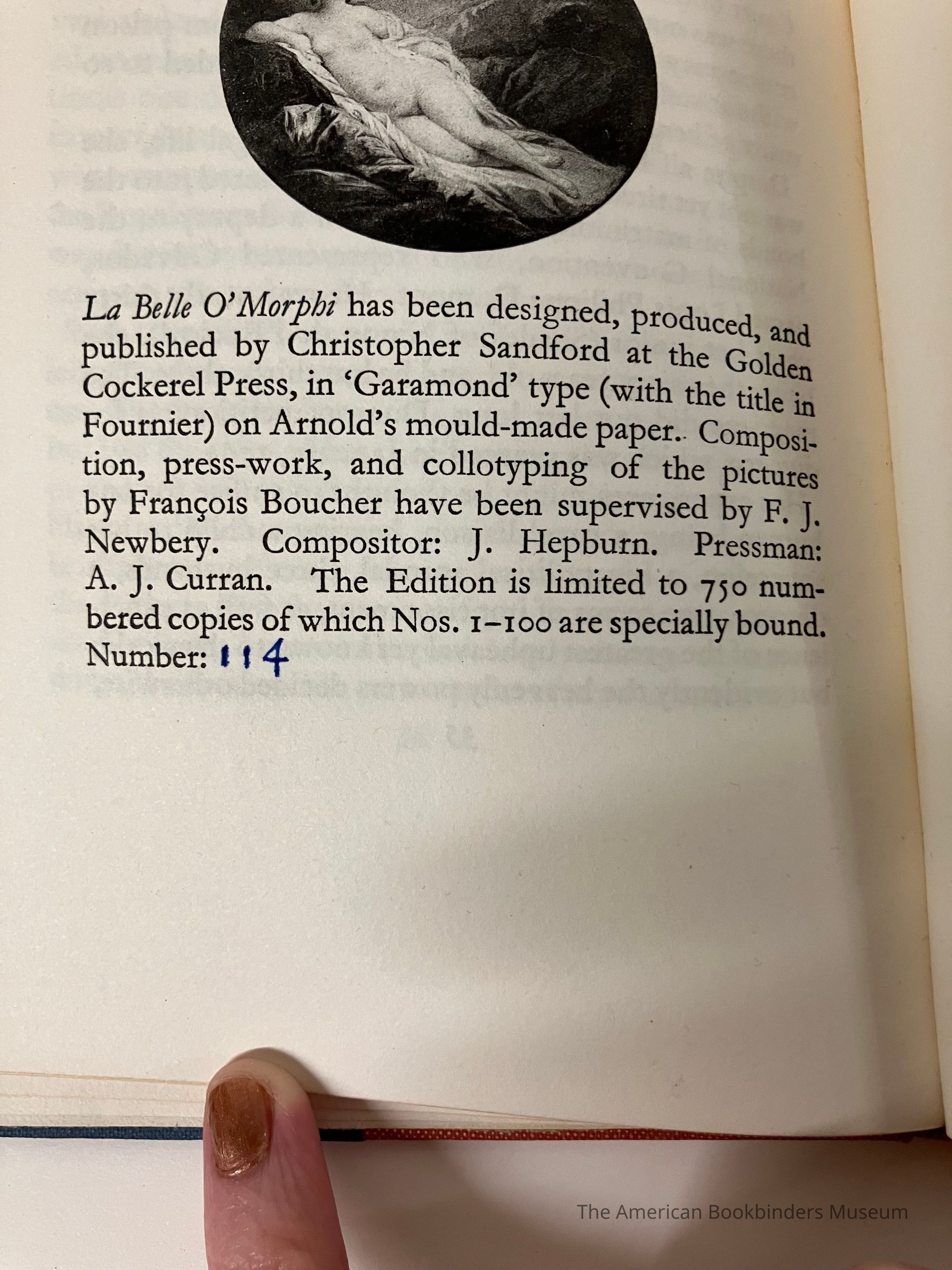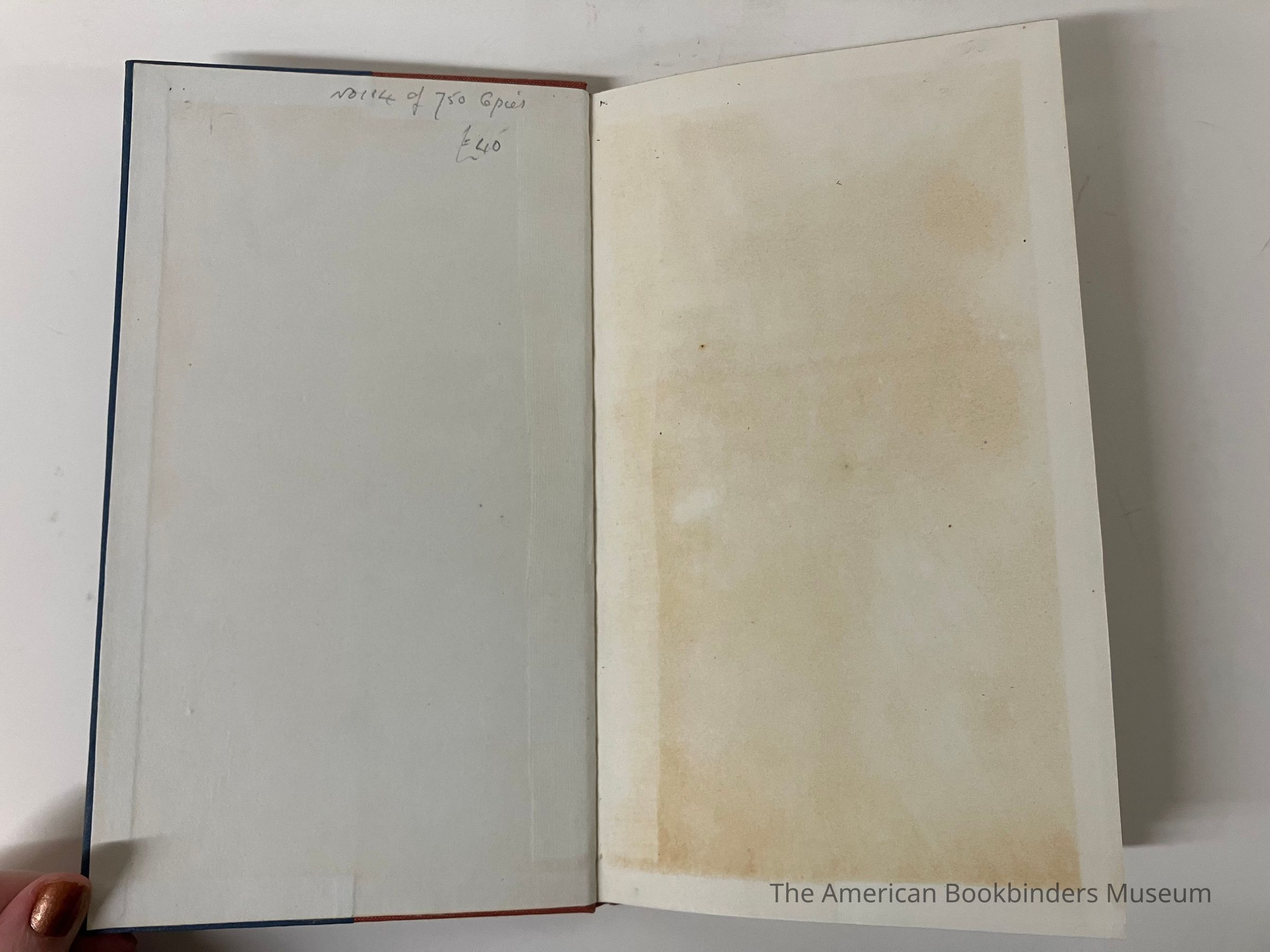 Colophon at back - Printed in Garamond type on Arnold’s mould-made paper. Pictures handled by François Boucher supervised by F. J. Newbery. Compositor is J. Hapburn. Pressman (printer) is A. J. Curran. Edition is limited to 750 numbered copies of which Nos. 1-100 are specially bound. Number 114