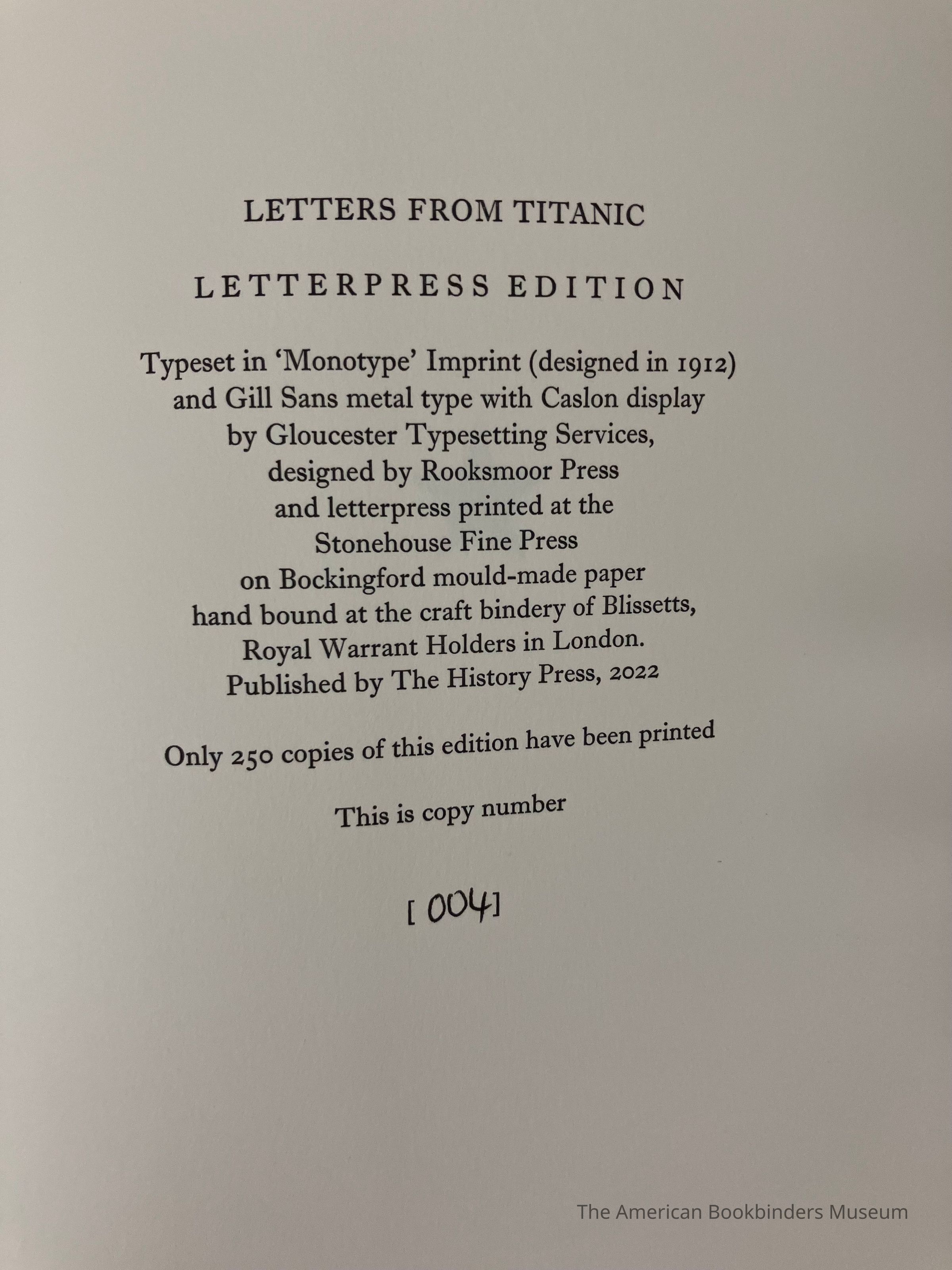 From colophon - typeset in 'Monotype' imprint, Gill Sans metal type with Caslon display by Gloucester Typesetting Services. designed by Rooksmoor Press, letterpress printed at the Stonehouse Fine Press on Bockingford mould-made paper, hand bound at the craft bindery of Blissetts.
