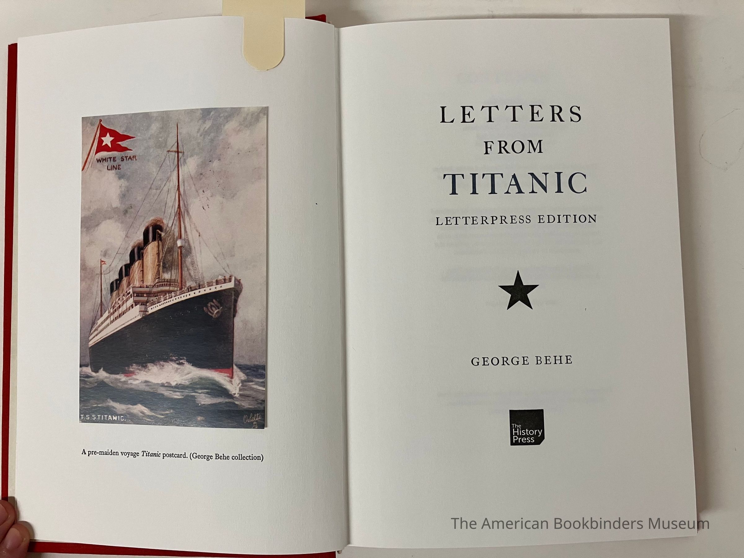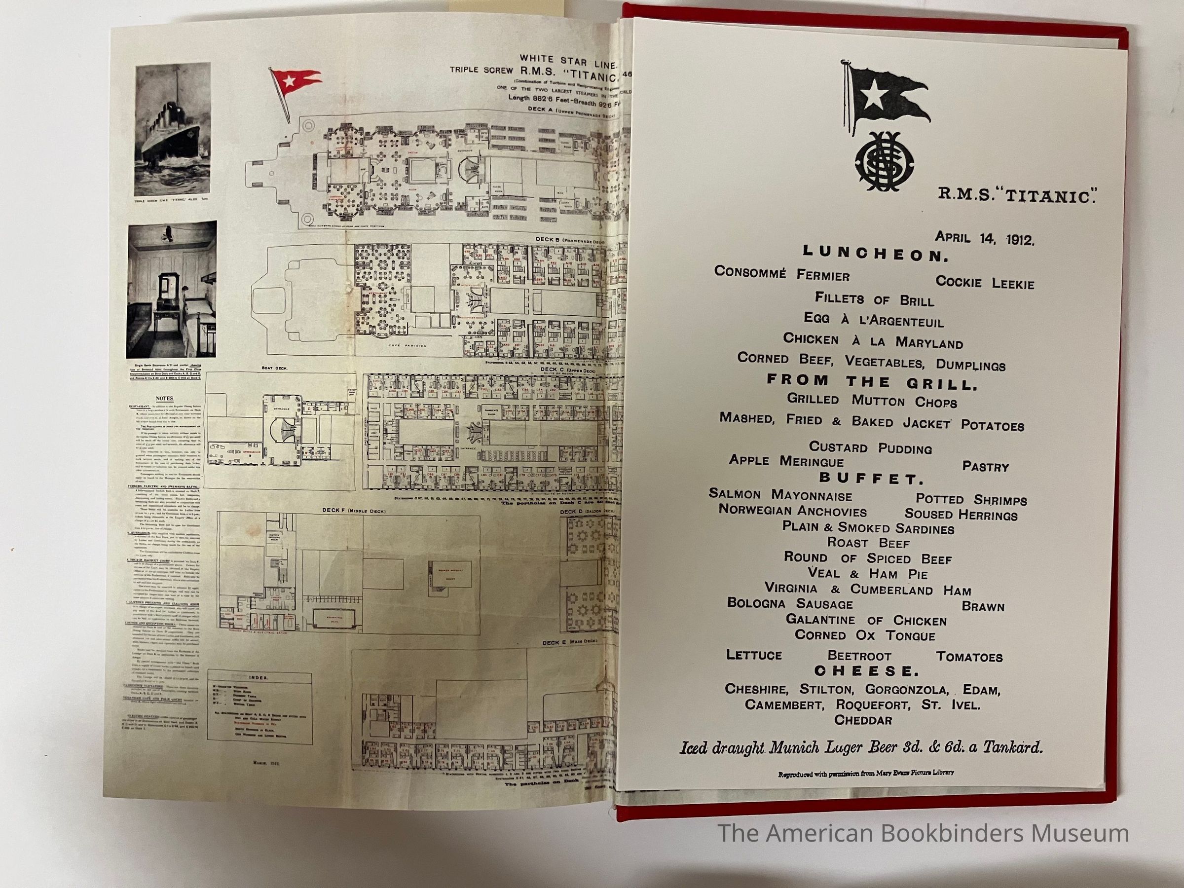 Rounded and backed case bound with glued on endbands and tipped-in fontispiece. Loose item is a facsimile of first class lunch menu.Notes