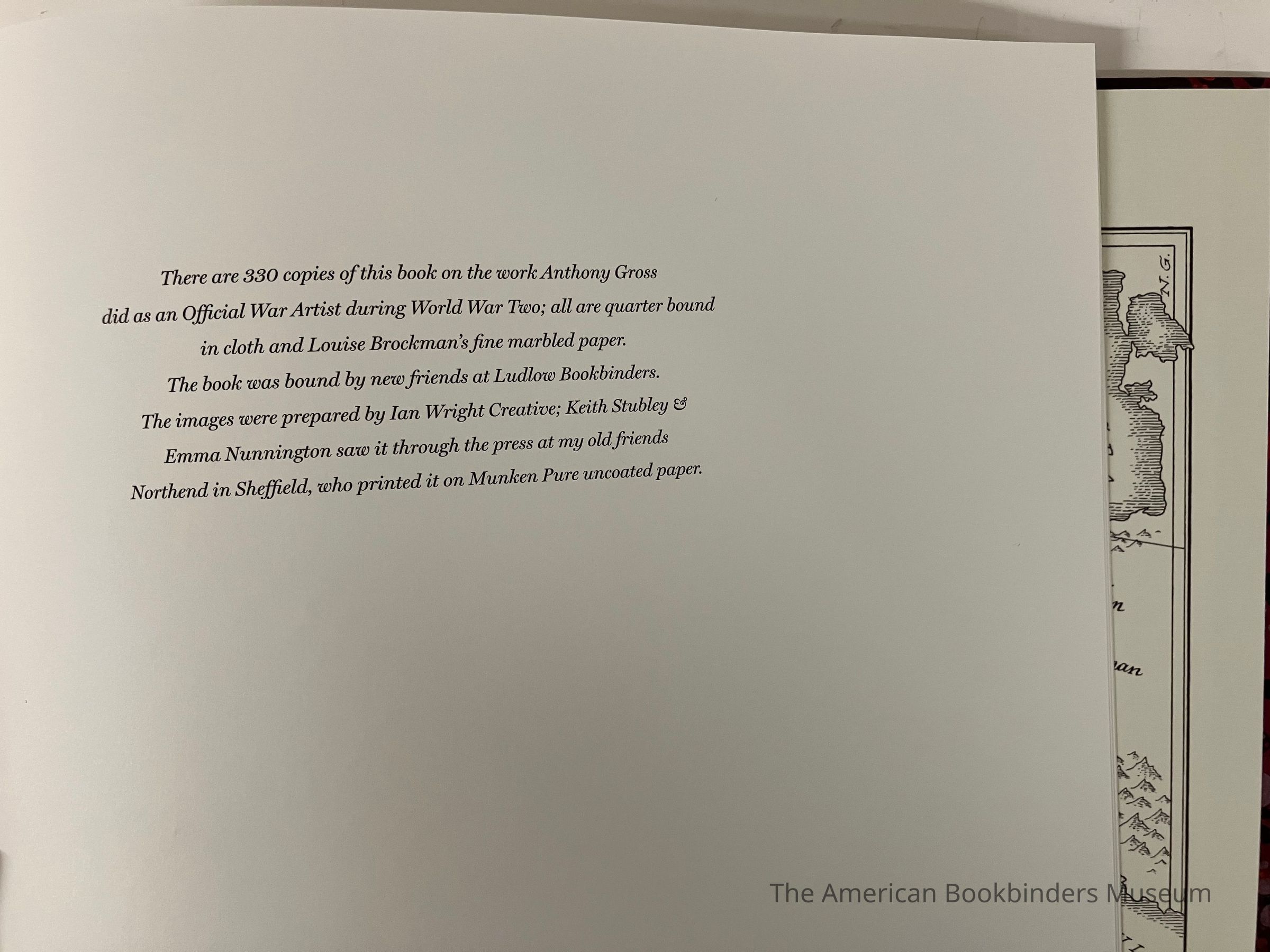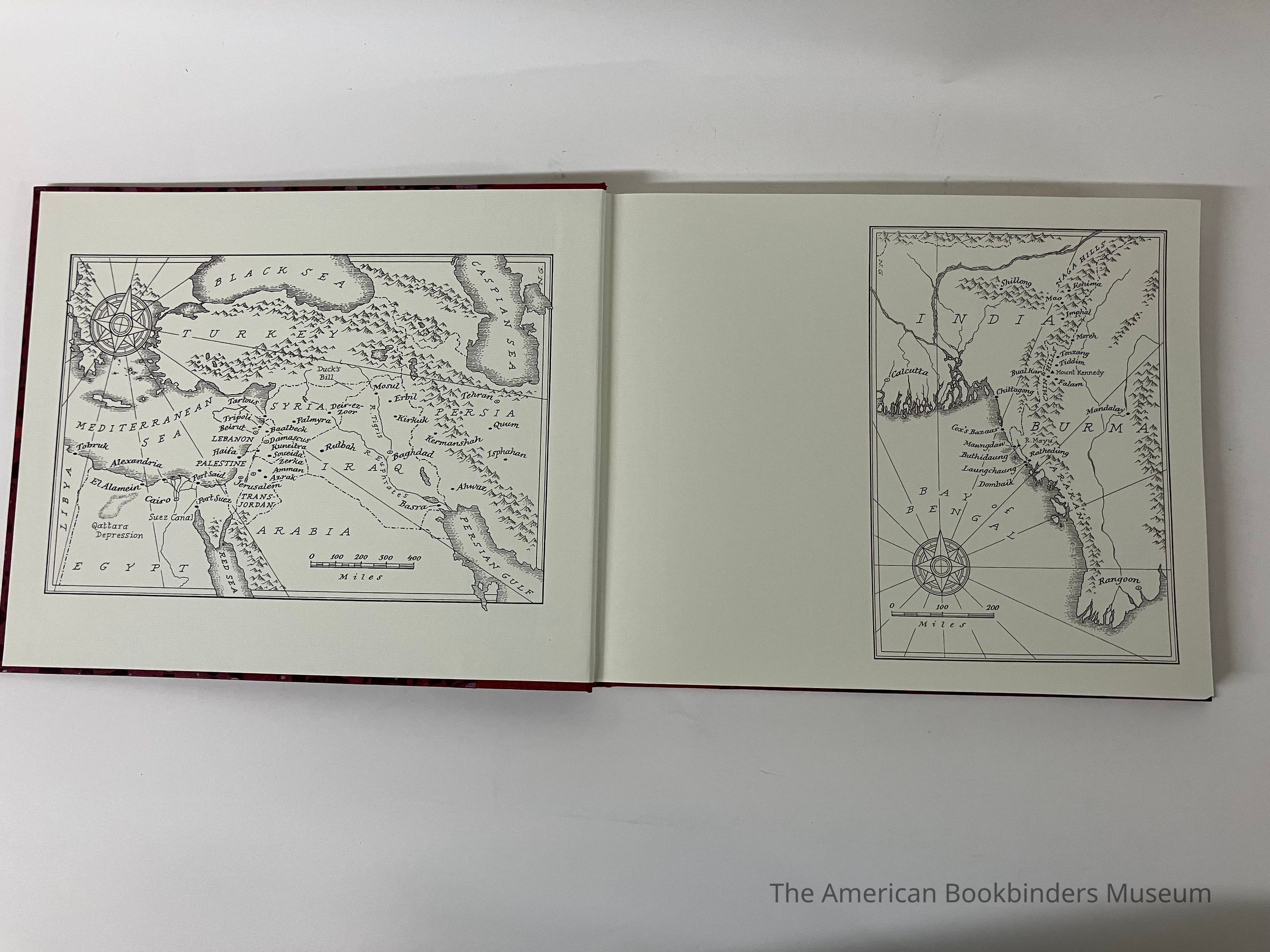 Cover has a cloth covered spine in dark red, with marbled paper. End sheets show maps of the Middle East and the eastern part of the Indian subcontinent showing Burma (now Myanmar). Book is on the work of Anthony Gross as Official War Artist during WW2.