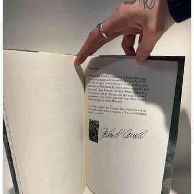 Text hand set in 14pt. Garamont and printed in dark green and black on Somerset Book Laid, sewn into covers with labelled wraps of green Japanese Obonai hand made. The title page features a tipped print reproduced from a collage by Janet Downey.
