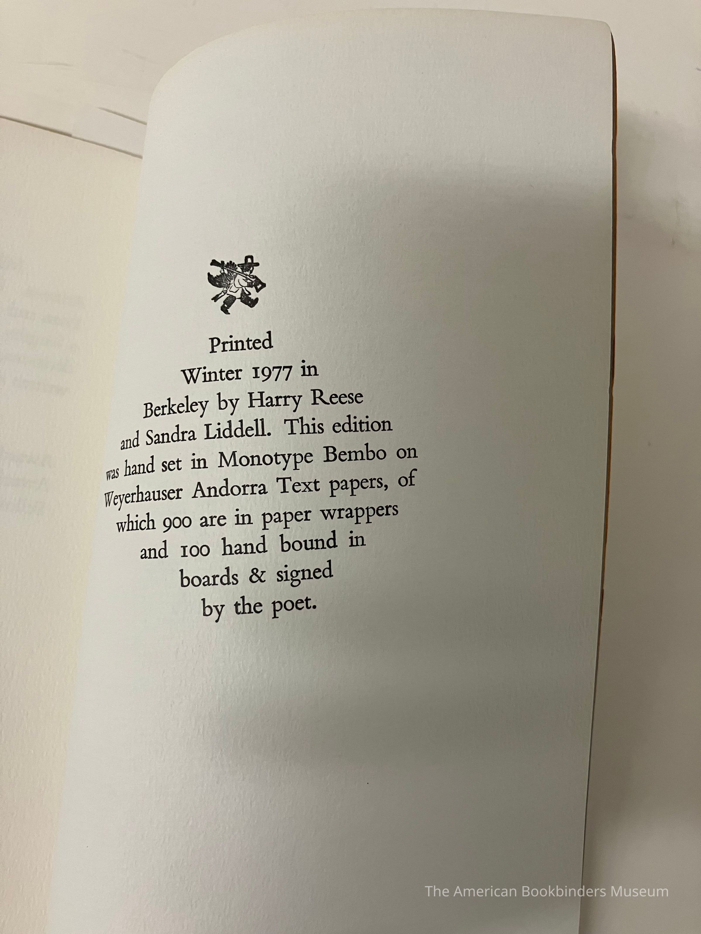 From colophon at back - Printed winter 1977 in Berkeley by Harry Reese and Sandra Liddell. Hand set in Monotype Bembo on Weyerhaeuser Andorra Text papers, of which 900 in paper wrappers, 100 in board and signed by poet.