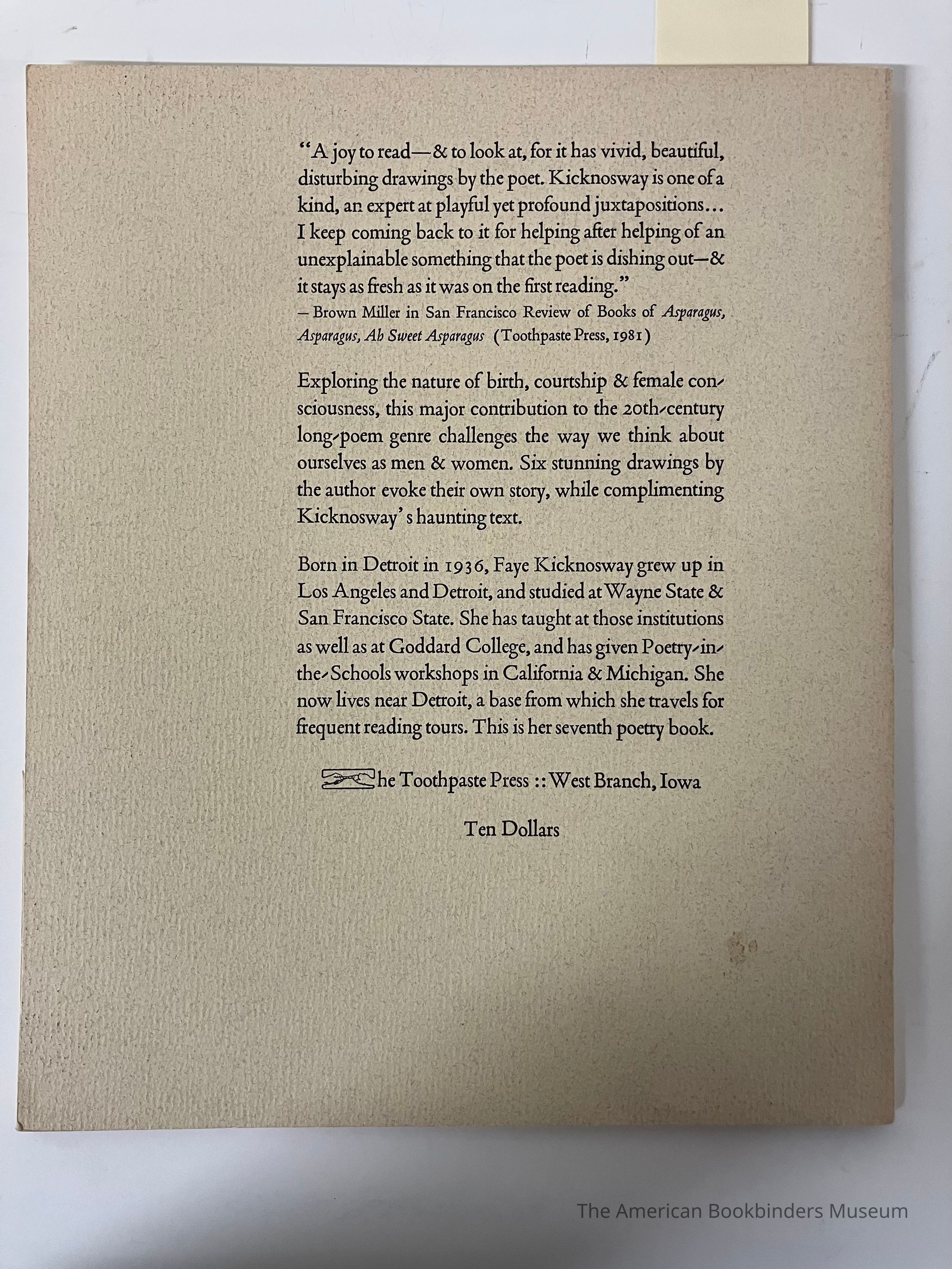 Exploring the nature of birth, courtship, & female consciousness, this major contribution to the 10th-century long-poem genre challenges the way we think about ourselves as men & women. Six stunning drawings by the author evoke their own story, while complimenting Kicknowsway's haunting text.Collection