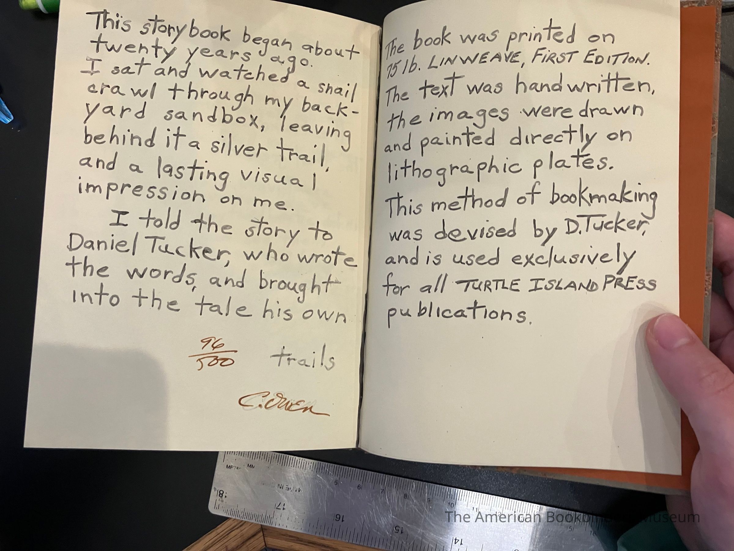 Story and words by Daniel Tucker. Printed of 75 lb. Linweave,, 1st edition. Text and images directly on lithographic plates, a method created by Tucker.