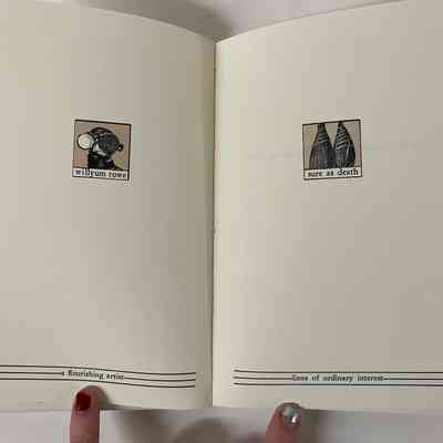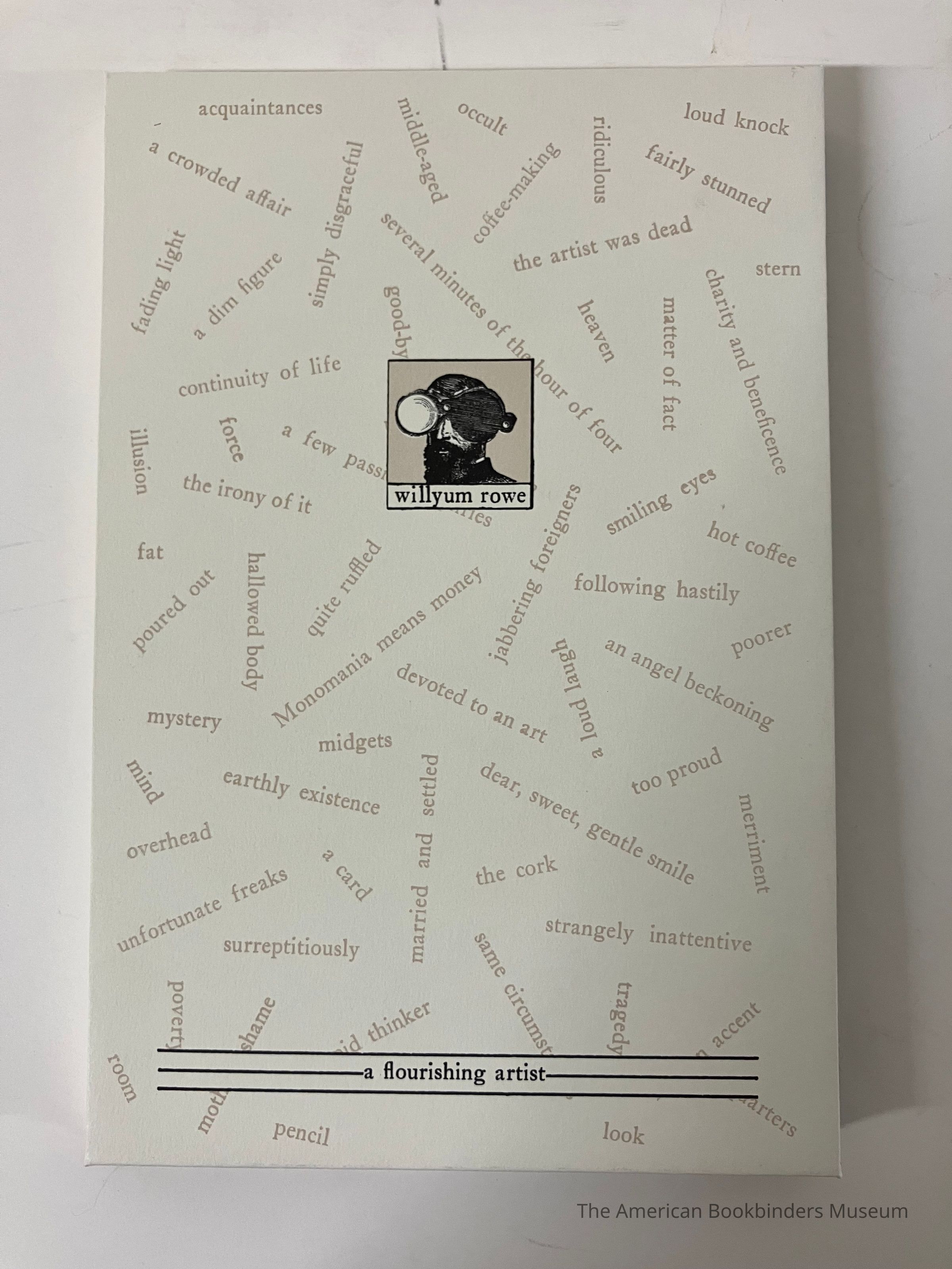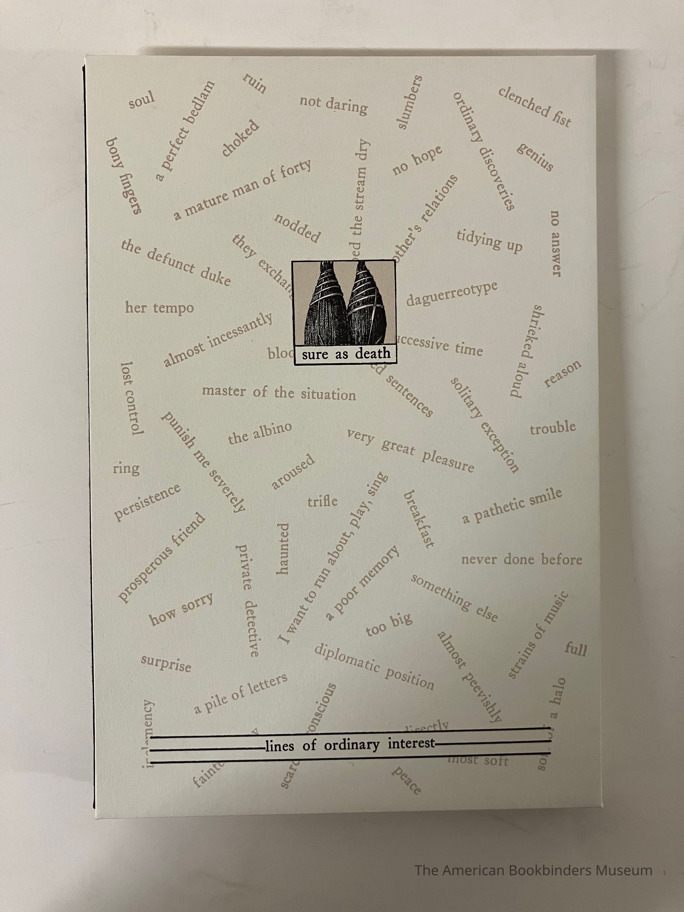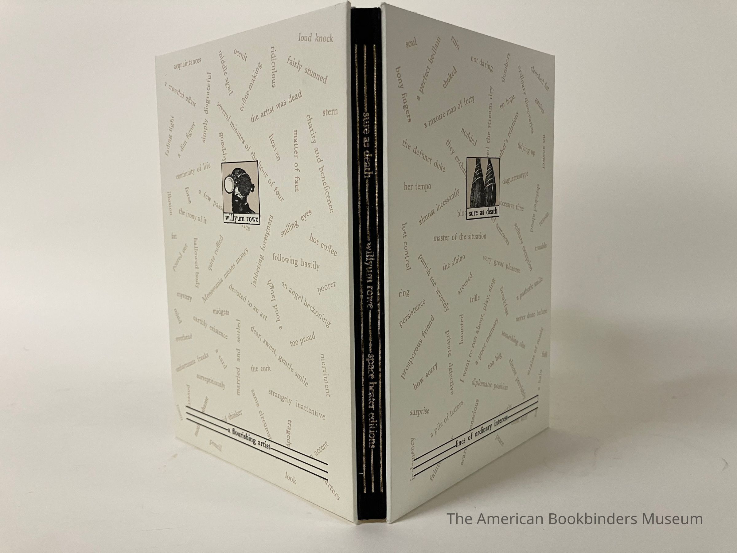 Artist book where each page has an illustration in the center and text at the bottom of the page. Covers are white with light brown text scattered accross. Spine is flexible, covered in black cloth with gold text. Publishing information at back with the colophon.