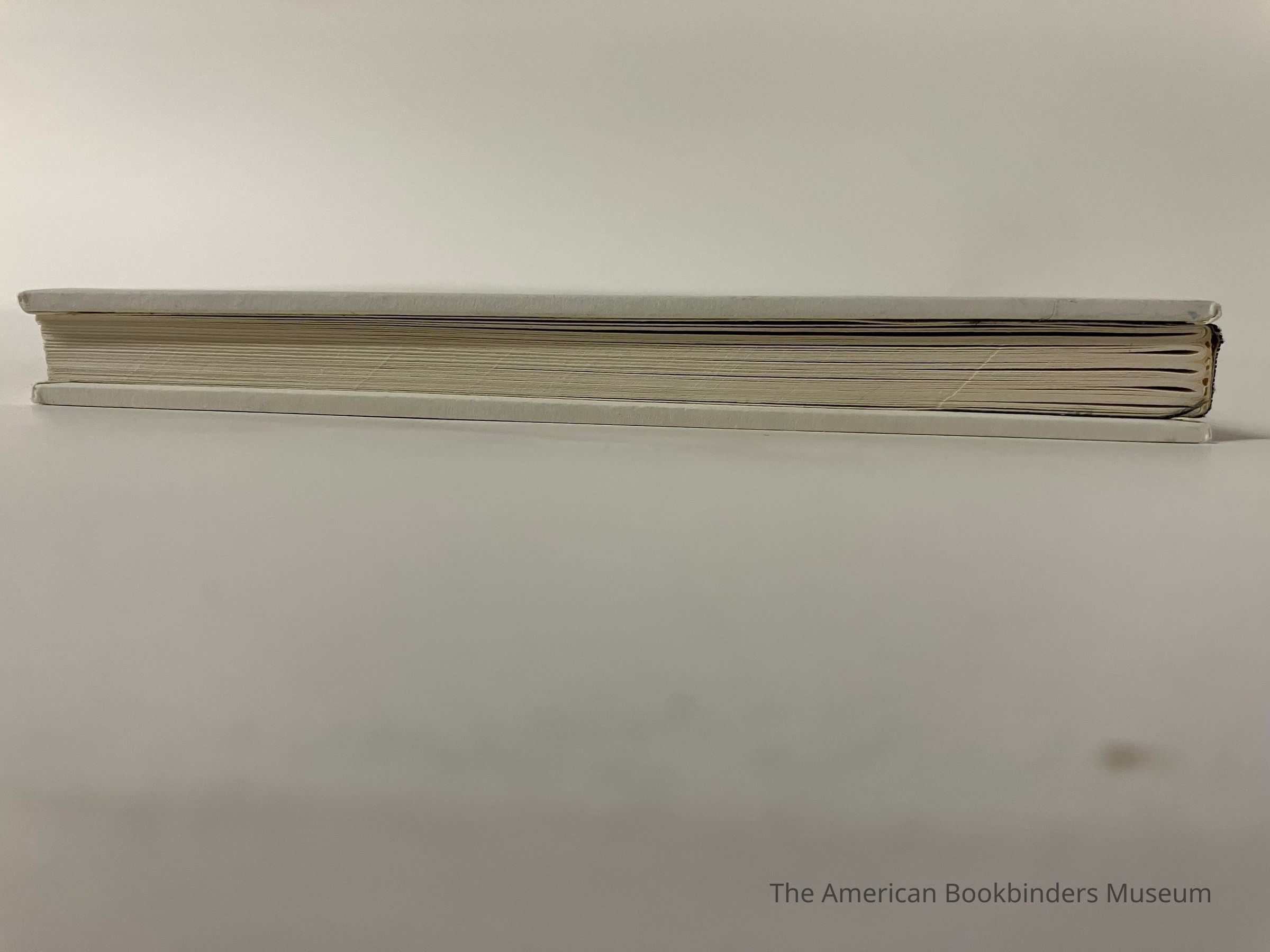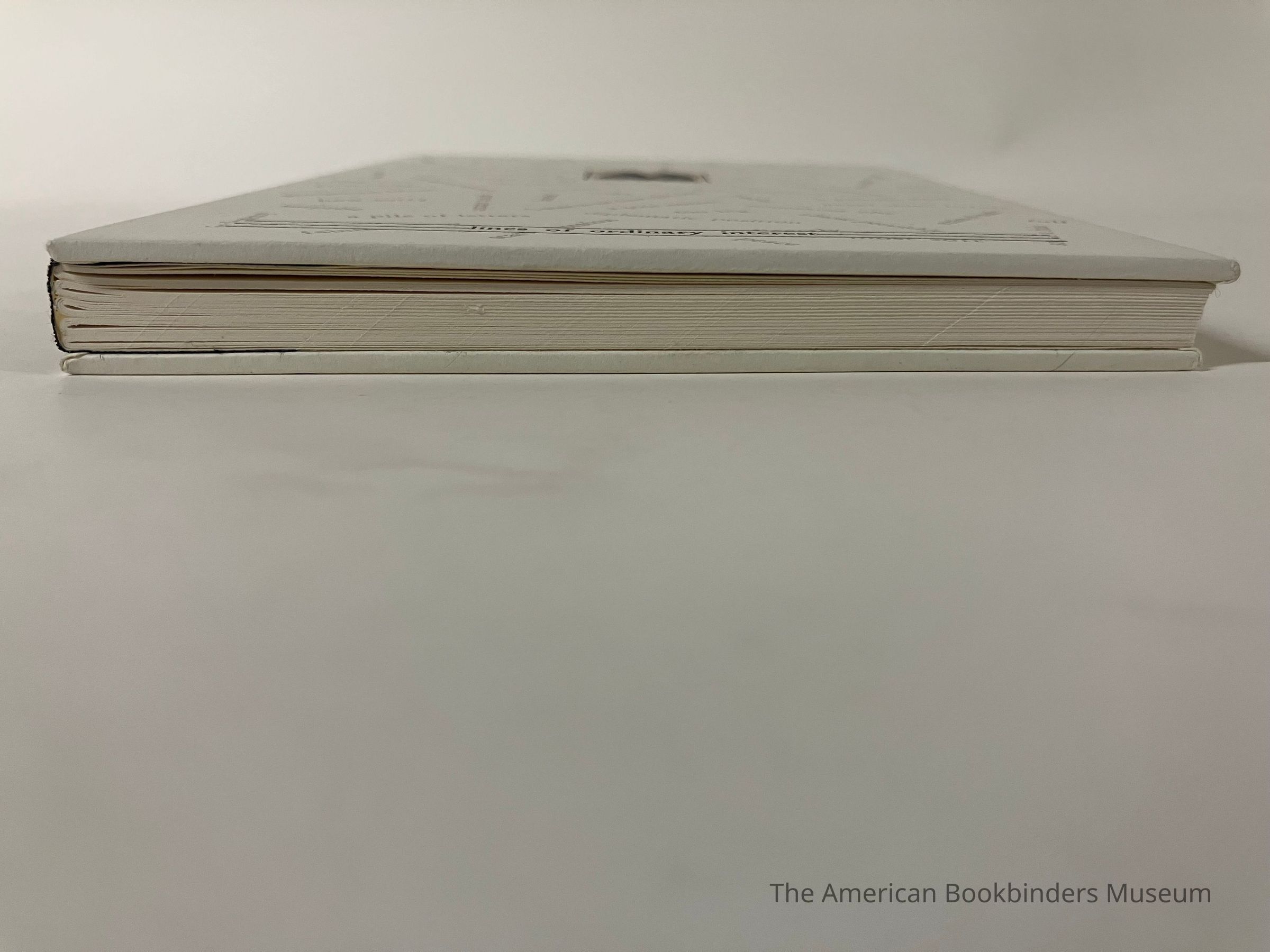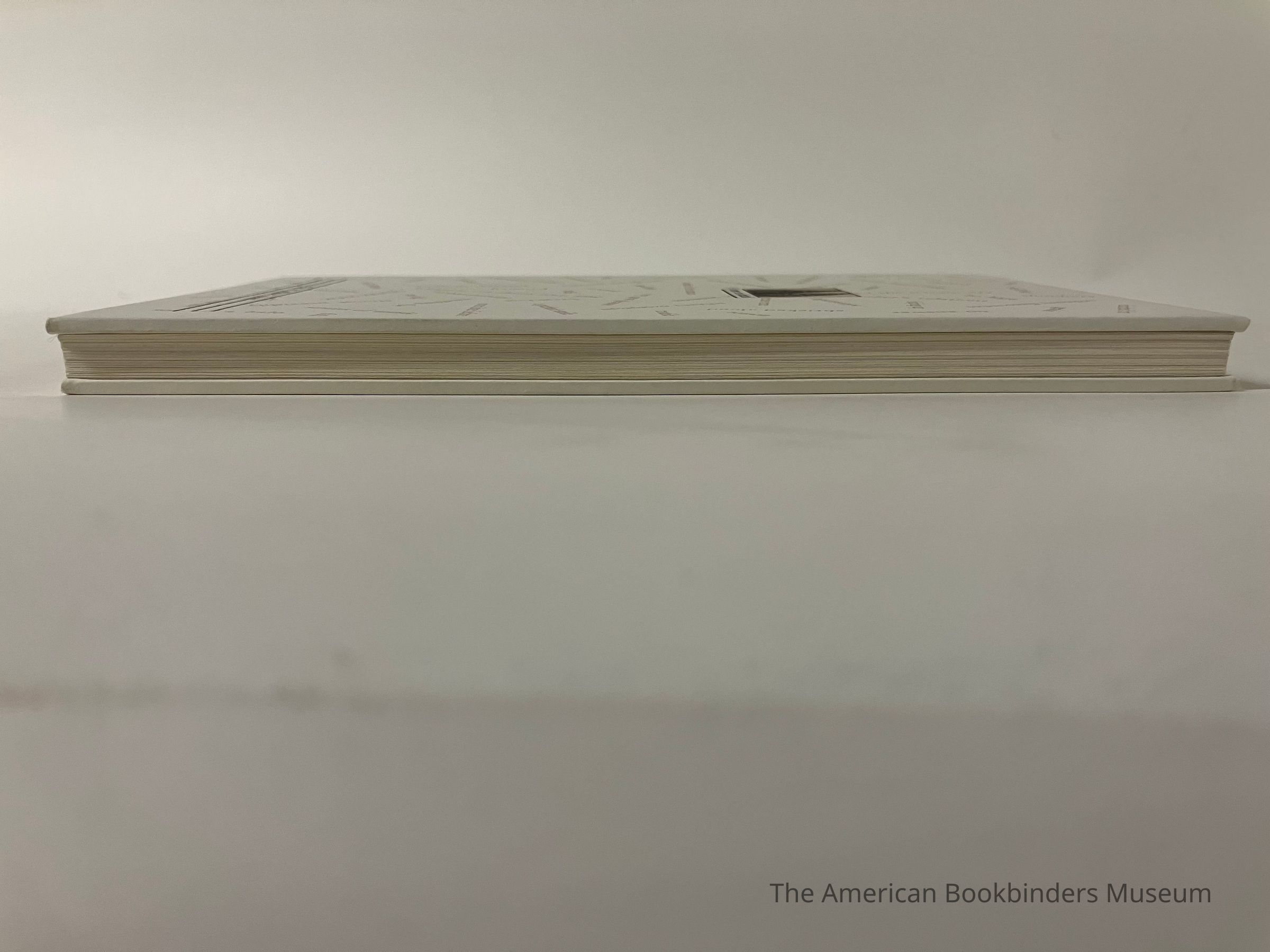 Bound in Albany, NY. Cased-in by hand by Phil Zimmermann in an edition of 500, though only about 150 were actually bound because of production problems. (Because of press issues, some of the beige second color was misregistered so the actual run that was bound for sale is significantly smaller.) Boareds are connected to the spine by gluing it to the backing material.Notes