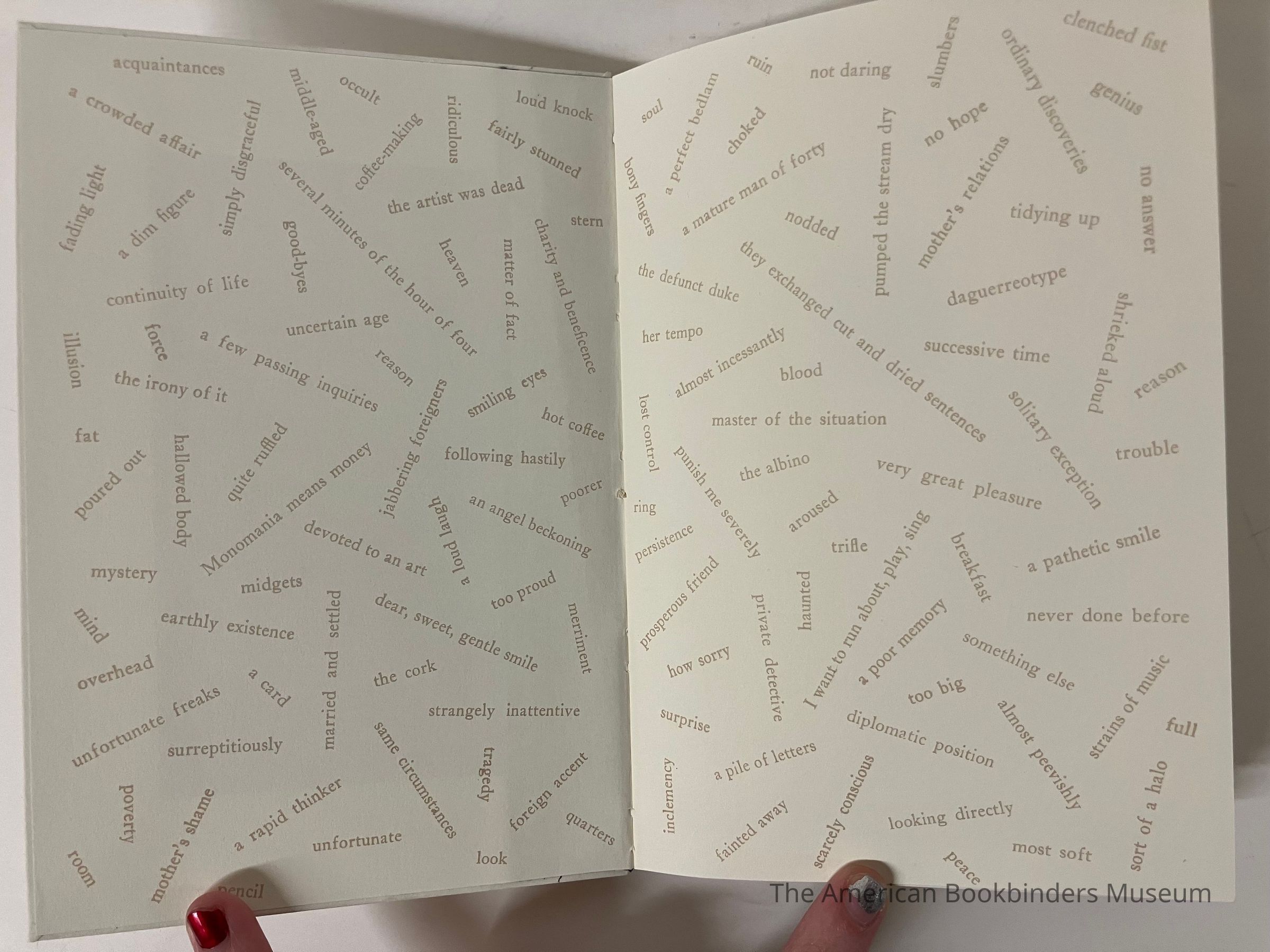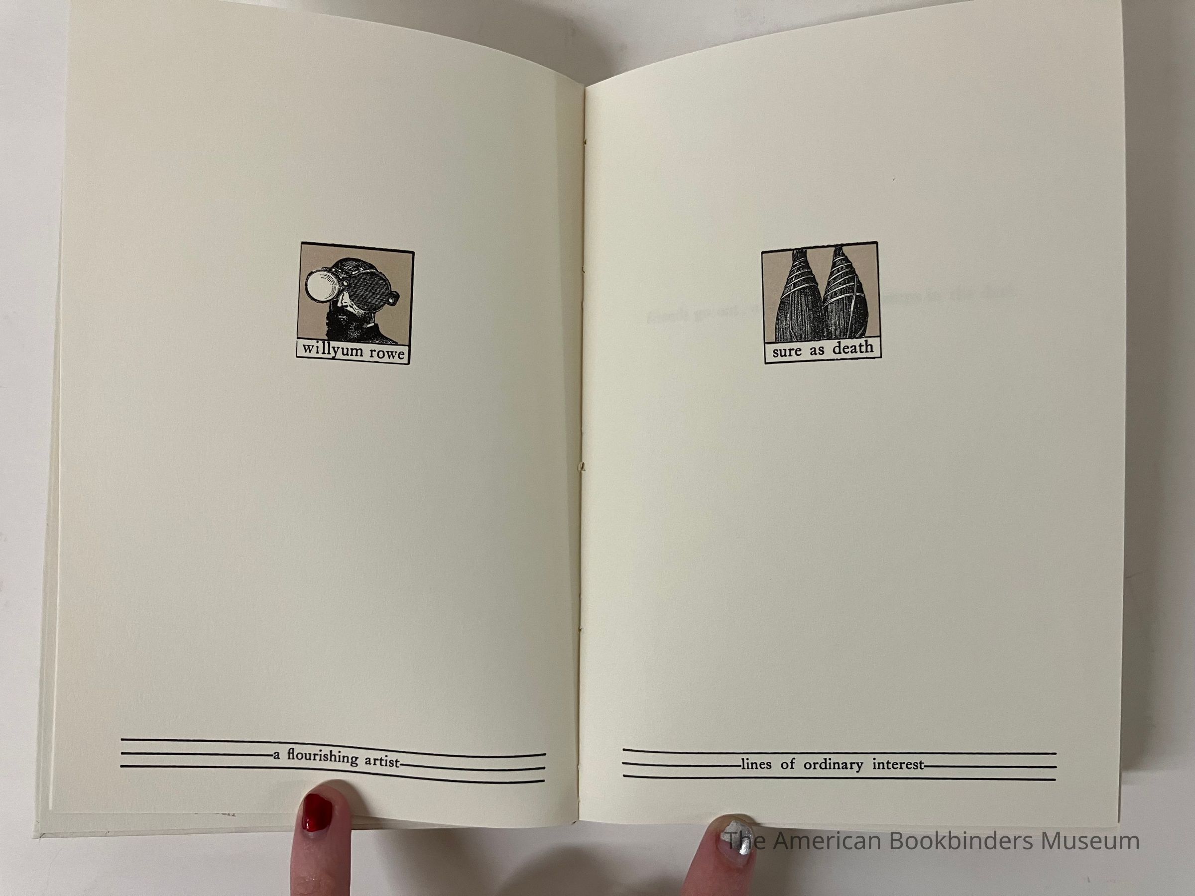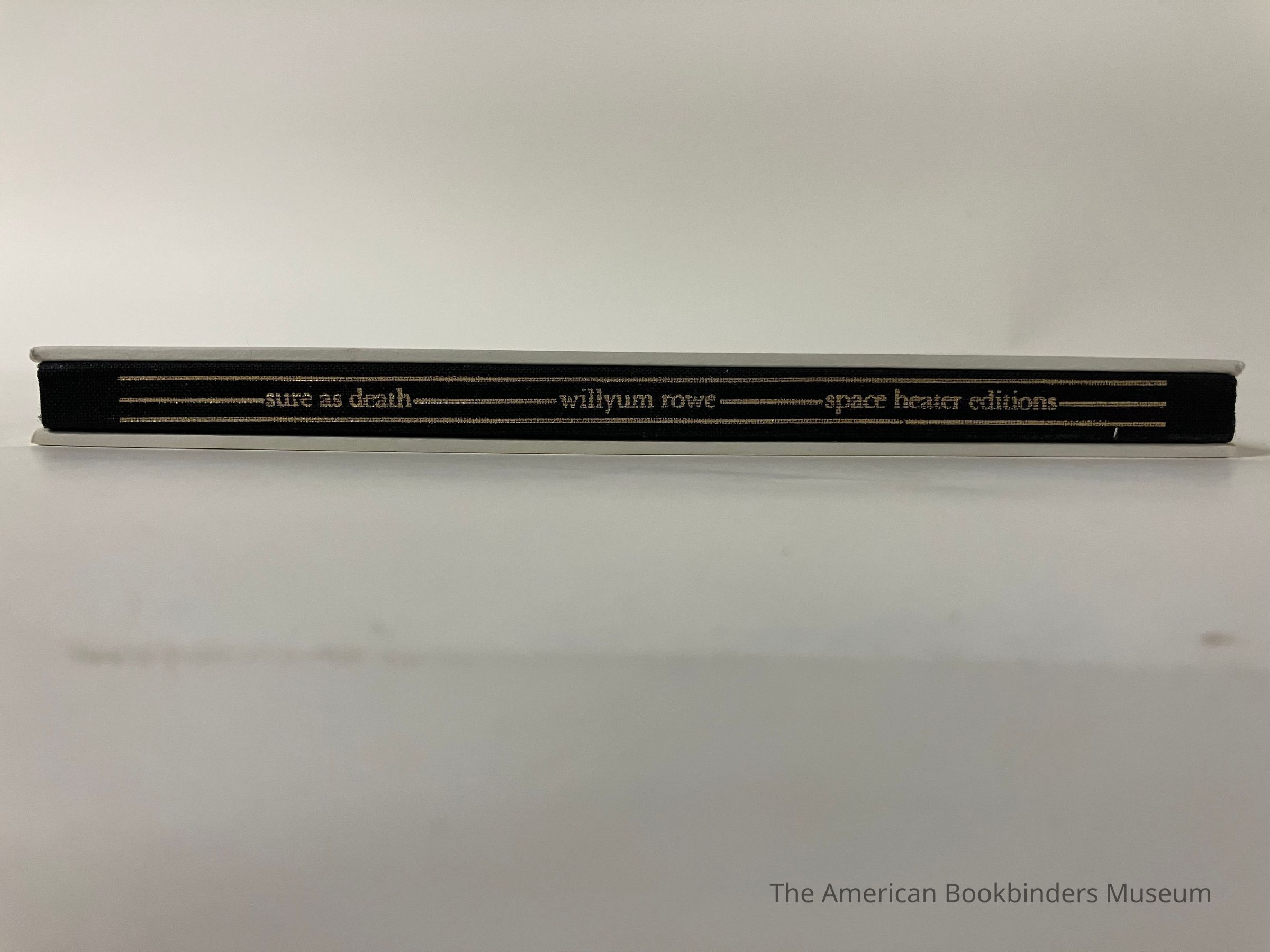 Bound in Albany, NY. Cased-in by hand by Phil Zimmermann in an edition of 500, though only about 150 were actually bound because of production problems. (Because of press issues, some of the beige second color was misregistered so the actual run that was bound for sale is significantly smaller.) Boareds are connected to the spine by gluing it to the backing material.Notes