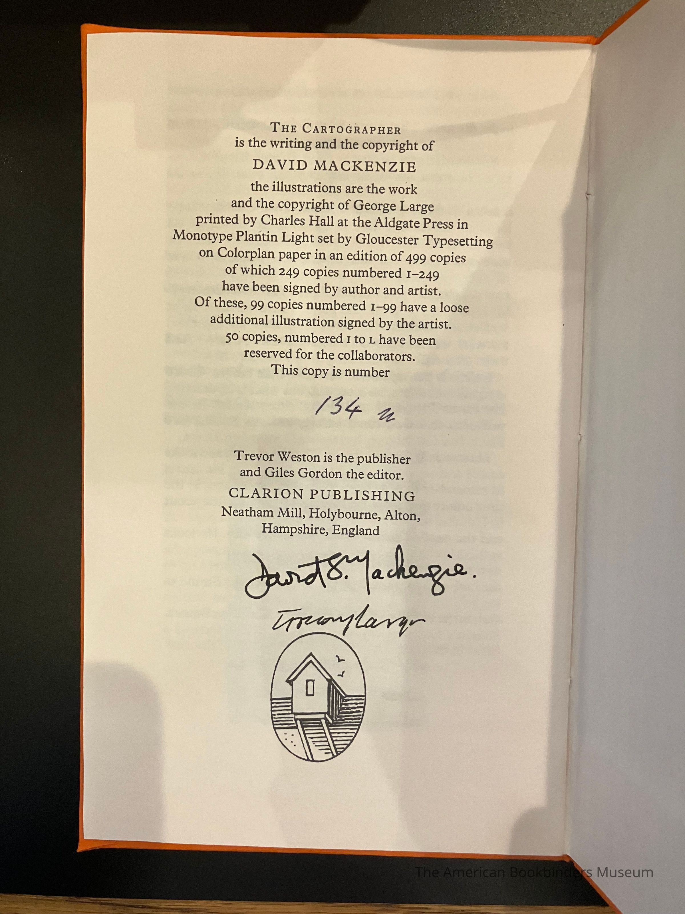 Printed by Hall at the Aldgate Press in Monotype Plantin Light set by Gloucester Typesetting on Colorplan paper in an edition of 499 copies of which 249 copies signed by author and artist. Of that number 99 have a loose additional artist. 50 copies reserved for collaborators. Trevor Weston is publisher.