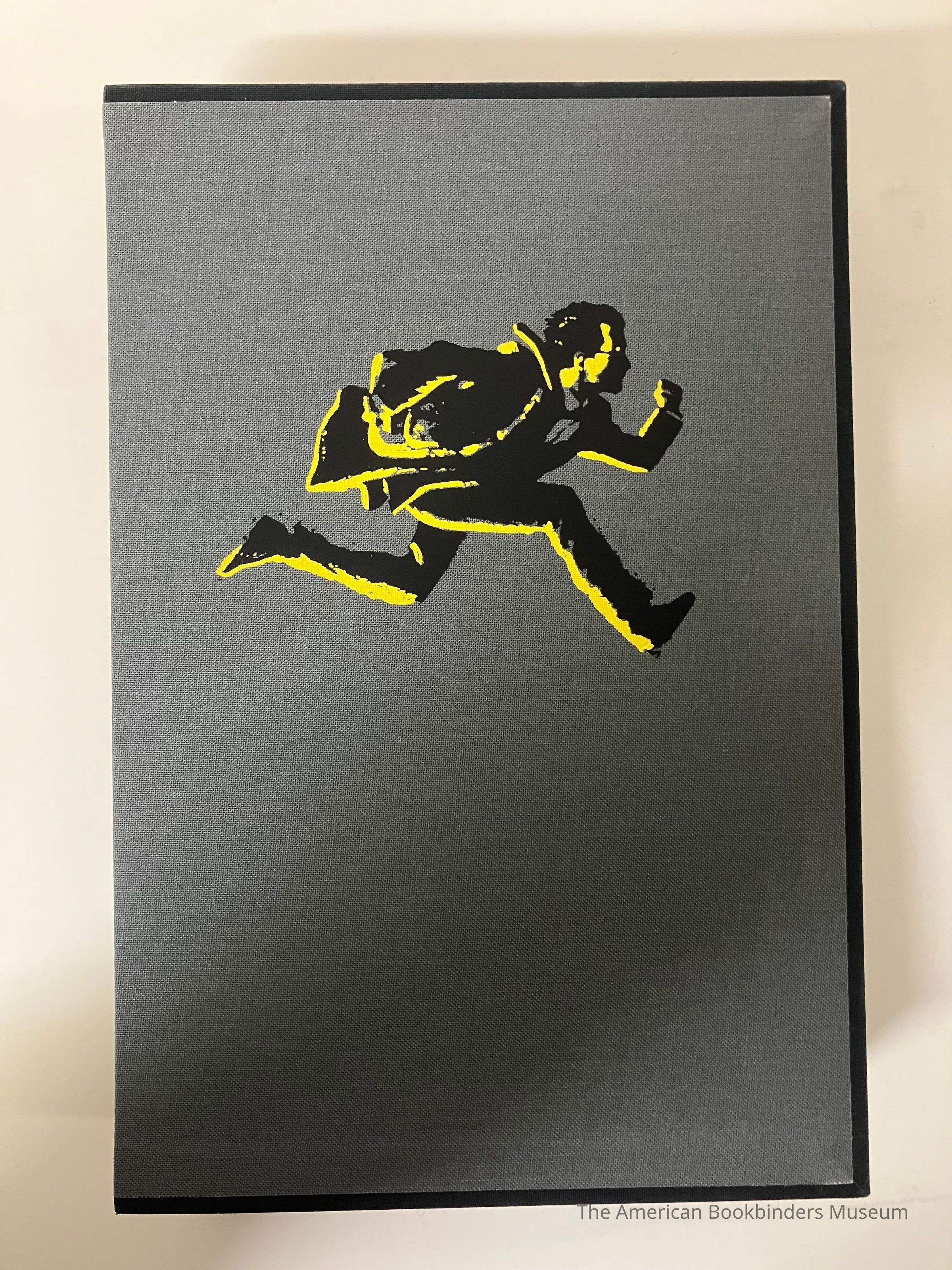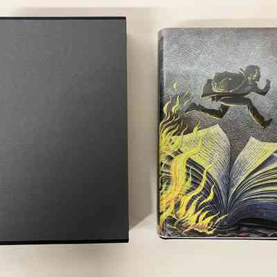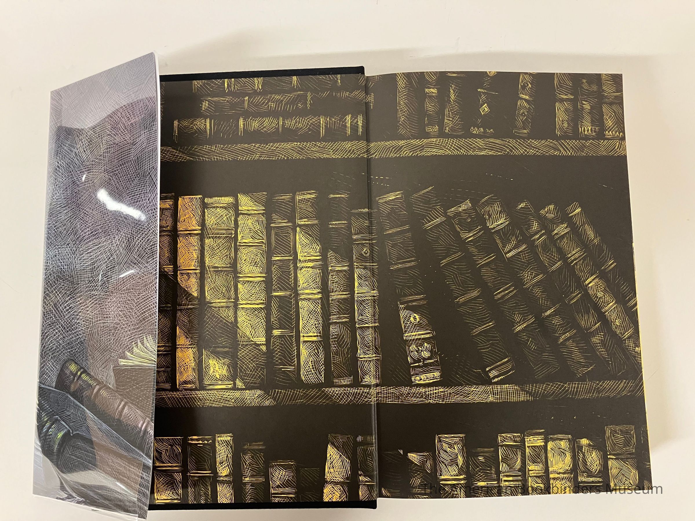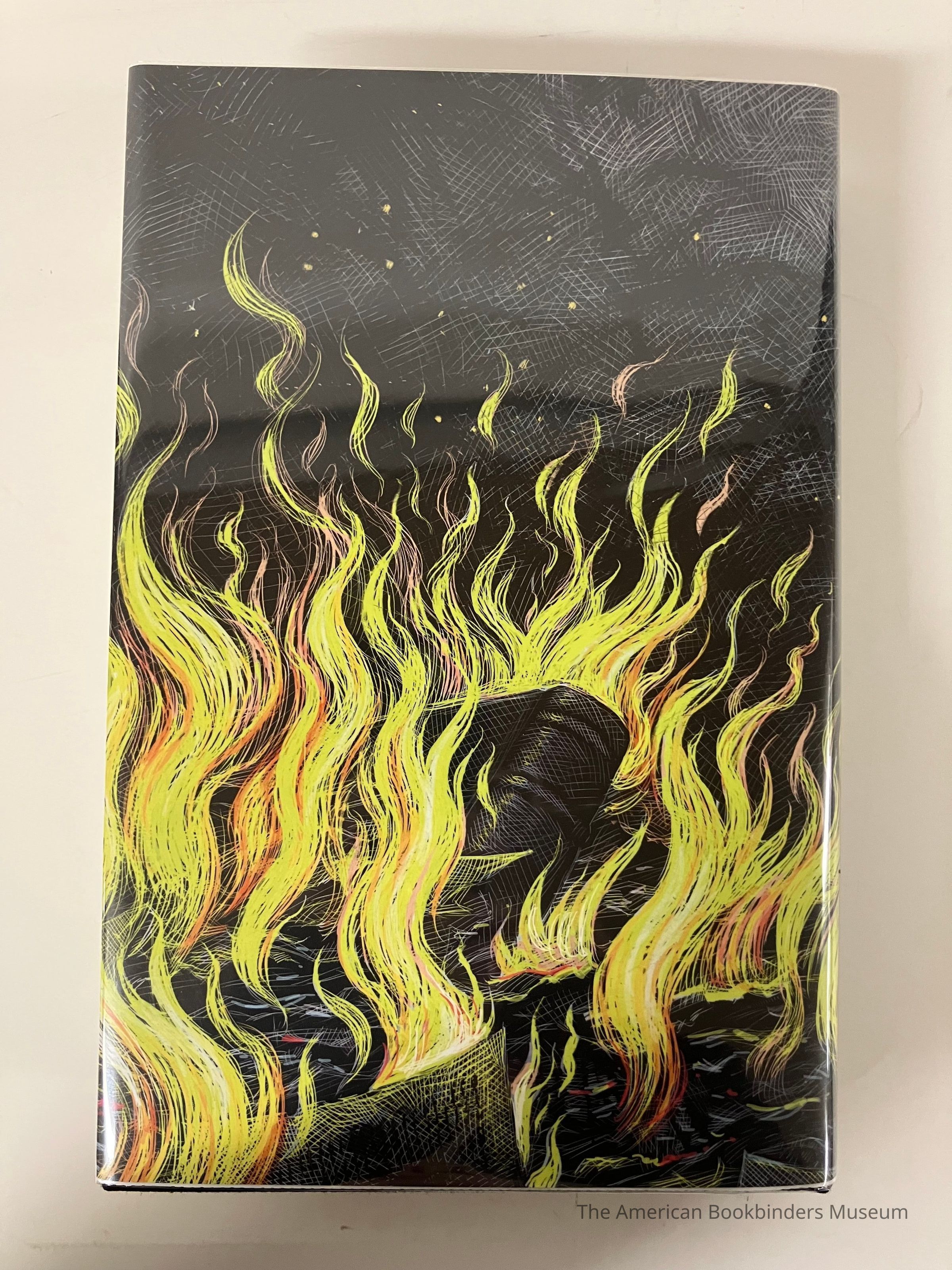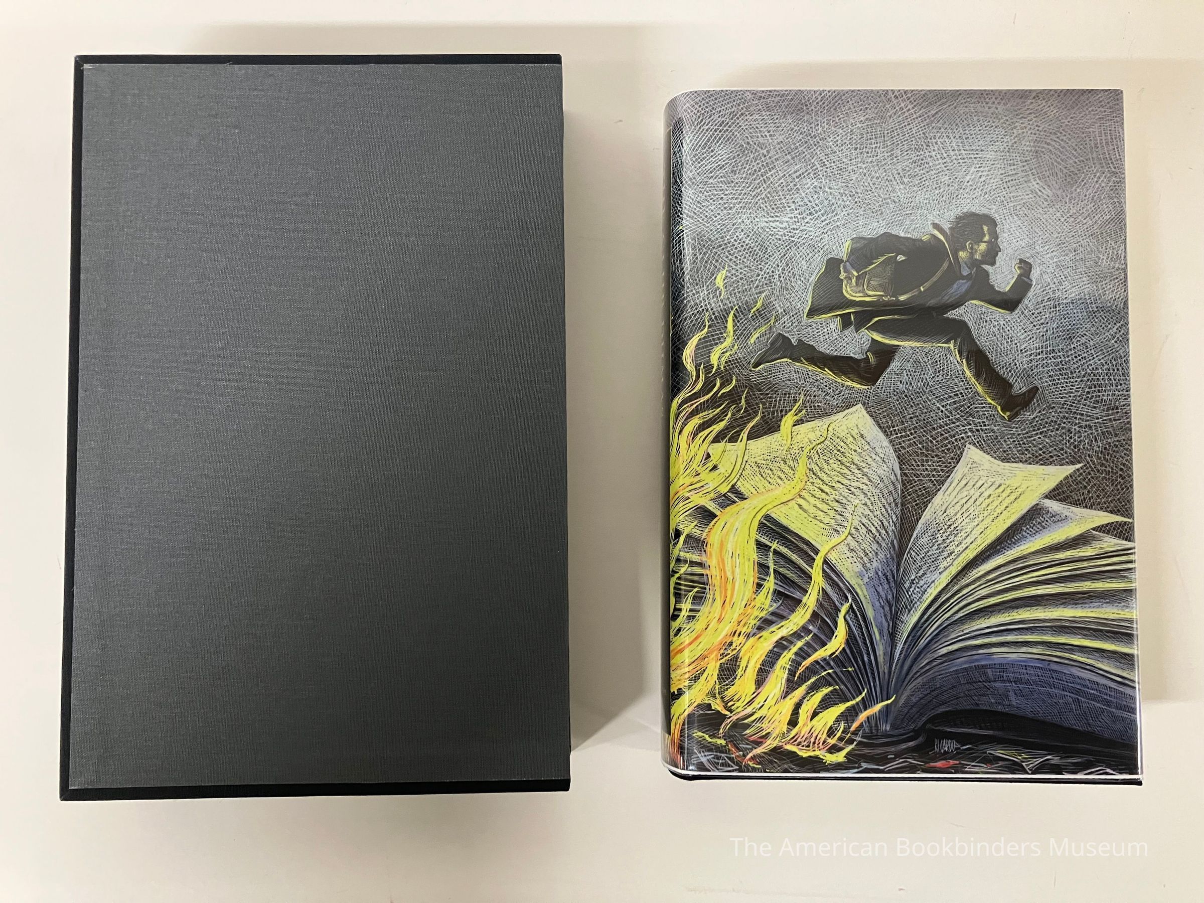 Slipcase with gray covers, with edges and spine dark gray. On spine is an inlay with book’s title, author, and illustration of a shadowy figure holding a book. On the back of the case is a man running, book under his arm. Dust jacket front shows the same man, with better lighting, running over an open book catching alight. The back shows a book and papers at sea, on fire, sinking down. Endpapers show library shelves with light falling perpendicular to the spines. Top edge is blacked out. 432p, with illustrations. Mylar dust protector. Magic square, using Roman numerals, under publishing information.
