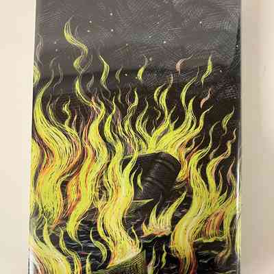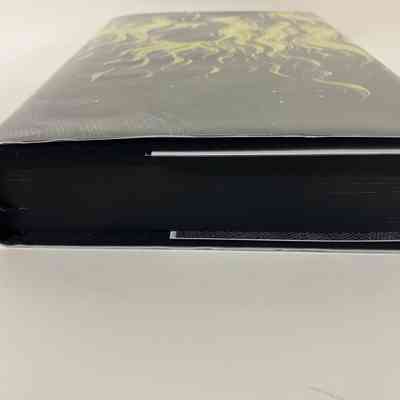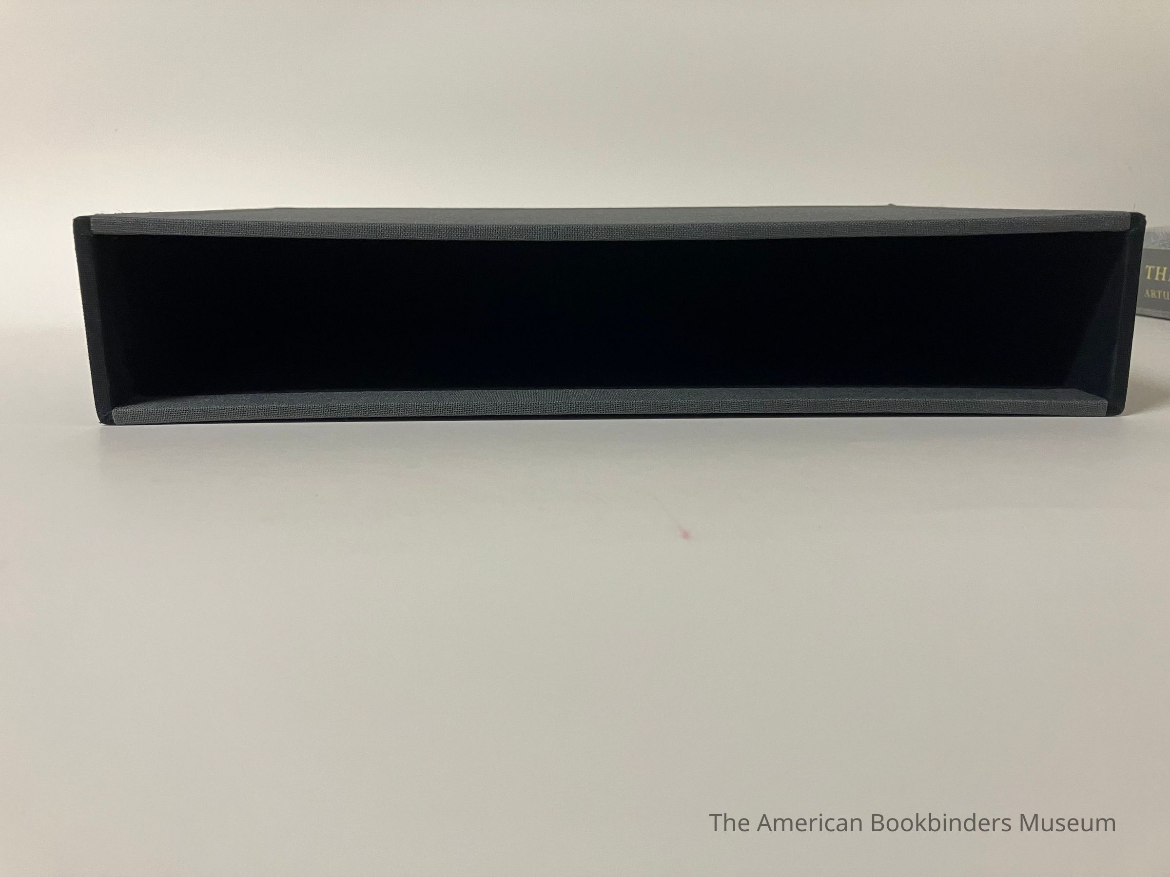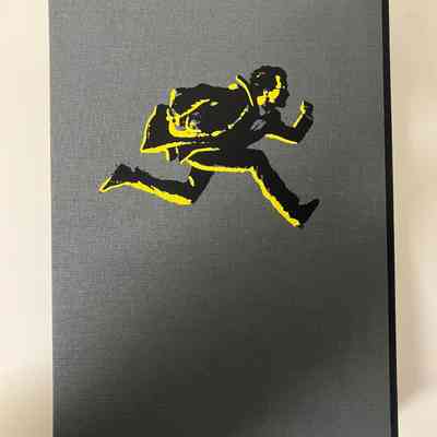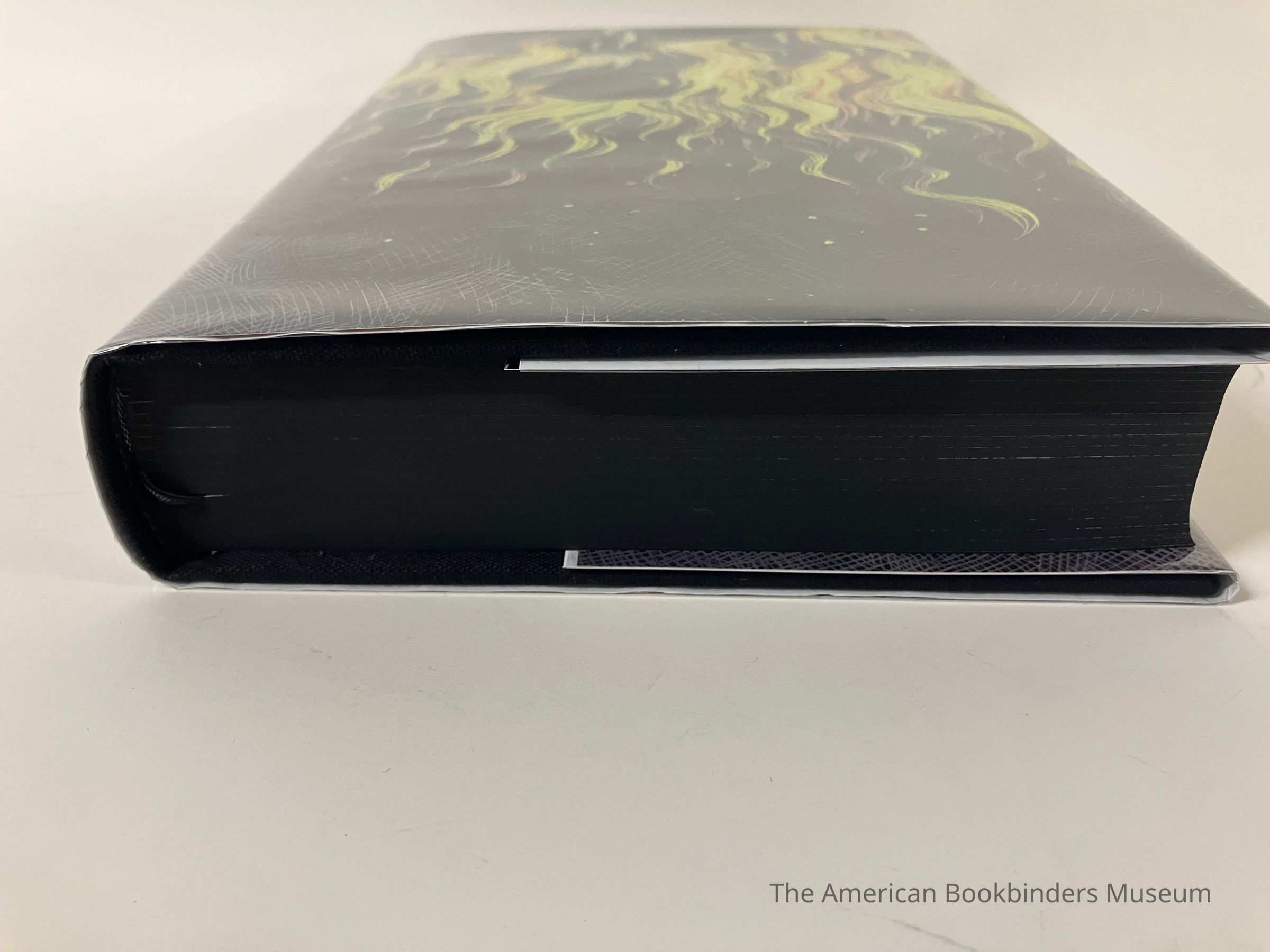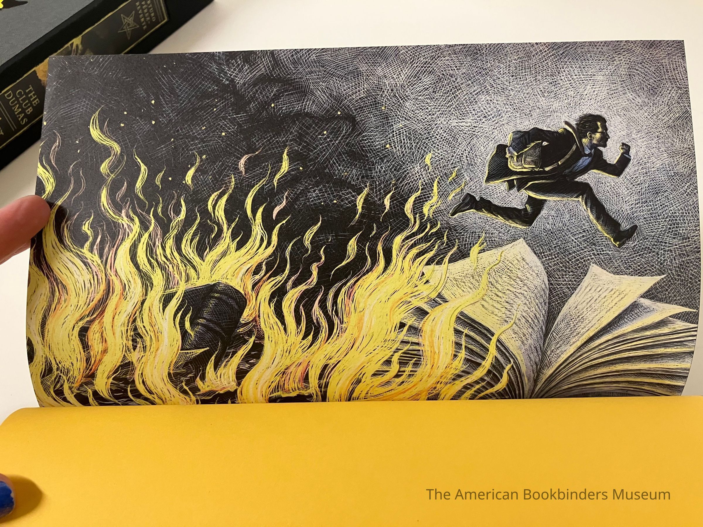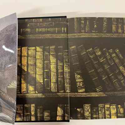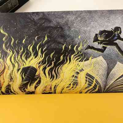 Slipcase with gray covers, with edges and spine dark gray. On spine is an inlay with book’s title, author, and illustration of a shadowy figure holding a book. On the back of the case is a man running, book under his arm. Dust jacket front shows the same man, with better lighting, running over an open book catching alight. The back shows a book and papers at sea, on fire, sinking down. Endpapers show library shelves with light falling perpendicular to the spines. Top edge is blacked out. 432p, with illustrations. Mylar dust protector. Magic square, using Roman numerals, under publishing information.