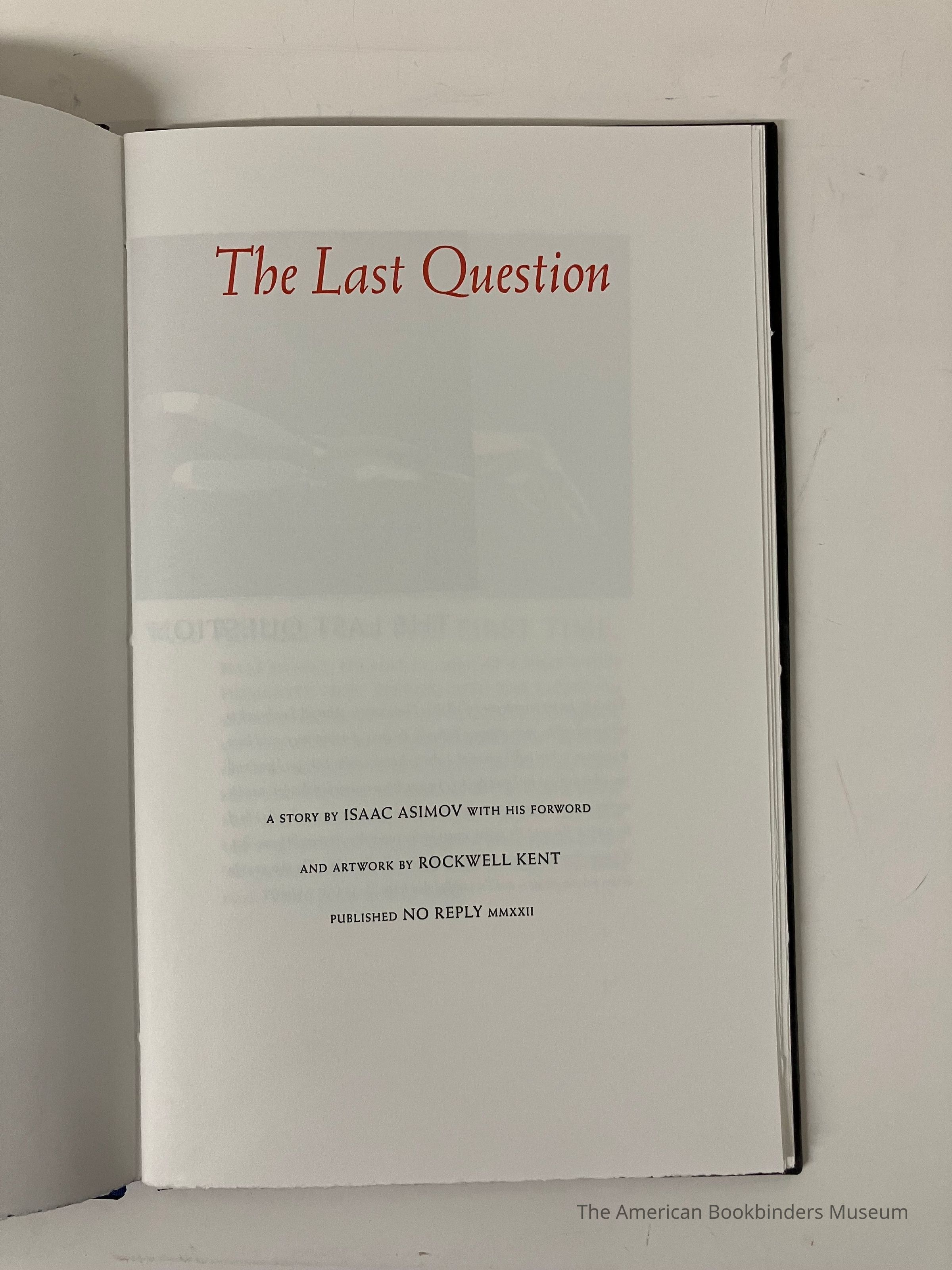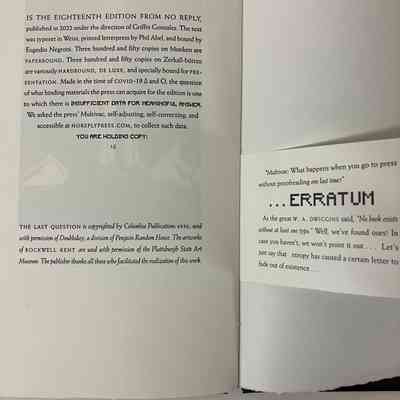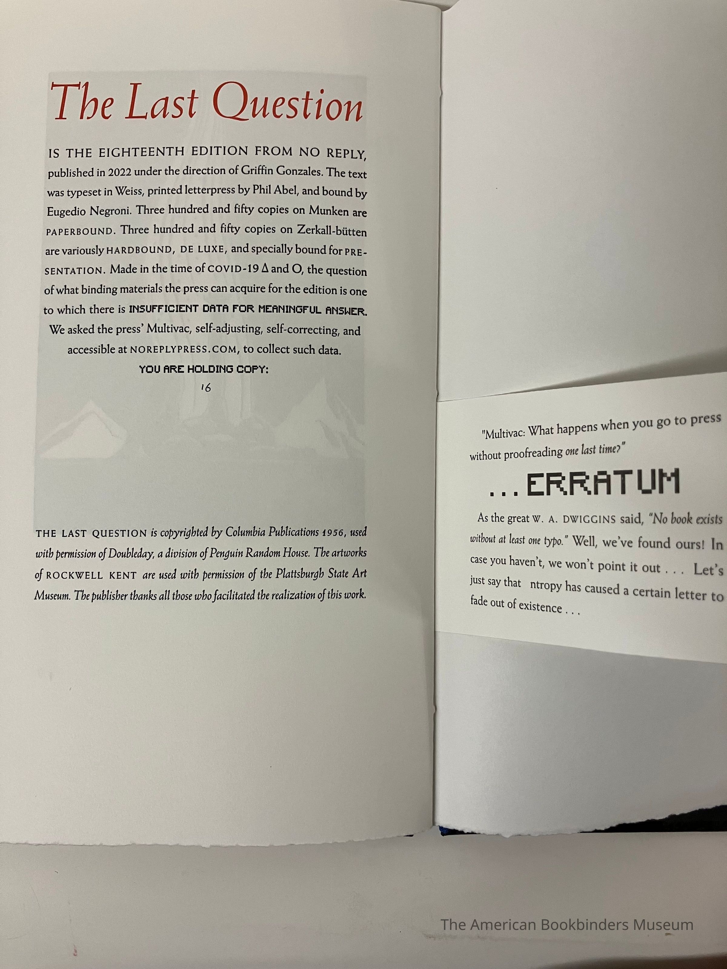 Colophon at back - 18th ed from No Reply, under direction of Griffin Gonzales. Typeset in Weiss, printed letterpress by Phil Abel, bound by Eugedio Negroni. 350 copies on Zerkall-bütten are variously hardbound, de luxe, and specially bound. Copy 16.
