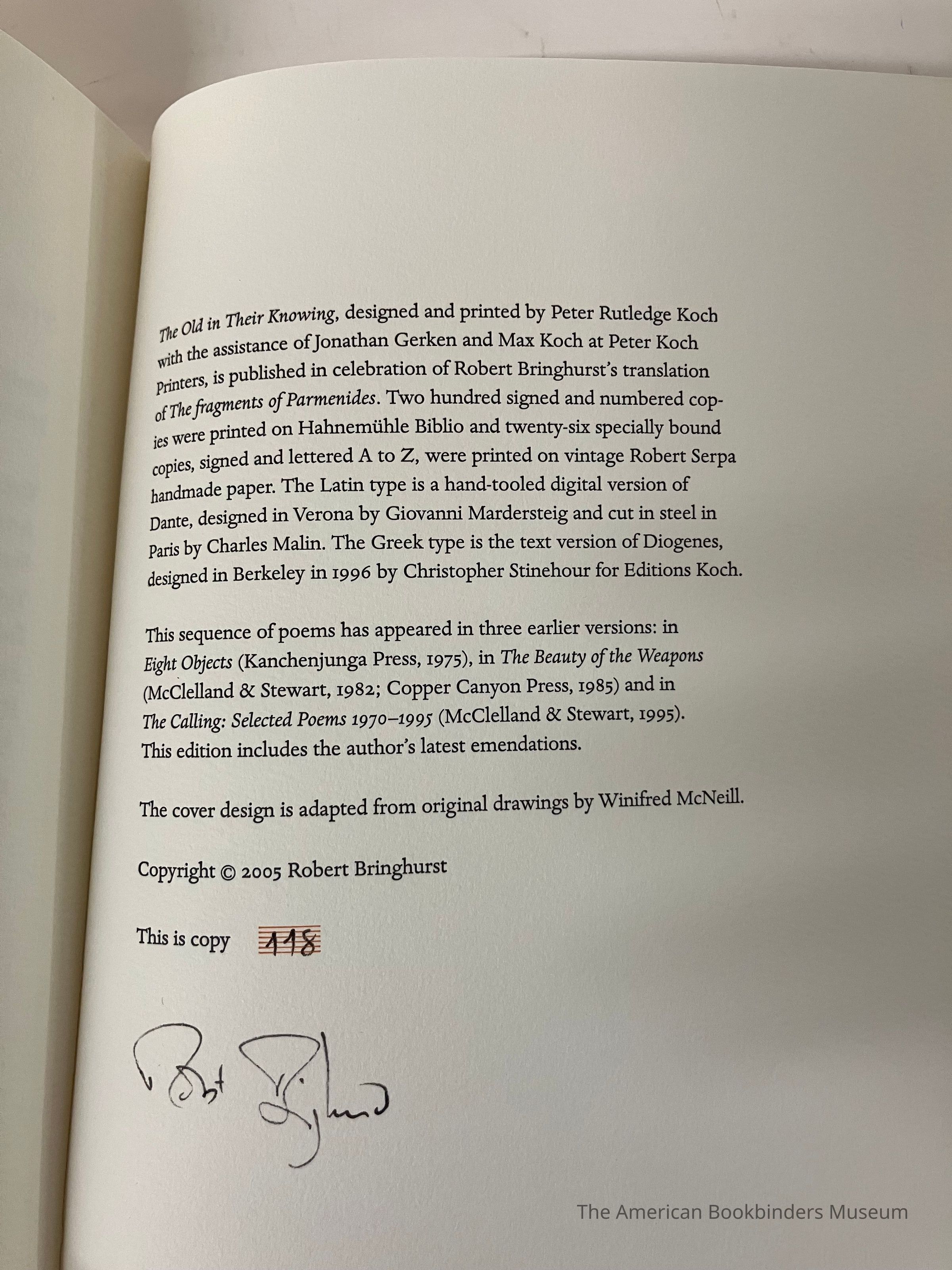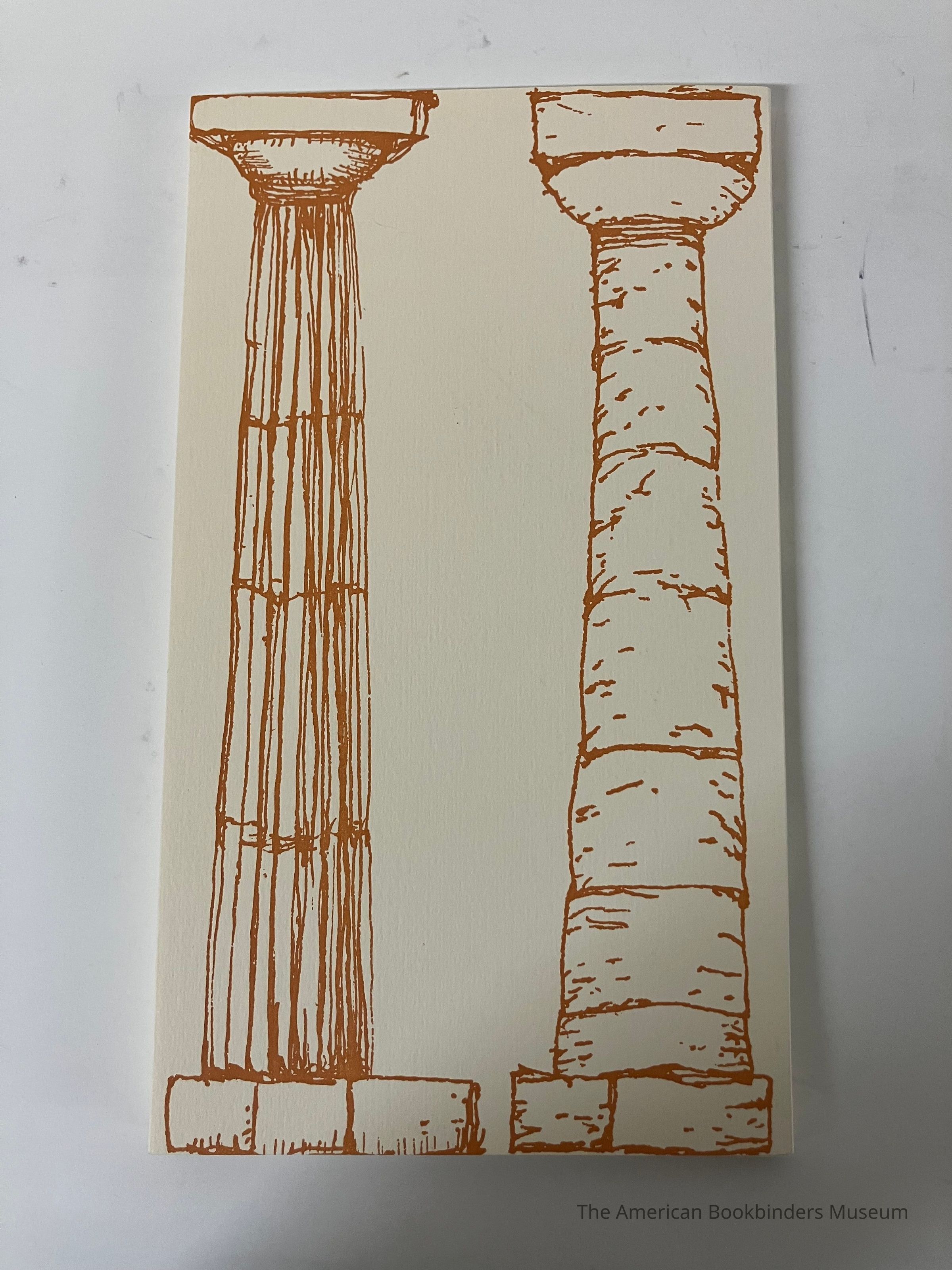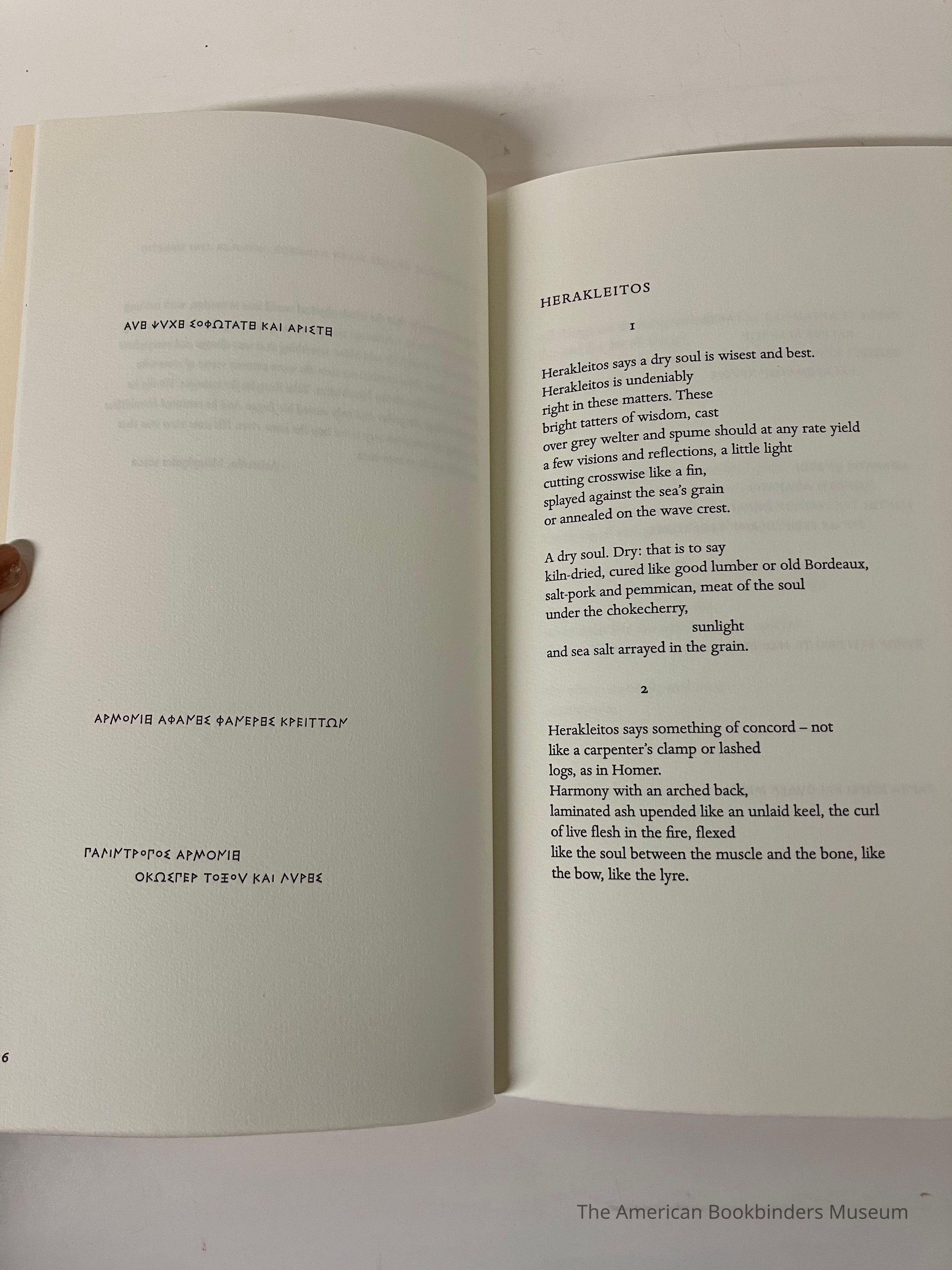 Colophon - designed and printed by Peter Rutledge Koch. 200 numbered copies have been printed on Hahnemühle Biblio paper, and 26 lettered copies. Hand-bound at the Peter Koch Printers by Jonathan Gerken. The English text is set in Giovanni Mardersteig’s Dante type and the Greek source texts are set in Christopher Stinehour’s Diogenes Greek. Letterpress printed wrappers with cover designs by Winifred McNeill.
