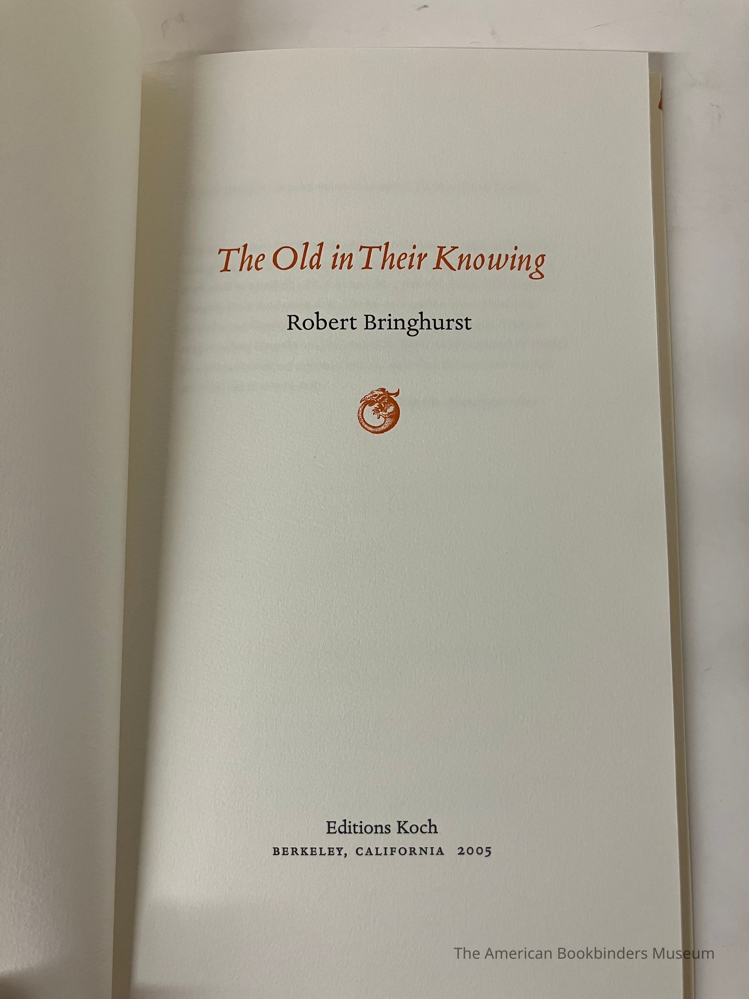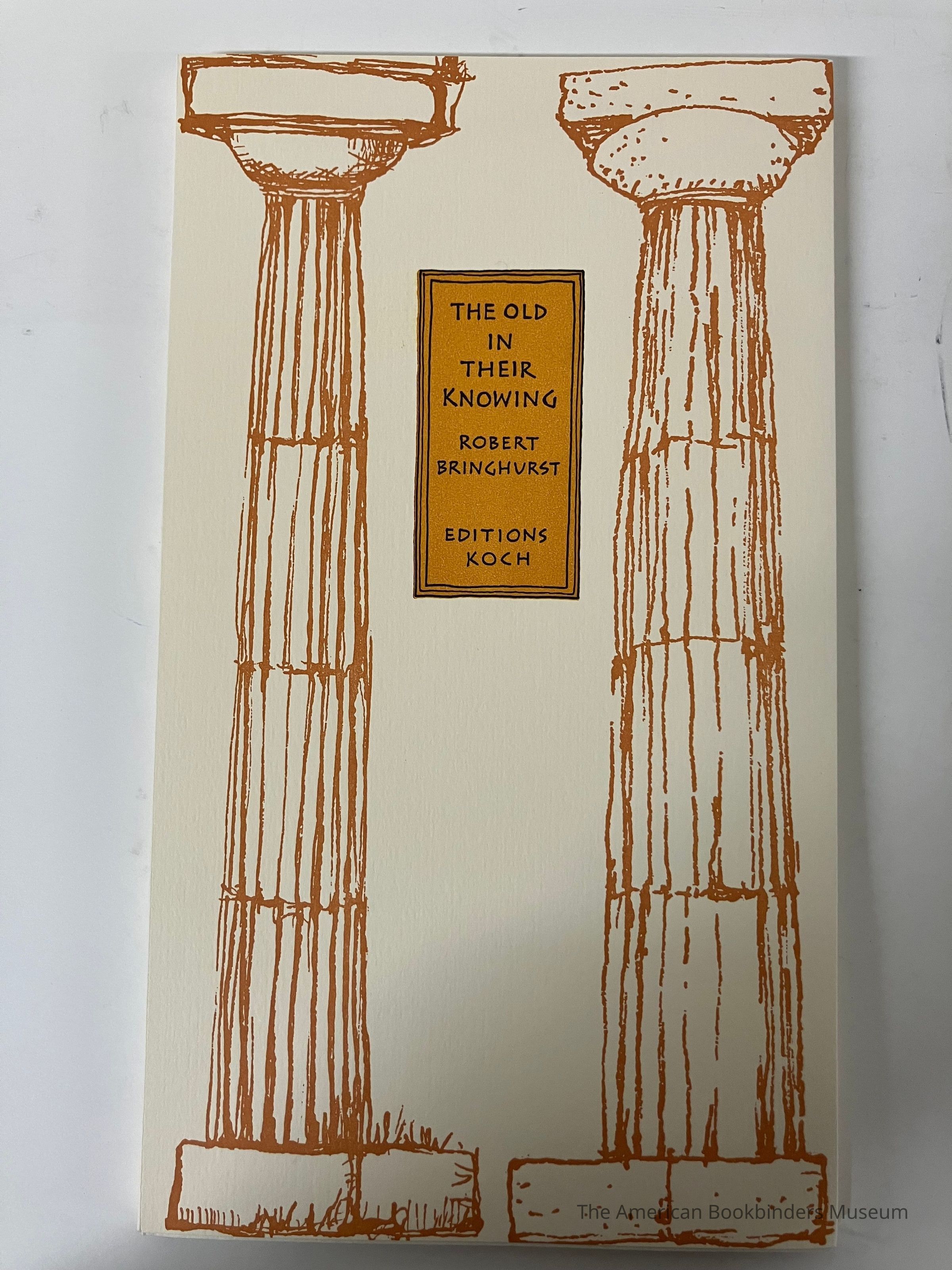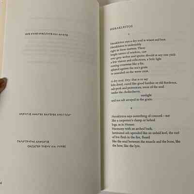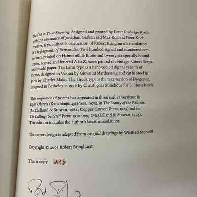 Colophon - designed and printed by Peter Rutledge Koch. 200 numbered copies have been printed on Hahnemühle Biblio paper, and 26 lettered copies. Hand-bound at the Peter Koch Printers by Jonathan Gerken. The English text is set in Giovanni Mardersteig’s Dante type and the Greek source texts are set in Christopher Stinehour’s Diogenes Greek. Letterpress printed wrappers with cover designs by Winifred McNeill.
