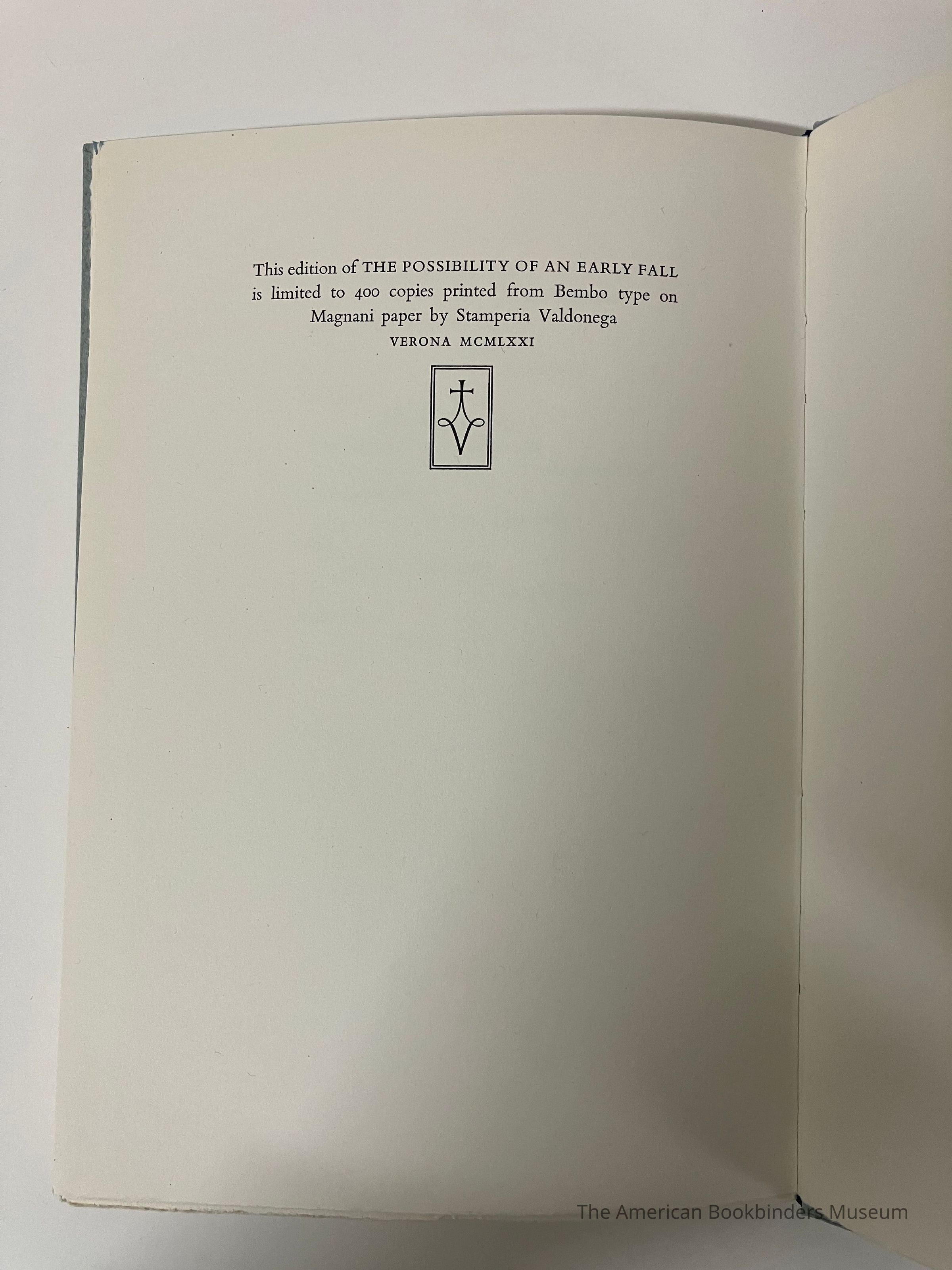 From colophon - printed form Bembo type on Magnani paper by Stamperia Valdonega, Verona, 1971.