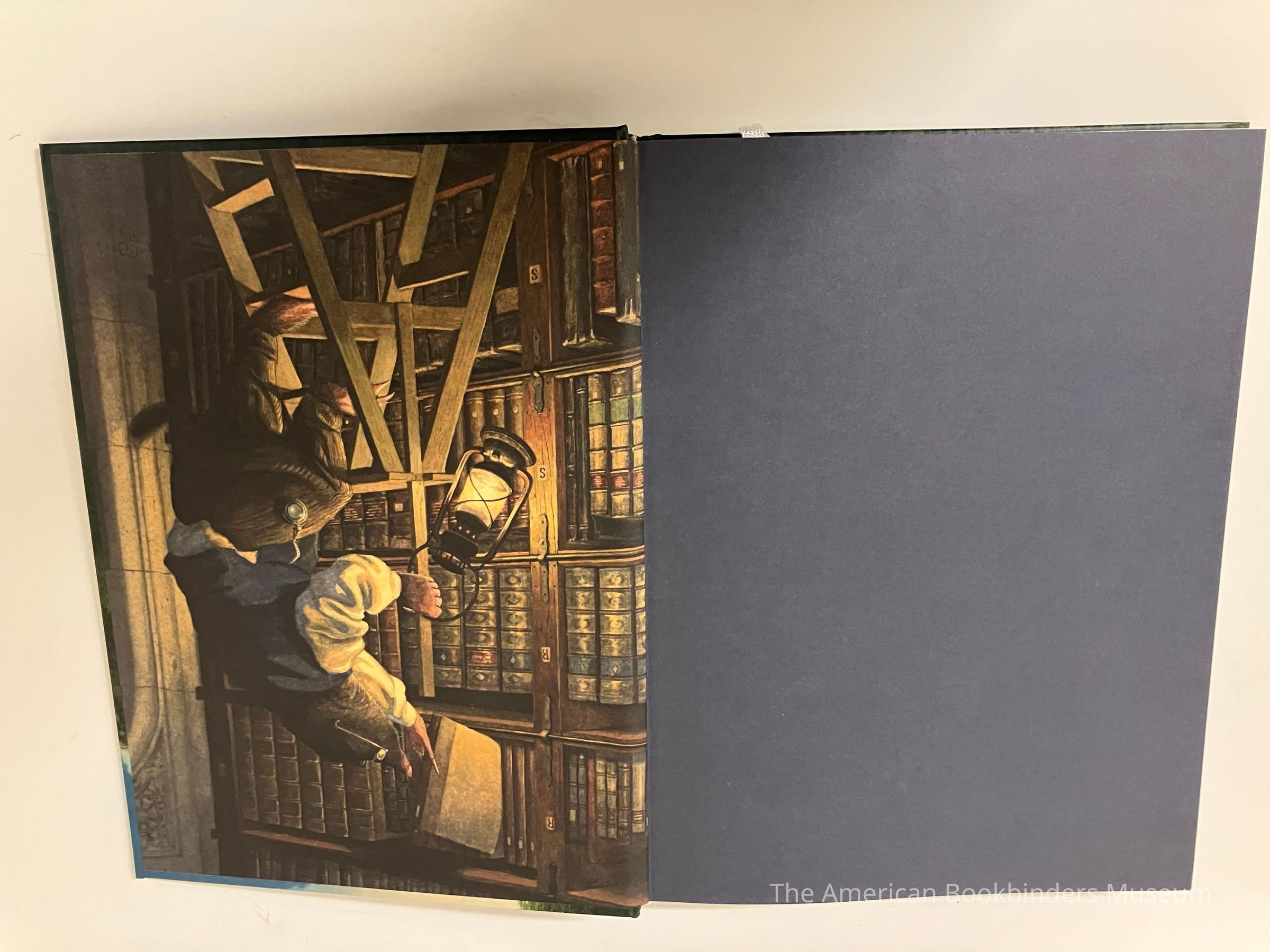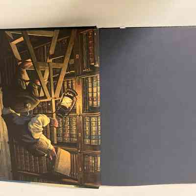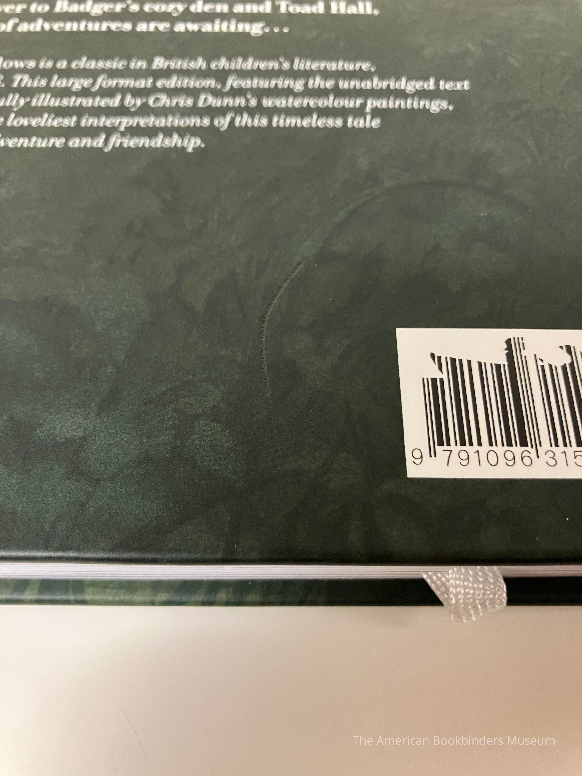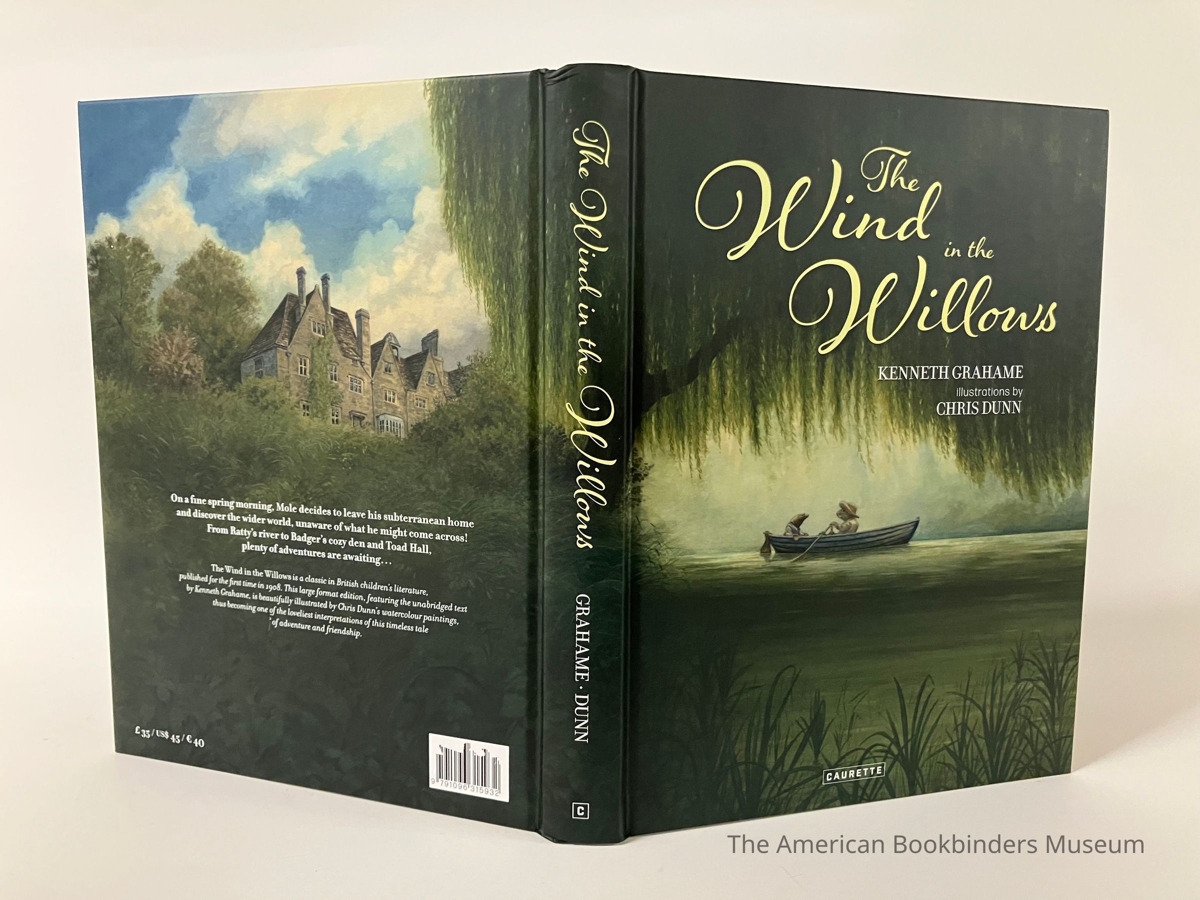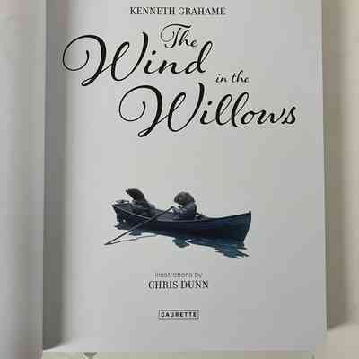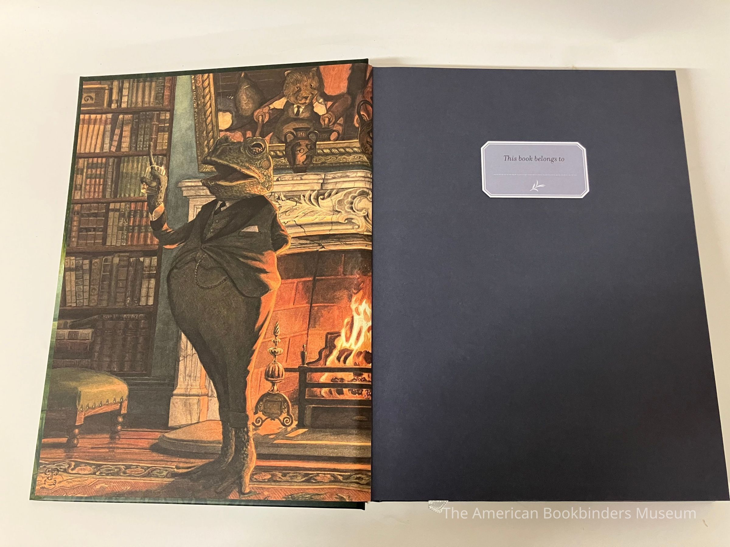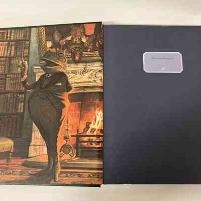 Front cover shows two frogs in a blue boat rowing down a river, with a weeping willows cover the top half of the frame and reeds along the bottom. Back cover continues the scene, with grasses along the bottom half and a large house at the top of the river bank. A synopsis in white also on the back cover. Front cover end page is Frog gesturing in his library in front a lit fireplace. Back end sheet is Mole shelving books, using a ladder, holding a lantern. White headbands. 260p, illustrated.Collection