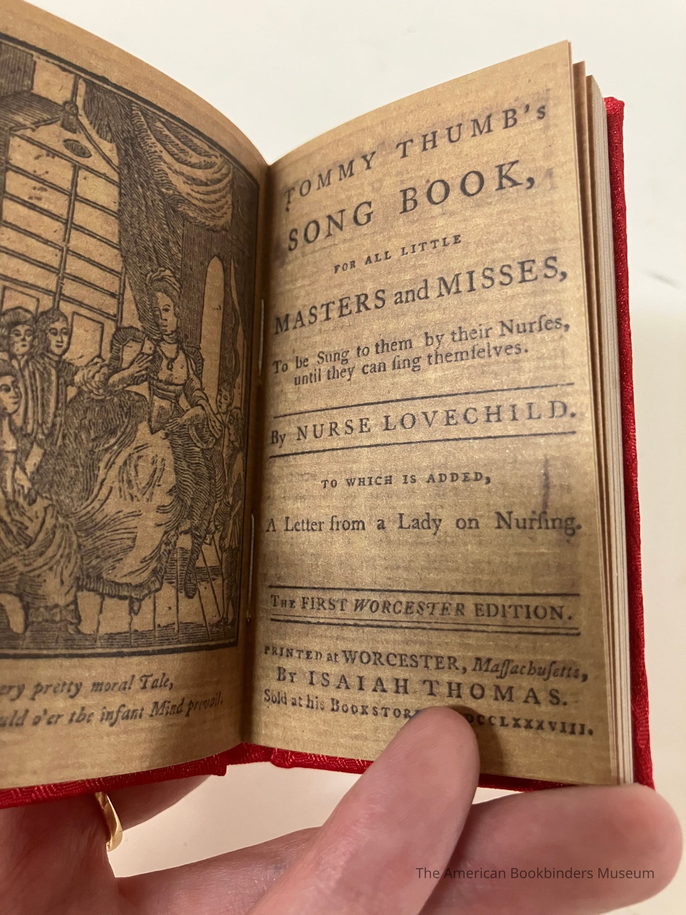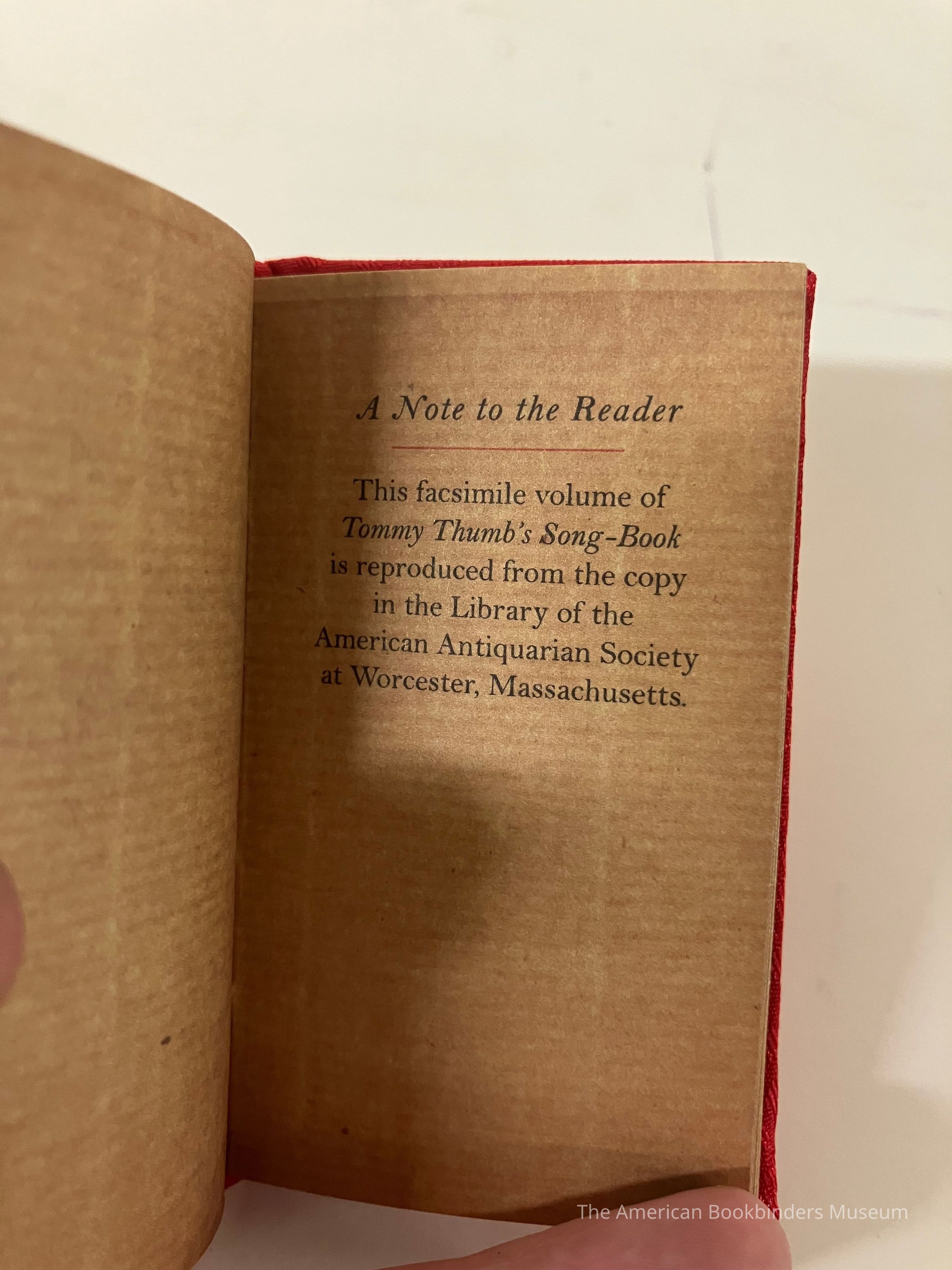 Facsimile reproduced from Library of the American Antiquarian Society. Red shiny cloth cover with gold title. Book of nursery rhymes.Collection