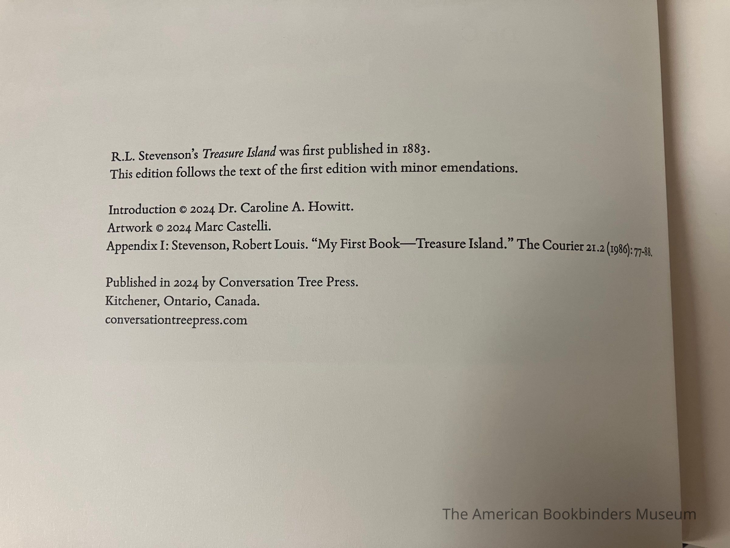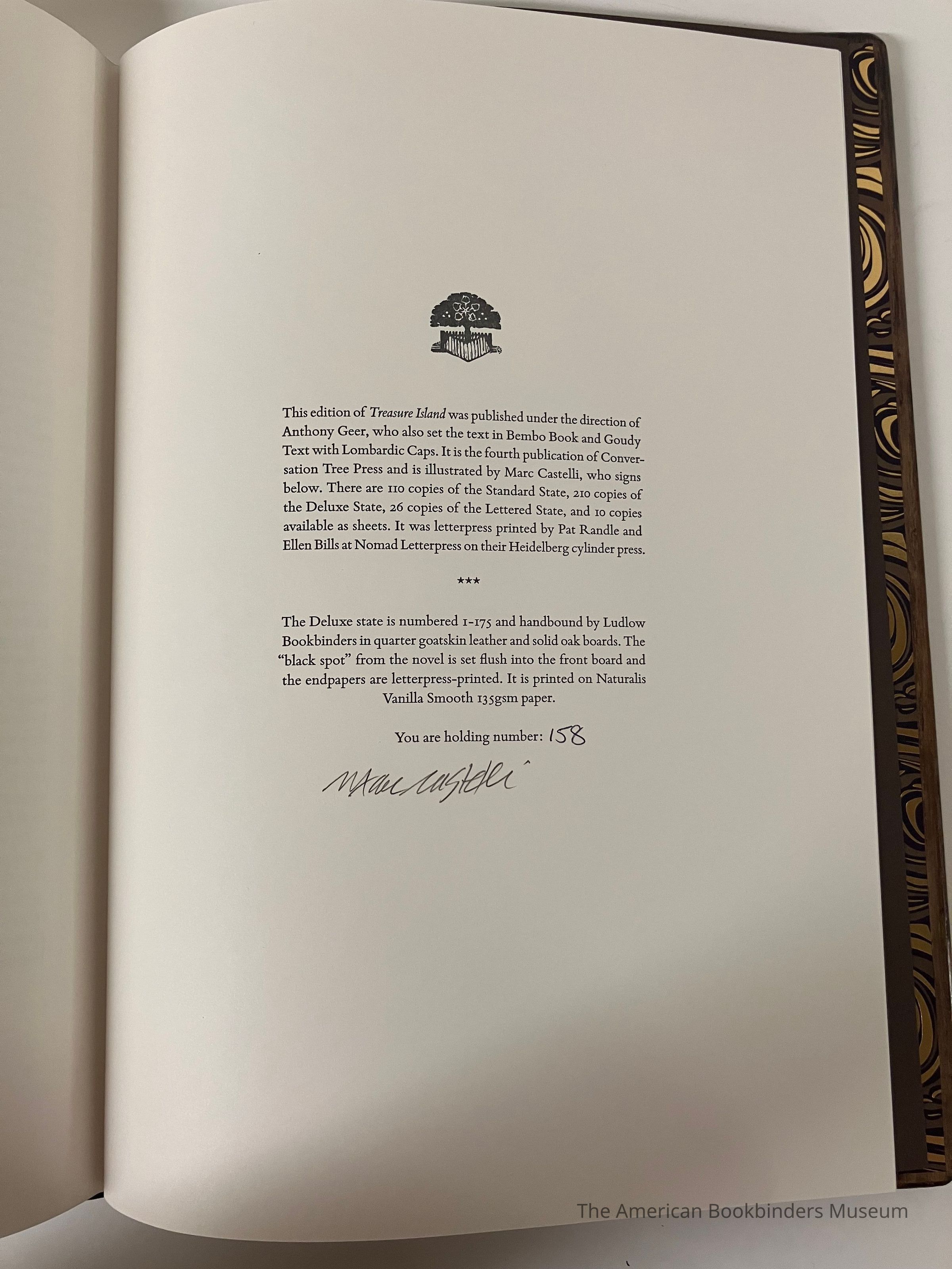 Colophon at back - published under direction of Anthony Greer, who set the text in Bembo Book and Goudy Text with Lombardic Caps. Fourth publication of Conversation Tree Press. 110 copies of the standard state, 210 copies of deluxe state, 26 copies of the lettered state, and 10 copies as sheets. Letterpress printed by Pat Randle and Ellen Bills at Nomad Letterpress on their Heidelberg cylinder press. Printed on Natualis Vanilla Smooth 135gsm paper.