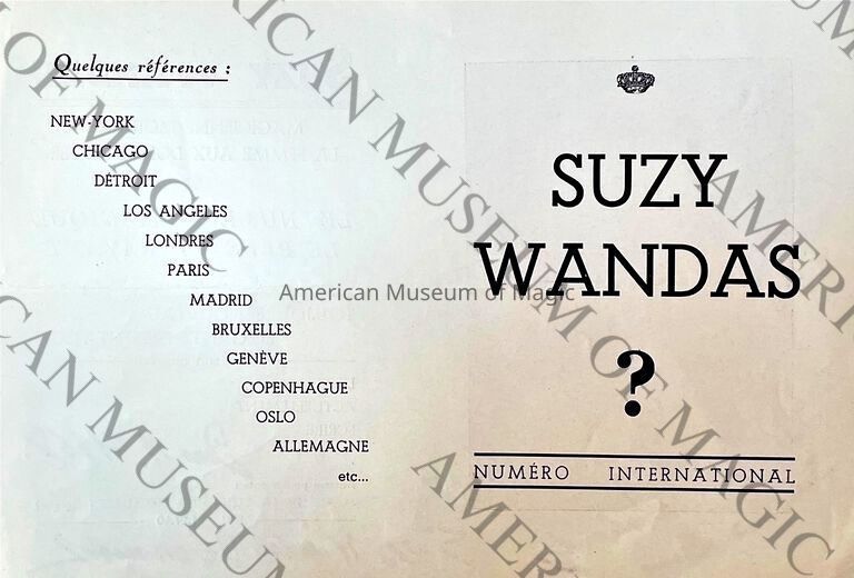 Born Jeanne Van Dyke in Brussels during 1896, was a magician who performed from the mid 1900's to Suzy Wandas was the child to magicians Charles-Louis and Elizabeth Steelandt Van Dyke, also known as Charles Wandas and Elizabath Wandas or the "Wandas Illusionists." From a young age, Suzy Wandas was trained to become a performer and by 1910 was assisting her parents with their acts, her first act being "The Devil's Dinner." Wandas toured with her family troupe until her father Charles-Louis died in 1911.