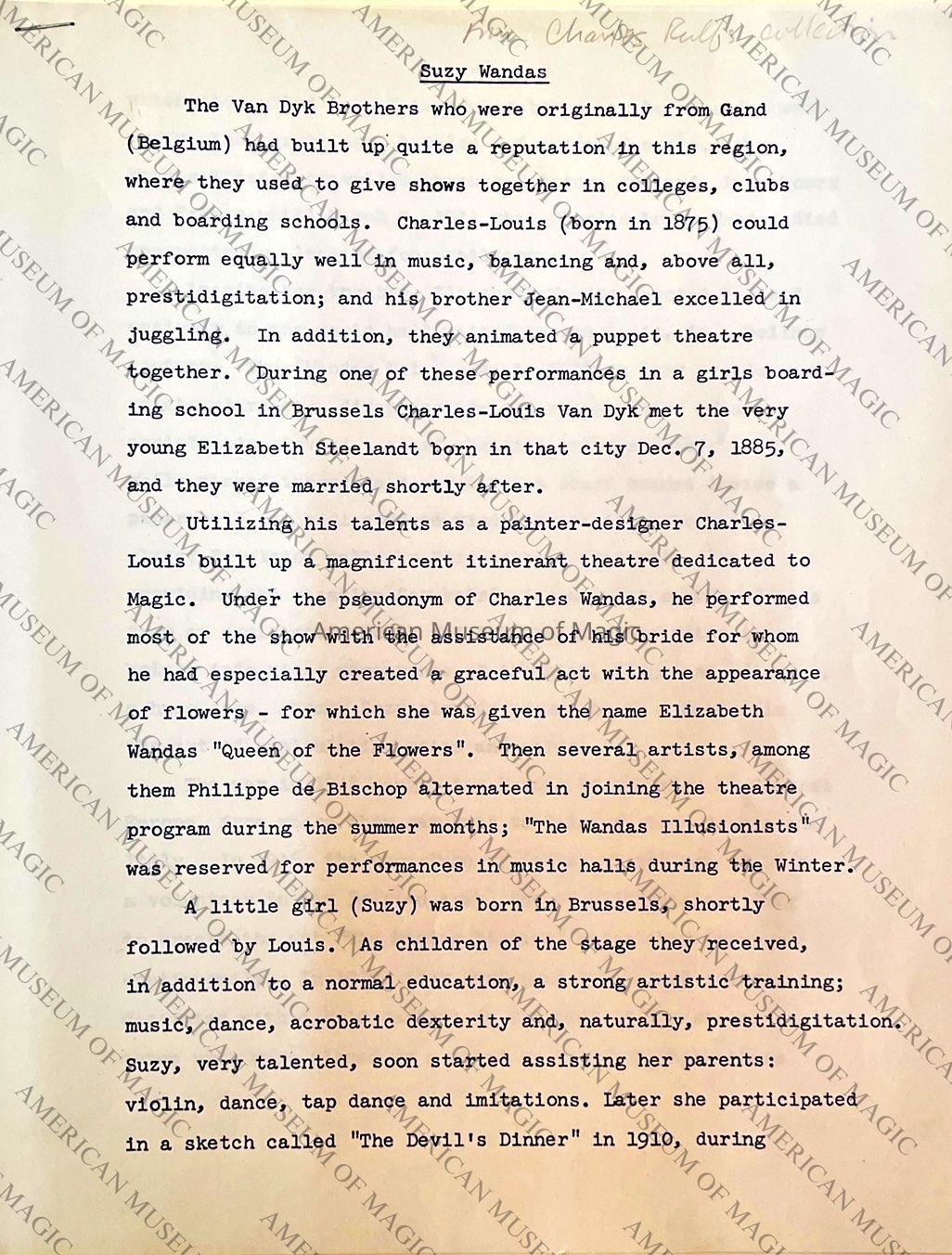 A 5-page typewritten biography on Suzy Wandas translated by Mrs. Françoise Tamnes from "Historie de la Prestidigitation."Use