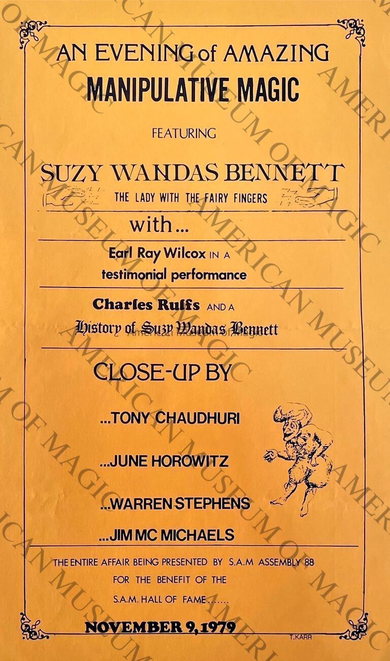 As a single performer, Suzy Wandas was awarded winner at the Magic Congress of Hastings along with the British Ring contest in 1952. During 1953 Suzy went on her first international tour to the United States. Wandas was also awarded the Performing Fellowship from the Academy of Magical Arts in 1981.Collection