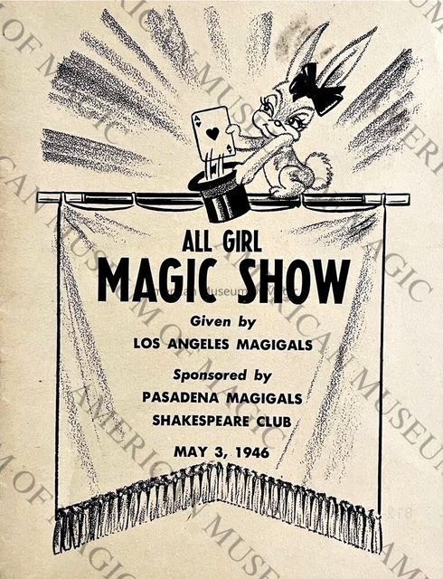 The Magigals were the first magic organization that was composed exclusively for women and was officially organized in 1939 with a mission to promote an interest of magic to women in Southern California. The Magigals soon after took wind, opening mupltiple chapters throughout the United States. The Magigals first President was Geraldine Larsen, who acted as President until 1960. Carolyn Task was Vice-President, and Theresa Leon was Secretary. The Magigals disbanded in 2001 and merged with the Pacific Coast Association of Magicians.Collection