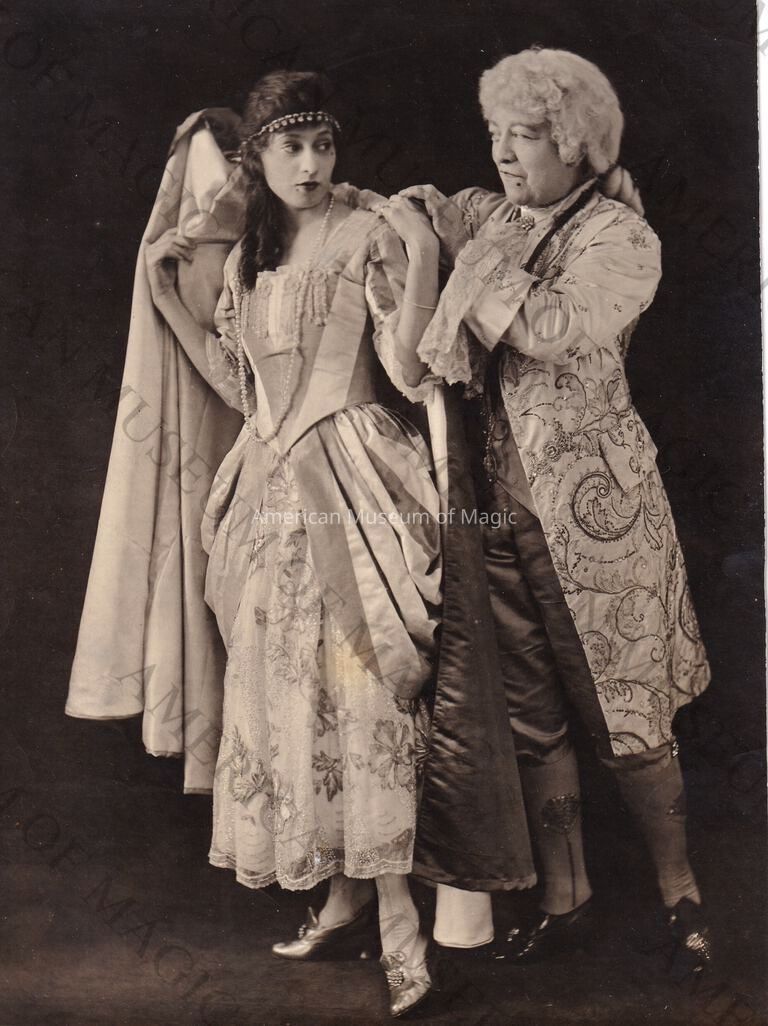 Born Adelaide Scarez in England in 1853, Adelaide was originally a mime and serpentine dancer before marrying magician Alexander Herrmann in 1875. Adelaide was trained by Alexander and became his principal assistant, performing together throughout many tours both nationally and internationally. After her husbands death in 1895, Adelaide briefly performed together with her nephew, Leon Herrmann. Shortly after, Adelaide performed as a solo magician until 1928, in her 70's. Adelaide during her career had performed several illusions, her most well-known acts were her "Phantom Bride" "Noah's Ark" and bullet catching acts. She passed away in 1932 at the age of 79.Collection