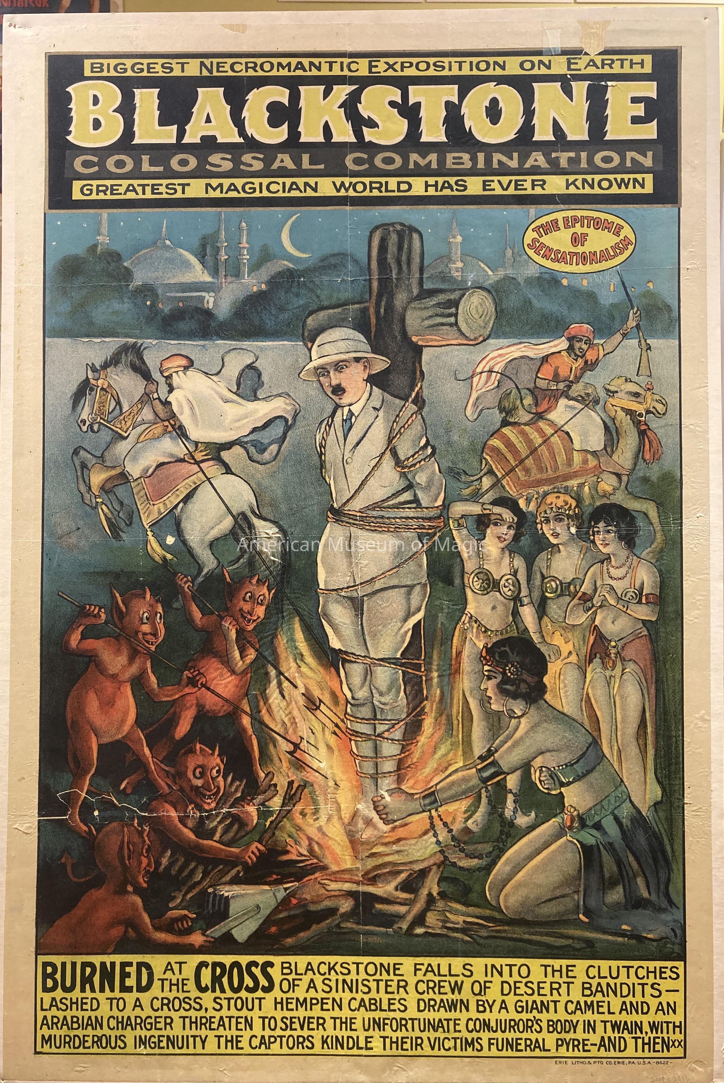 "Blackstone - Colossal Combination" poster. Picture of man being burned on cross by devils and exotic women. Men on horseback in background. "Biggest Necromantic Exposition on Earth...Burned at the Cross."Collection