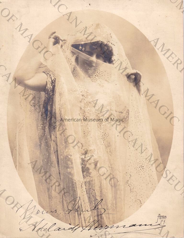 Born Adelaide Scarez in England in 1853, Adelaide was originally a mime and serpentine dancer before marrying magician Alexander Herrmann in 1875. Adelaide was trained by Alexander and became his principal assistant, performing together throughout many tours both nationally and internationally. After her husbands death in 1895, Adelaide briefly performed together with her nephew, Leon Herrmann. Shortly after, Adelaide performed as a solo magician until 1928, in her 70's. Adelaide during her career had performed several illusions, her most well-known acts were her "Phantom Bride" "Noah's Ark" and bullet catching acts. She passed away in 1932 at the age of 79.