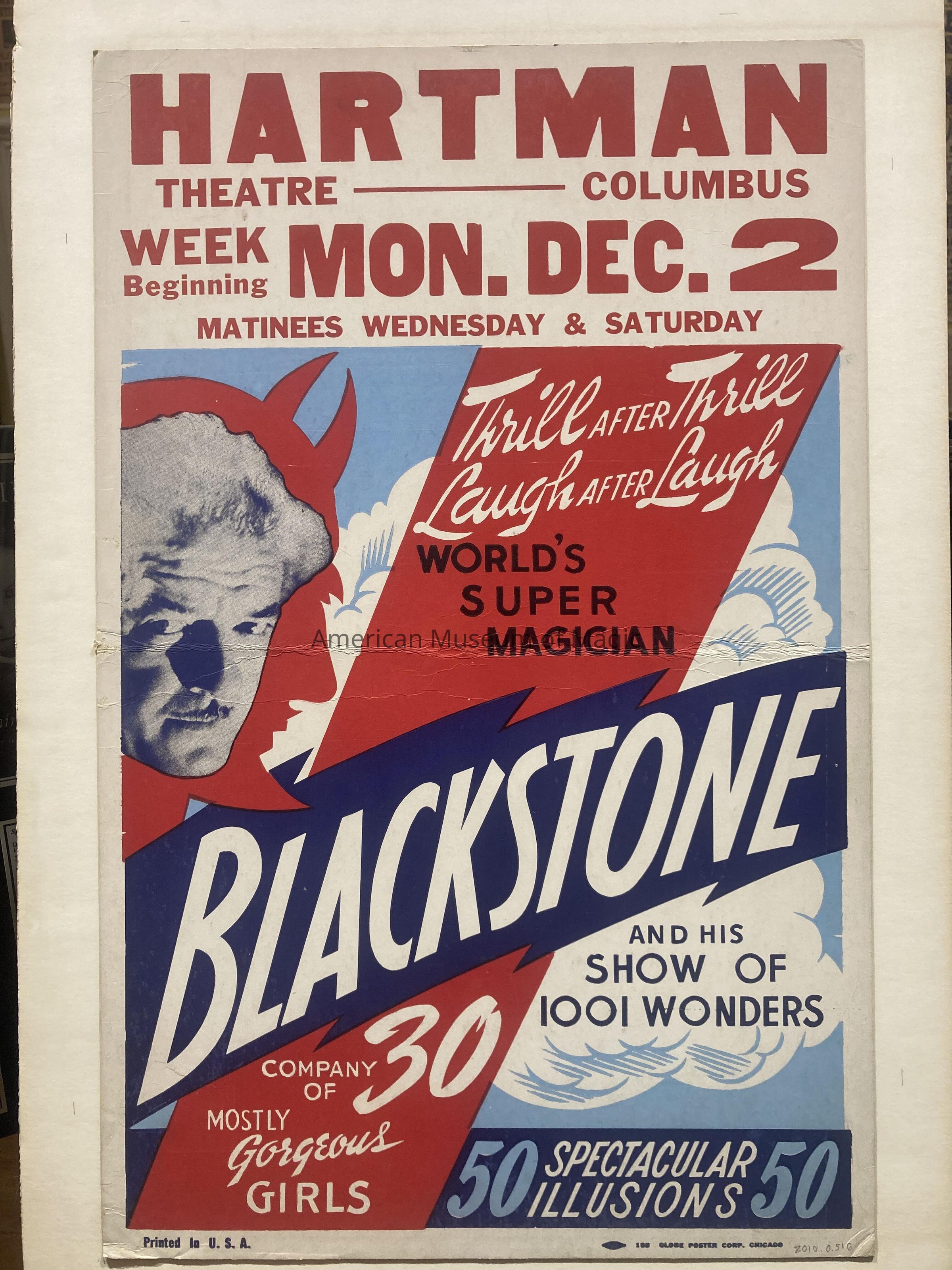 "Blackstone and His Show of 1001 Wonders" Poster. Hartman Theatre, Columbus. Week beginning Monday, December 2. "Thrill After Thrill. Laugh After Laugh. World's Super Magician...Company of 30 Mostly Gorgeous Girls. 50 Spectacular Illusions." White background with red, dark and light blue type and highlights. Black and white image of Blackstone's head on left side. Poster mounted on foam core backing.Collection