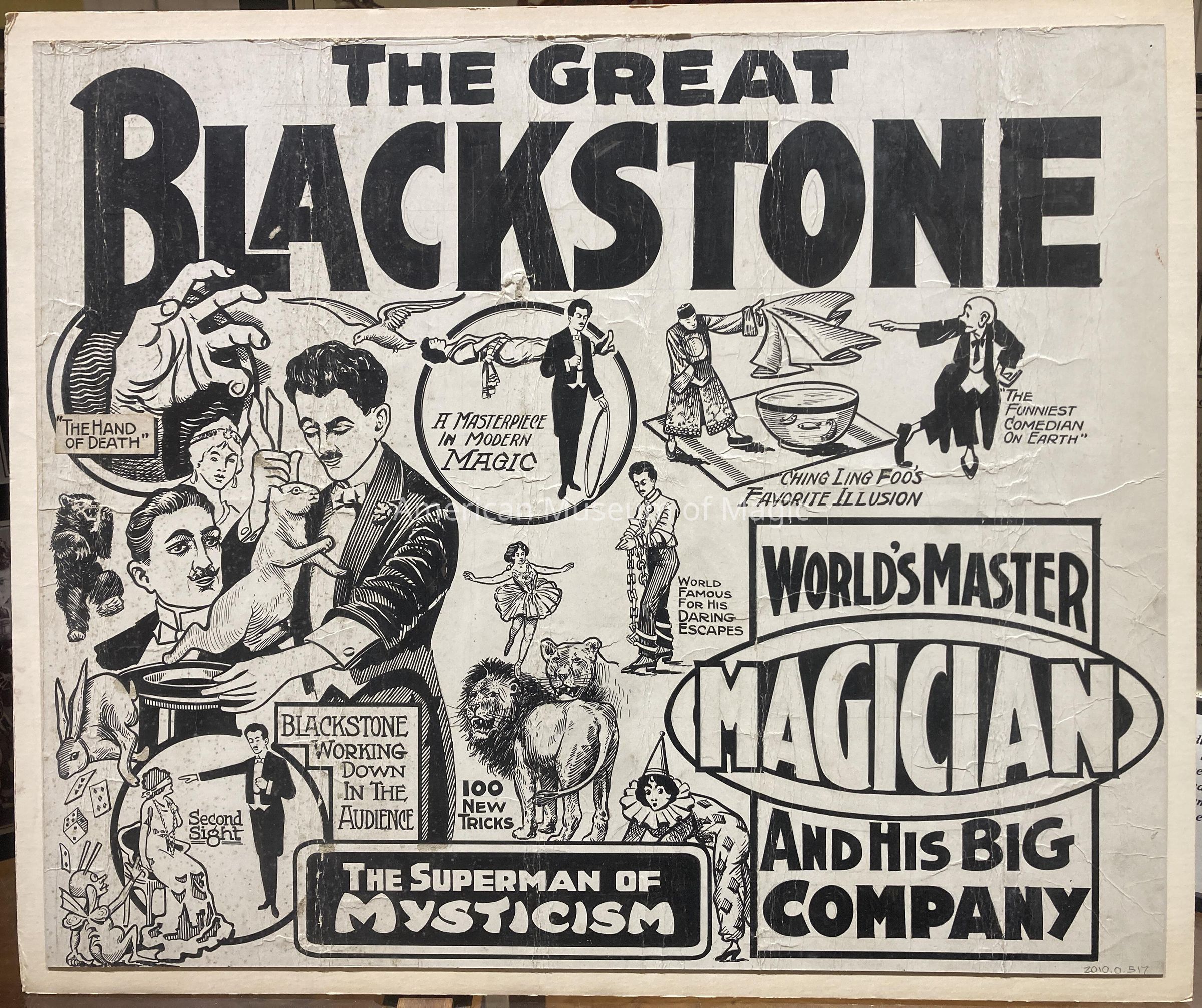 "The Great Blackstone" Poster. "World's Master Magician and His Big Company....The Superman of Mysticism." White background with black type and black drawings of Blackstone's performances. Poster mounted on foam core backing.