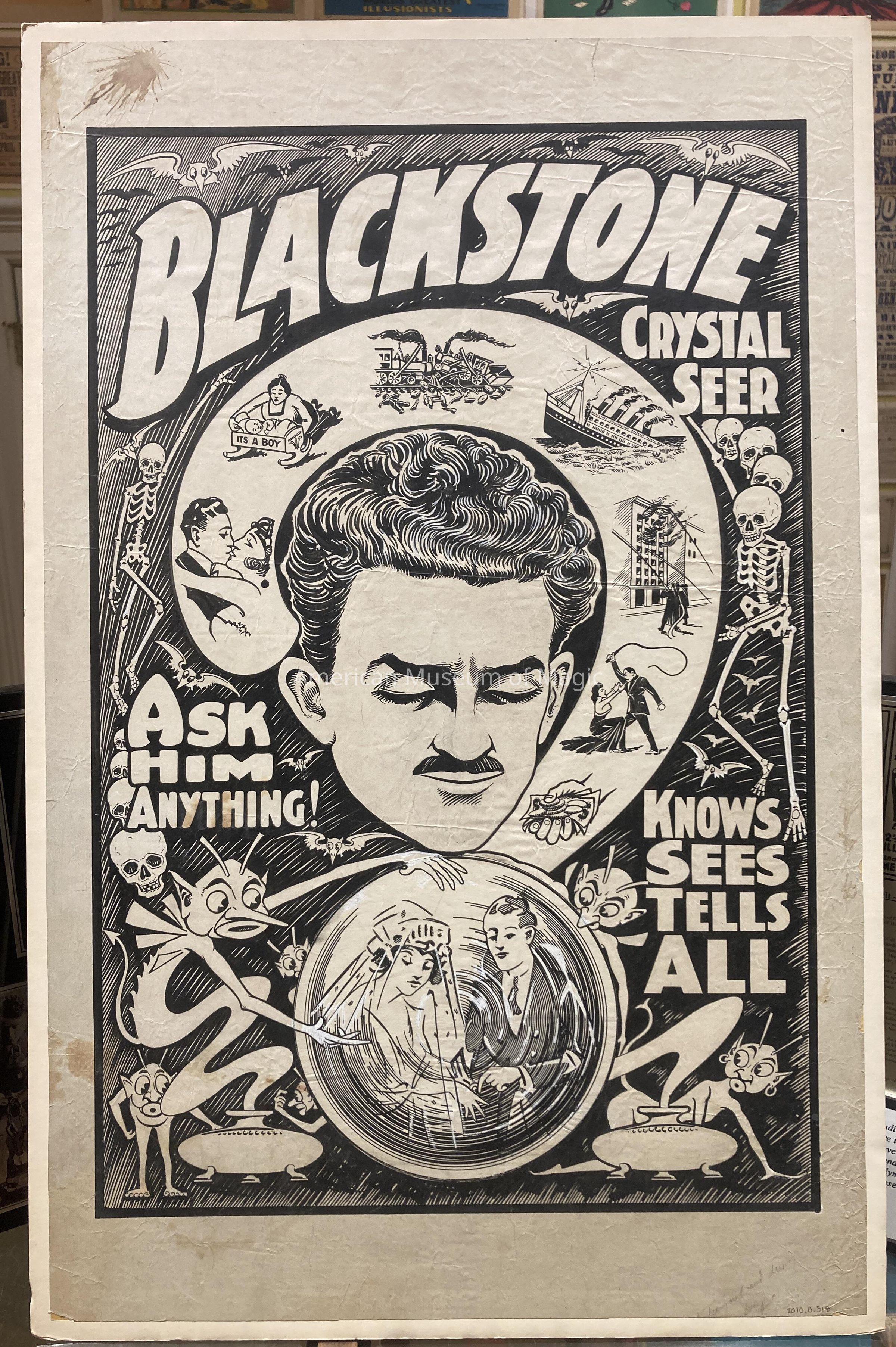 "Blackstone, Crystal Seer" Poster. "Ask Him Anything! Knows, Sees, Tells All!" White background with black artistry and white type. Poster mounted on foam core backing.