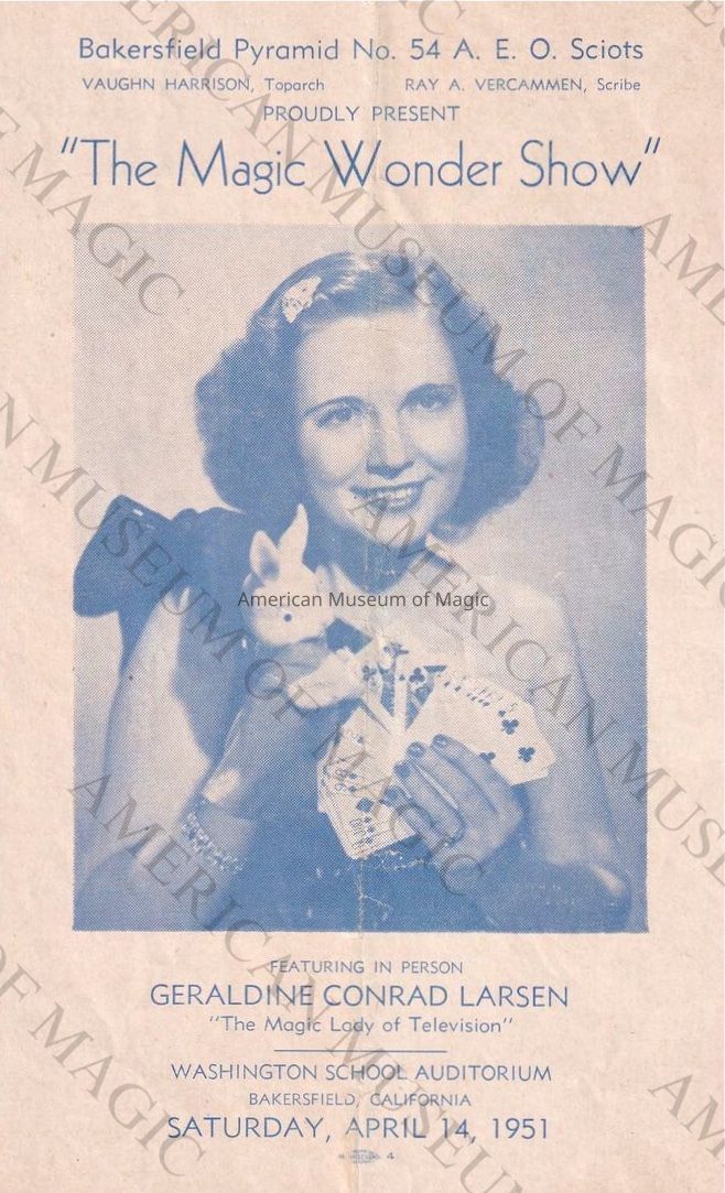 Born in 1906, Geraldine Larsen was a magician, author, TV personality, and editor. Larsen was the daughter of Samuel Conrad, a builder of illusion and magic performance materials. Larsen began performing magic around the 1930's and in 1939 was the first women to appear on television performing magic. Later on in the 1950's, Larsen began hosting her own show called "The Magic Show" on ABC. Larsen also contributed in organizing the first women's magic club called the "Magigals" and was the club's first President. Larsen has written several books, such as "Peterkin the Magic Rabbit," "The Diary of a Magician's Wife." "Nothing Up Her Sleeve," and "Murdered by the Devil." Larsen was also the editor of Genii, a magazine focused on magic. Larsen passed away in 1998 at the age of 92.Collection