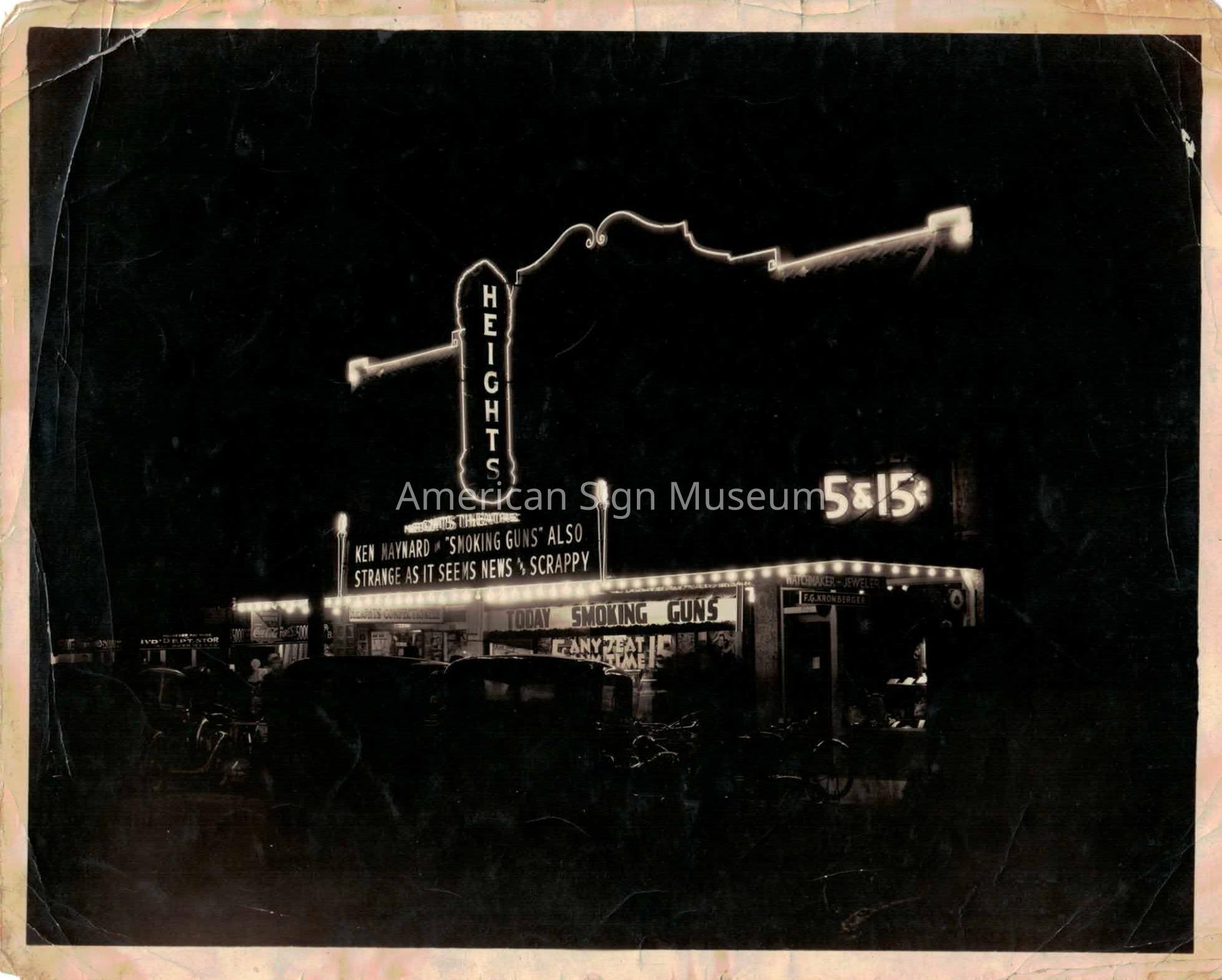 B&W photograph of 1940-1950s neon theatre marquee, the Heights Theatre, taken at night.