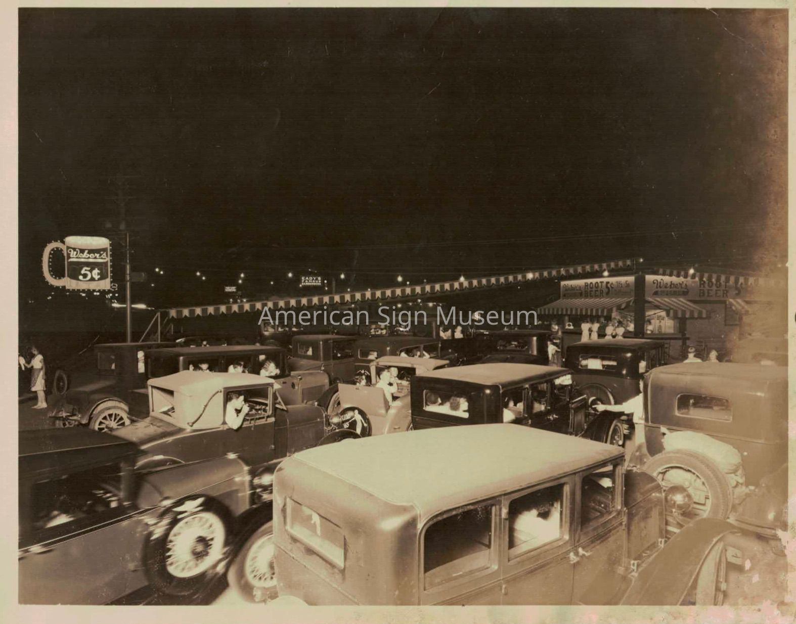 B&W photograph of early neon signs: Weber's Root Beer Stand. Also features 1930s automobiles and figures.Collection