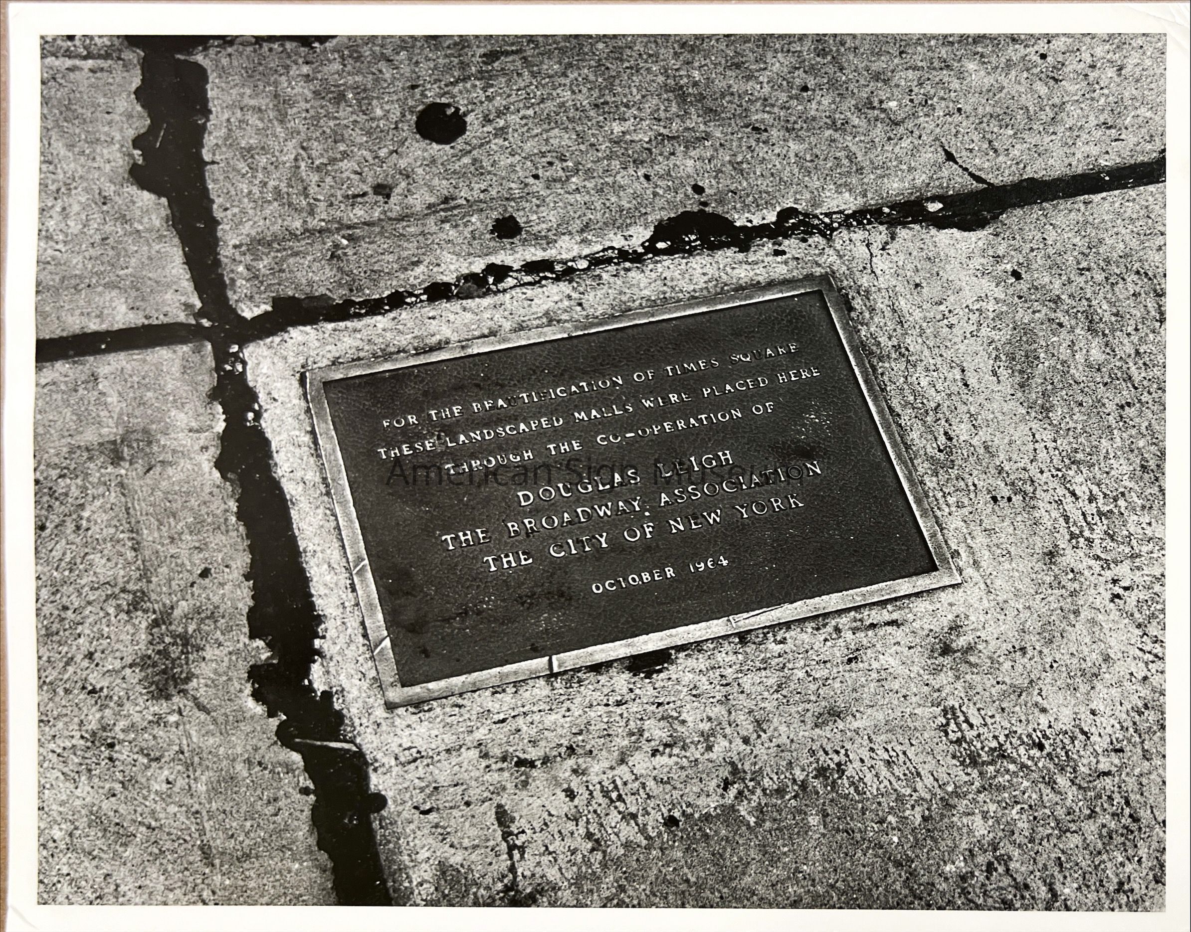 B&W photograph of plaque reading: "For the Beautification of Times Square These Landscaped Malls Were Placed Here Through the Co-Operation of Douglas Leigh, The Broadway Association, The City of New York. October 1964."Collection
