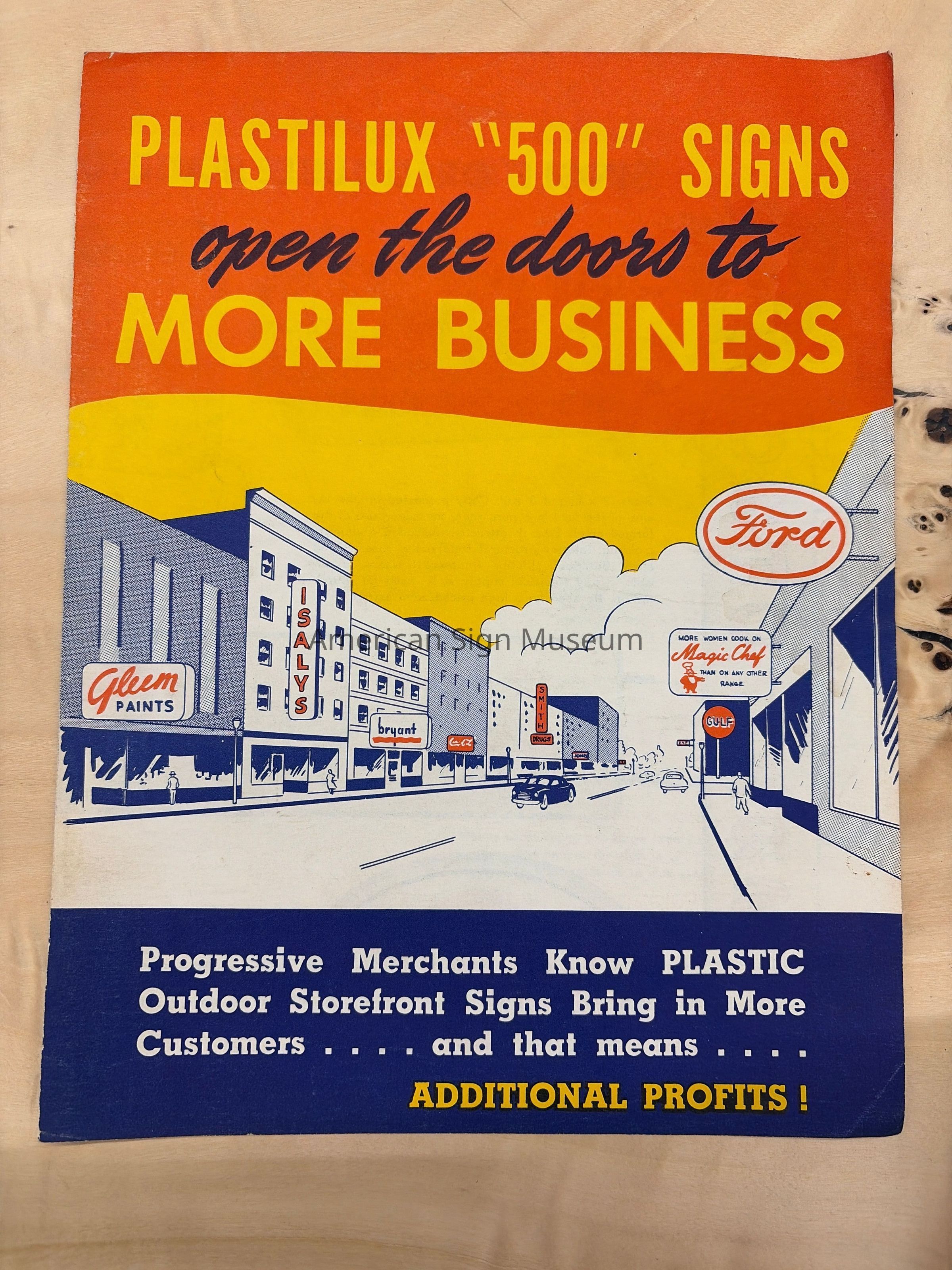 "Plastilux '500' Signs open the doors to more business" catalog from Neon Products Co. Four pages; three-color.Collection