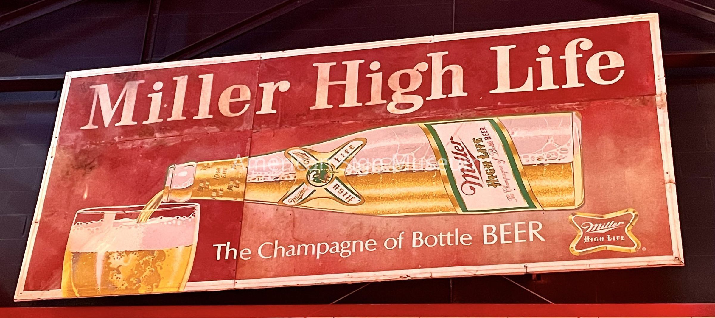 Screen-printed bulletin for Miller High Life is composed of four individual rectangular metal sections with return on edge. It was originally located on a farm in Oshkosh, WI and was mounted on wood stringers. It unfortunately blew down in a storm and was never re-installed, but instead placed in a barn.Collection