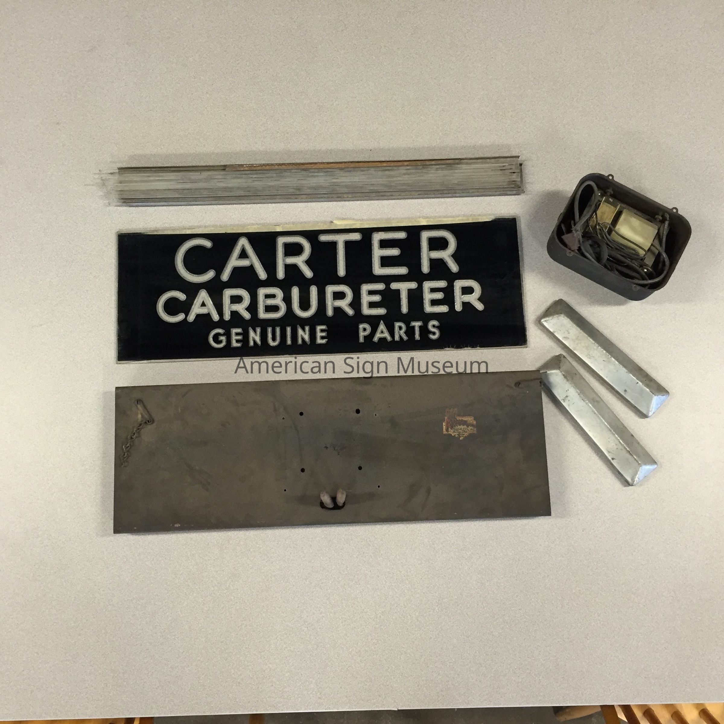 Carter Carburetor counter-top sign has two glass faces: the back one is clear and the forward one is reverse screen-printed. Very thin glass rods are placed between the glass faces and edge-lit top and bottom by neon tubes.Collection