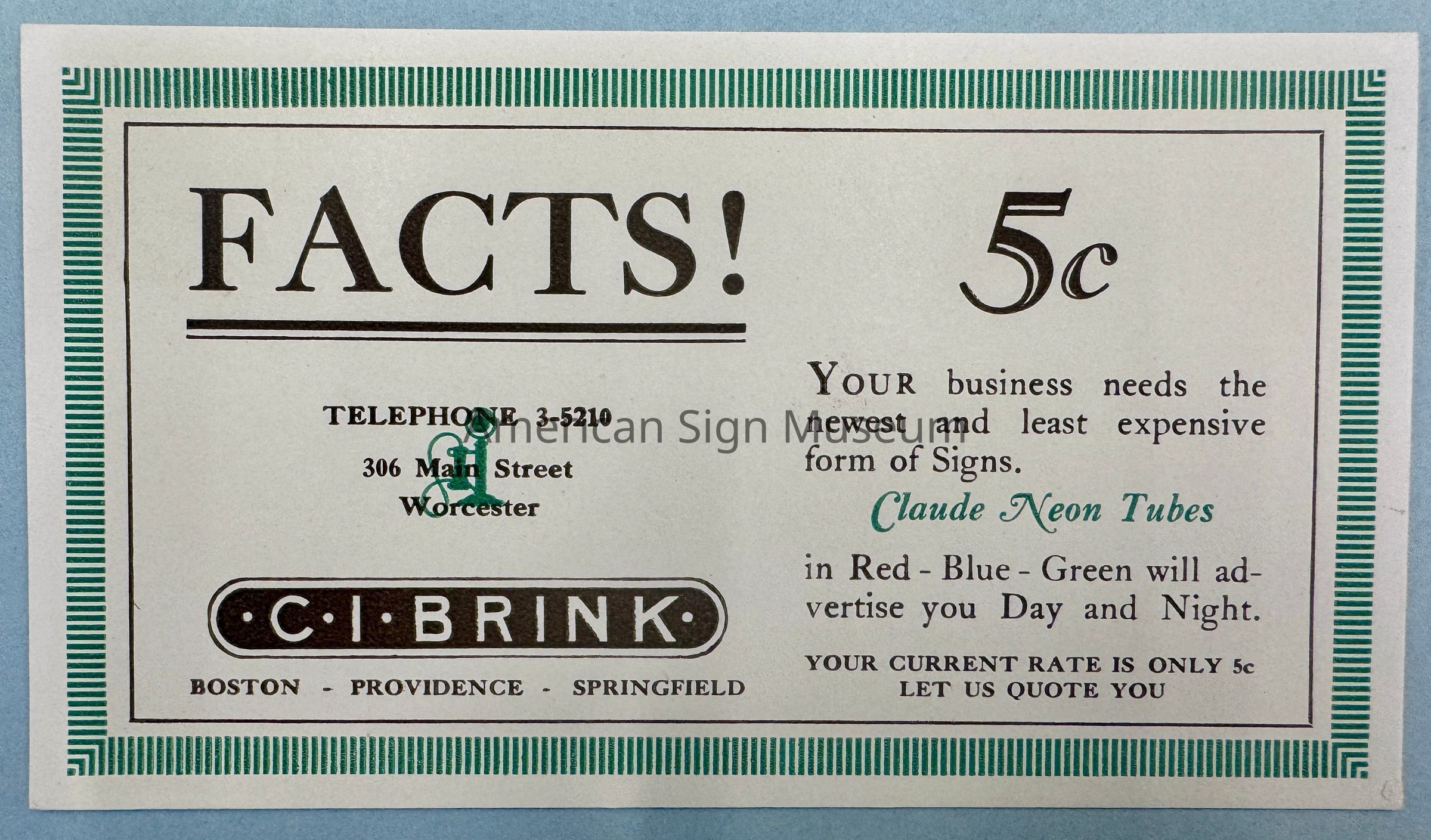 C.I. Brink blotter is two-color card for this Boston/Providence/Springfield, MA-based company that sold Claude Neon products.Collection