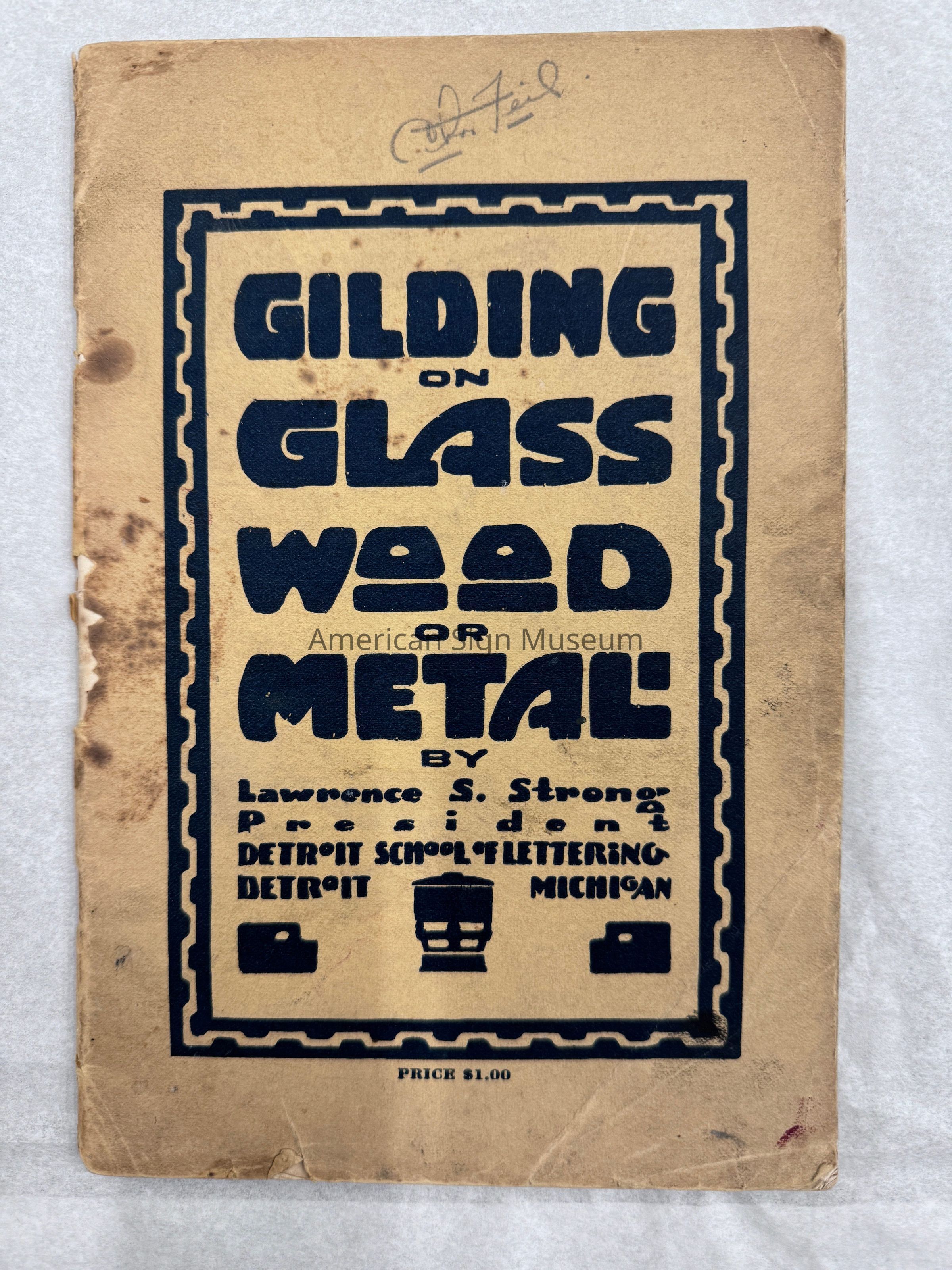 "Gilding on Glass, Wood or Metal" by Lawrence S. Strong. Published by Detroit School of Lettering, Detroit, MO: 1923.Softbound with separate cover; B&W line drawings and ads; 40 pagesCollection
