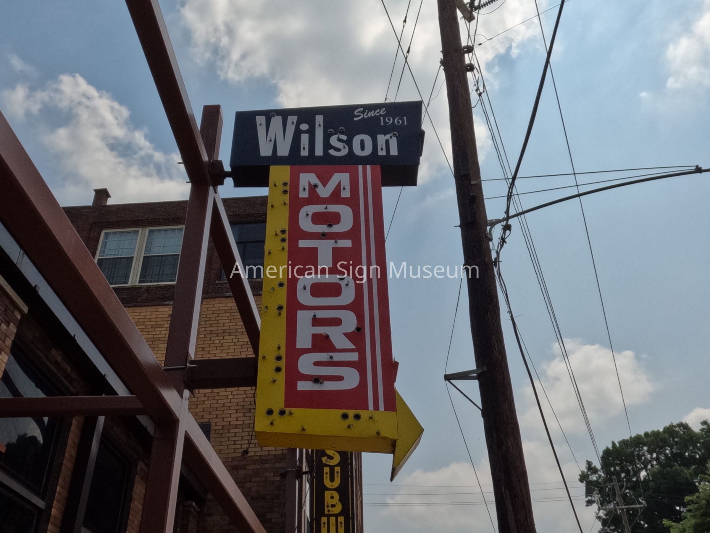 This Wilson Motors sign is another example of the blade-style sign. When first created in about 1961, the sign read ‘Wilson’ in horizontal lettering across the top, and ‘Motors’ read vertically down the sign’s main body. For their 50th anniversary, Wilson Motors had the sign restored and added “since 1961” to the sign’s top banners. The hand-lettered addition added a balanced contrast to the block-font neon lettering. Acquired by the Museum in 2020, the sign underwent repairs to fix the mechanics of the yellow arrow’s flashing which was completed by NeonWorks of Cincinnati.Collection