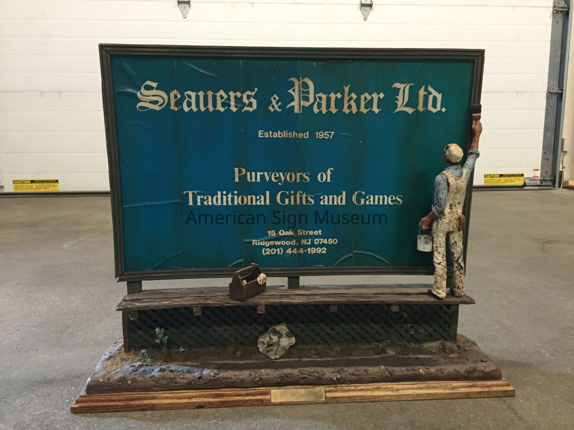 Three-dimensional model of a signpainter painting a billboard for "Seauers & Parker Ltd. - Purveyors of Traditional Gift and Games." Primarily constructed of painted wood and paper that is six individual sheets.Type of Sculpture