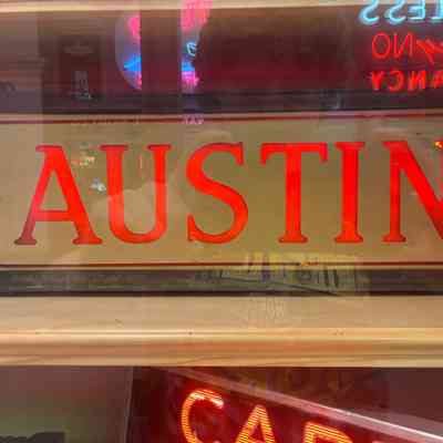 Internally illuminated and made through the reverse glass technique, AUSTIN reads in red lettering on a beige background. The outer cabinet is made from metal.Collection