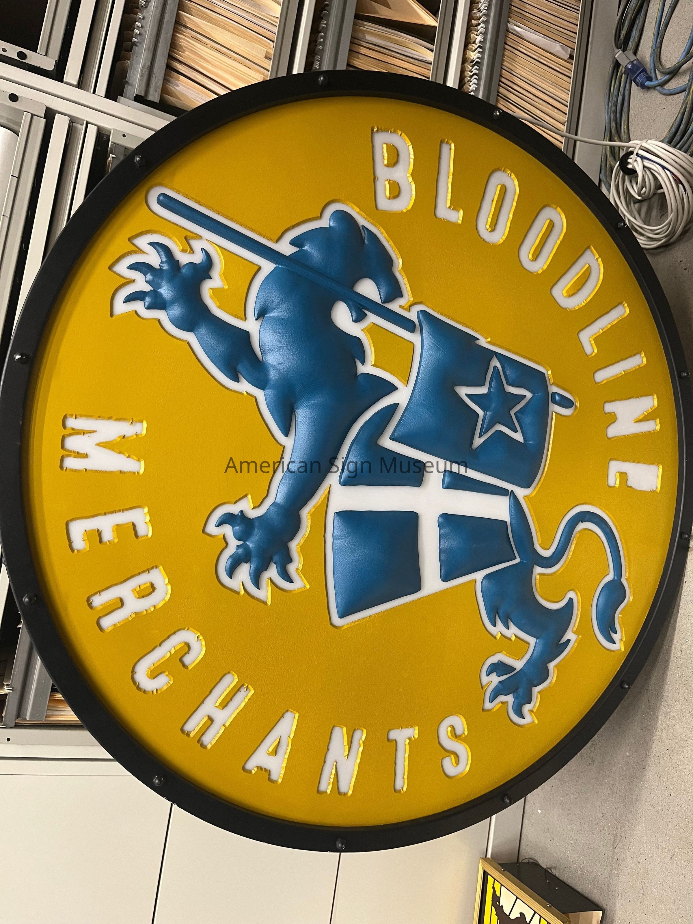 Double-faced internally illuminated plastic sign reading 'Bloodline Merchants' with a lion-like figure in the center.Collection