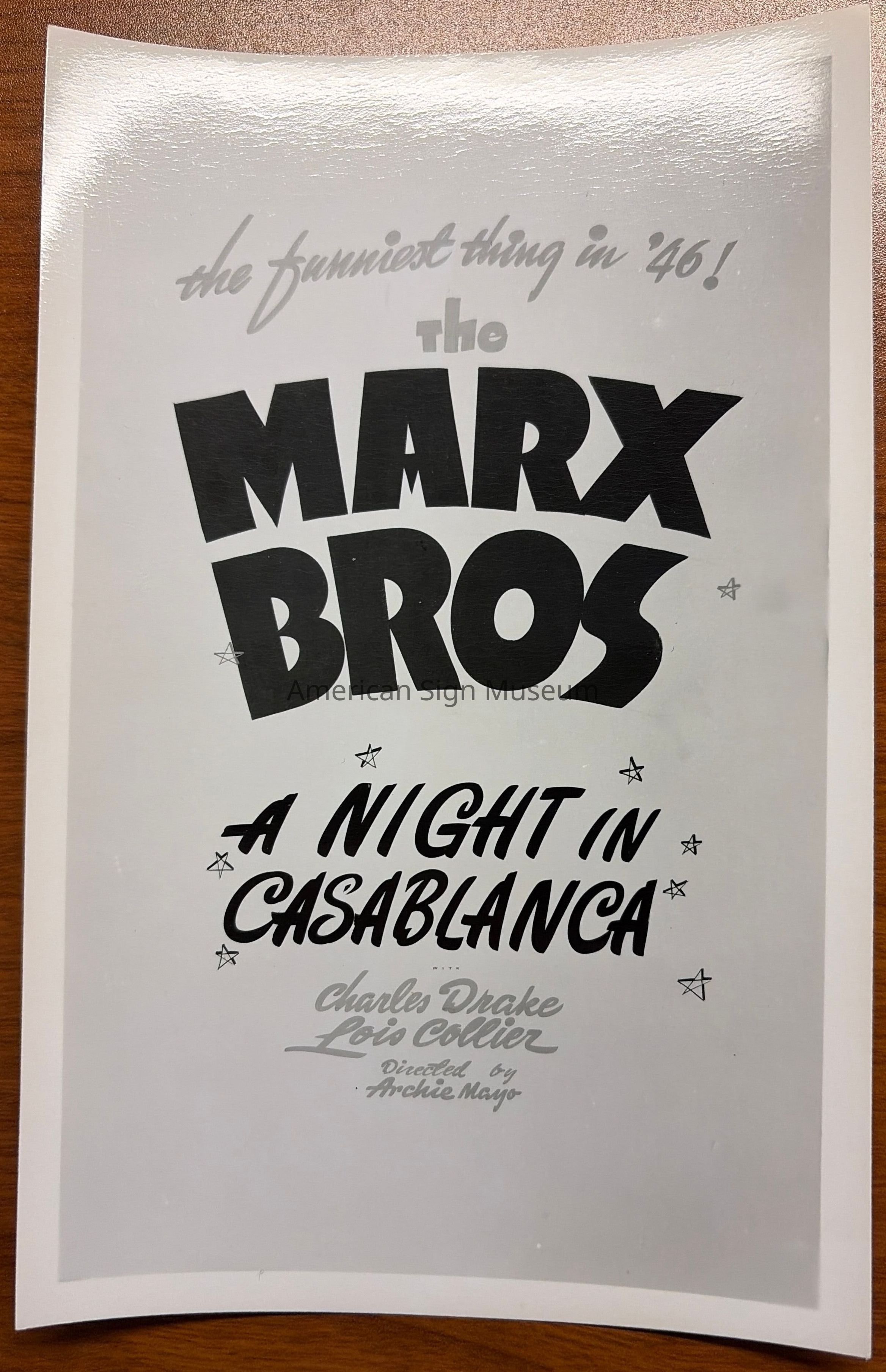 Black and white photograph of a show card reading "the funniest thing in '46! The Marx Bros A Night in Casablanca with Charles Drake Lois Collier Directed by Archie Mayo". Made by Don SturdivantCollection